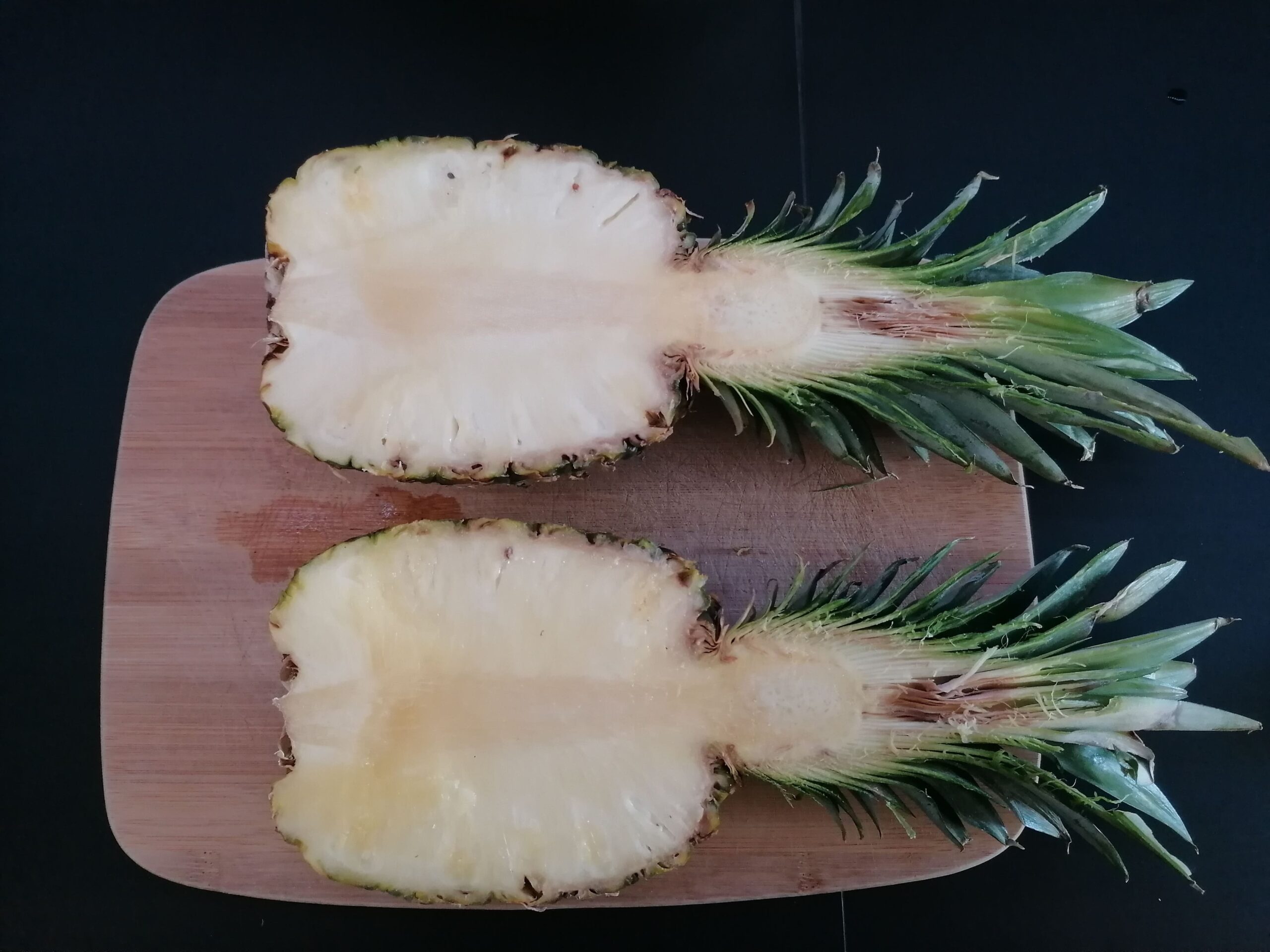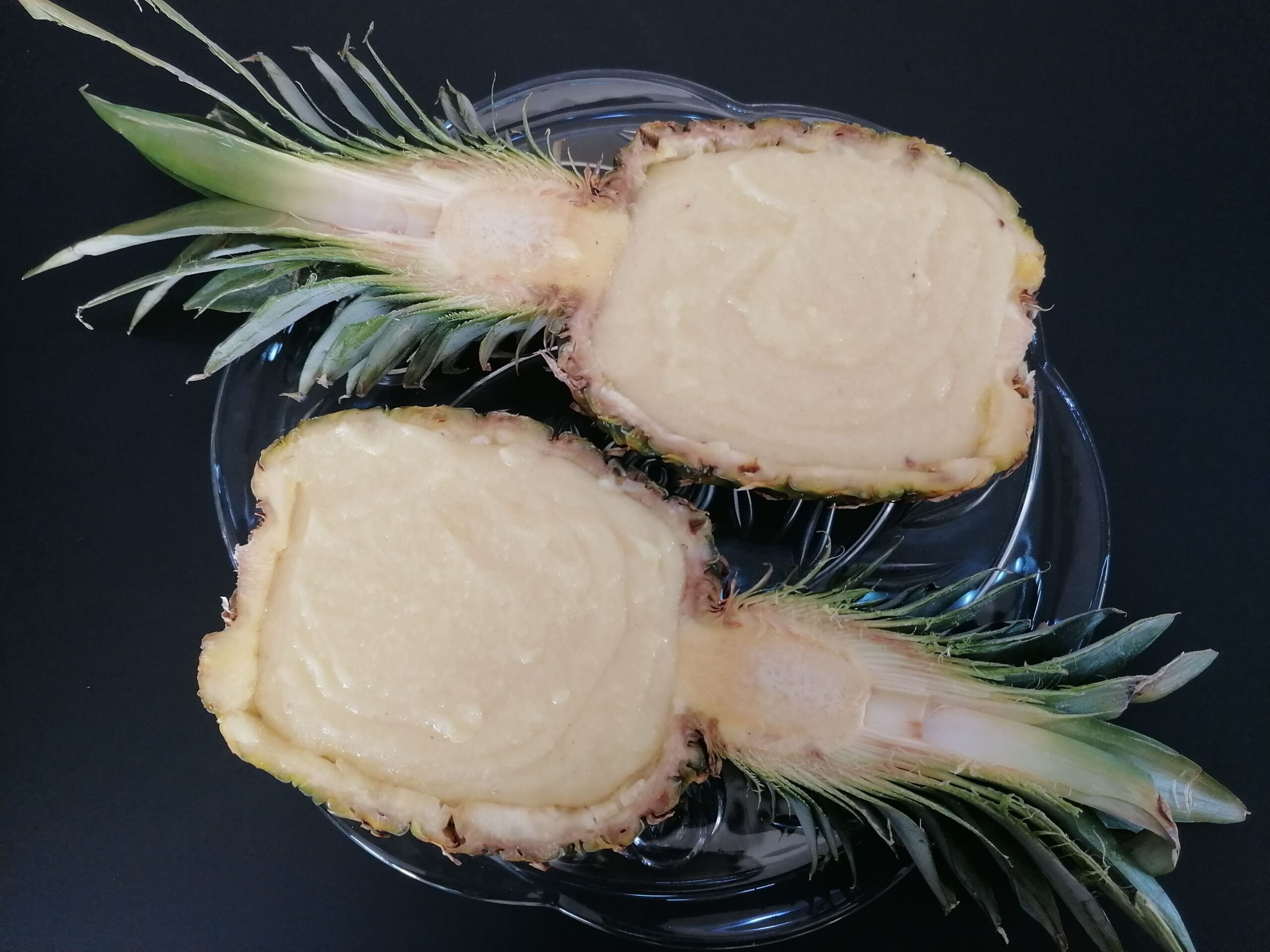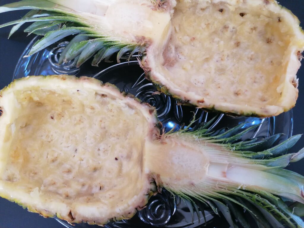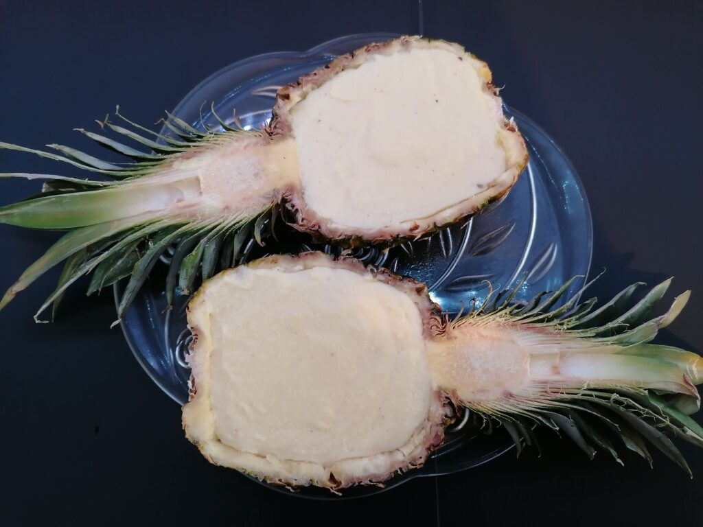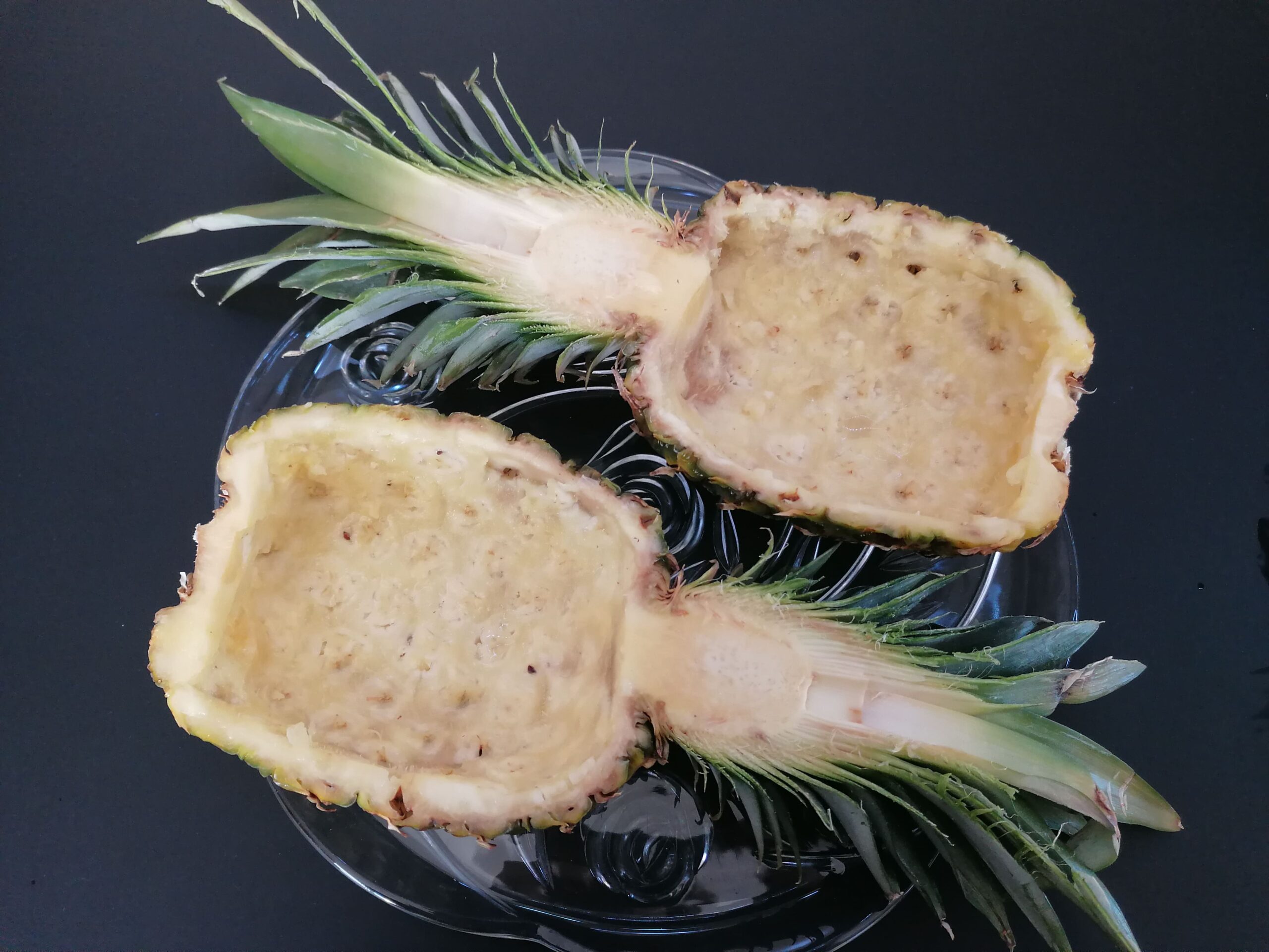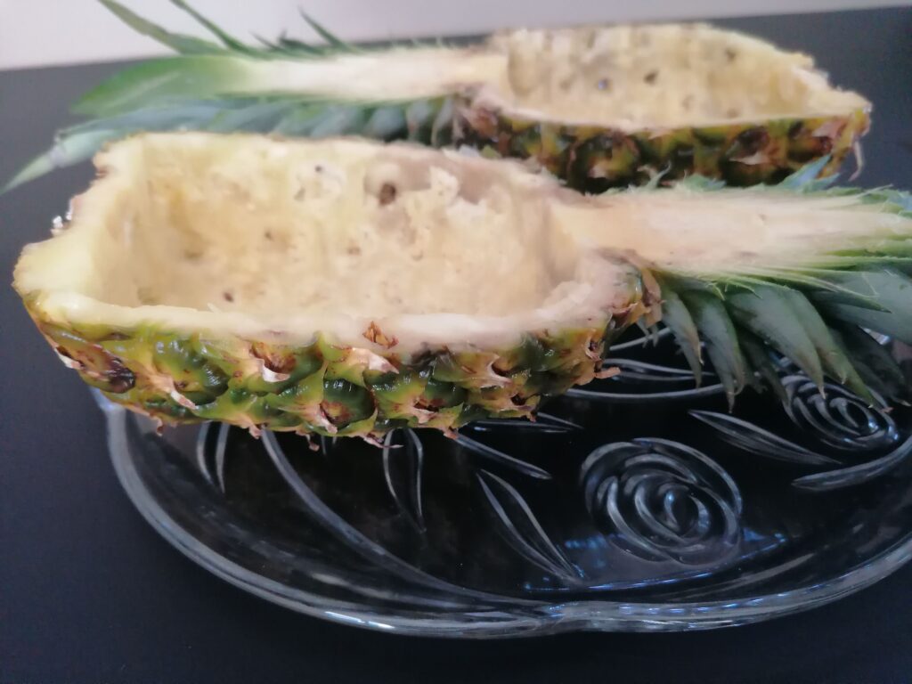 - Placer, si nécessaire, les demi-ananas sur un nouveau support, cette fois-ci de présentation, puis présenter et déguster !
