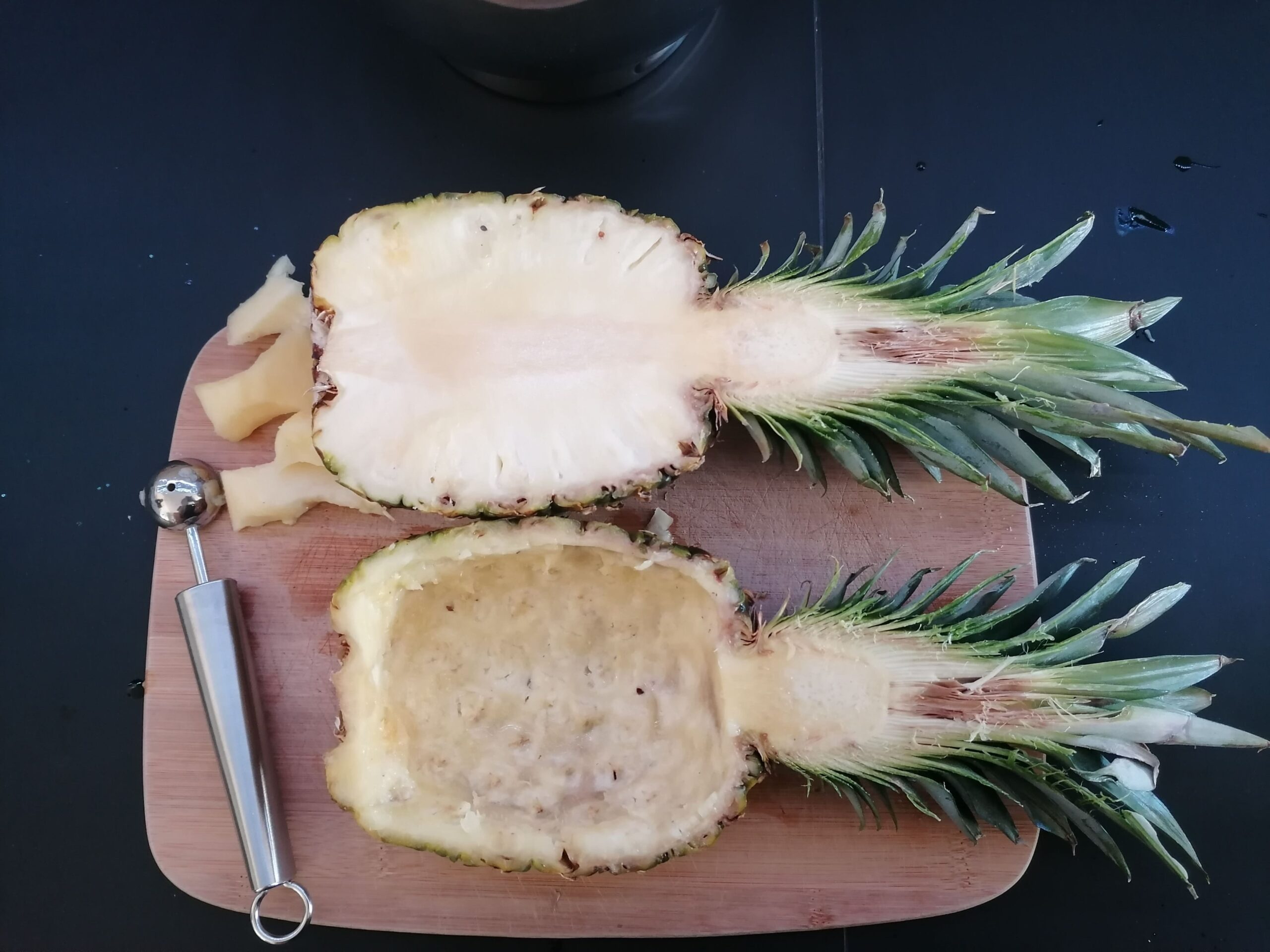 - retirer la chair de ce dernier à l’aide, par exemple et comme cela a été le cas ici, d’une cuillère parisienne, en creusant, jusqu’à la peau, de part et d’autre des deux côtés de la ligne centrale du fruit, partie alors plus dure et non comestible d’un ananas qu’il faudra éliminer par la suite ;
