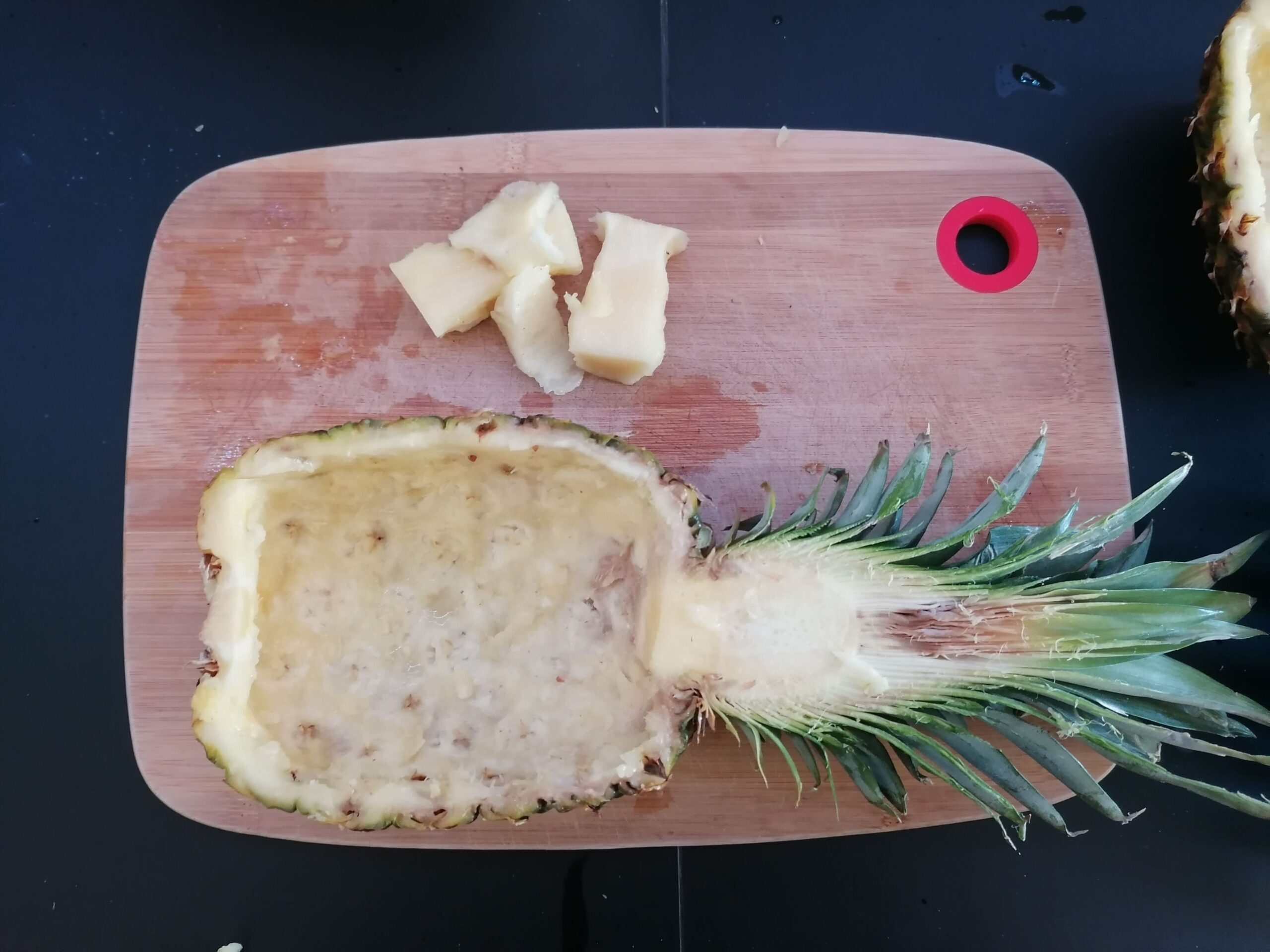 - finir par récupérer, à la cuillère parisienne, le reste de la chair, sous cette partie dure ainsi ôtée, mais aussi toute celle qui resterait dans le demi-ananas.