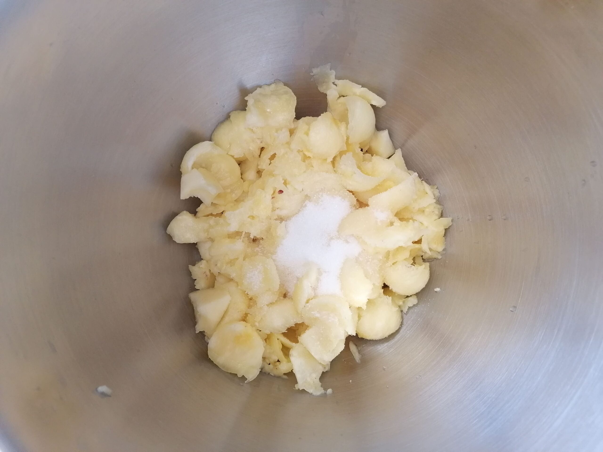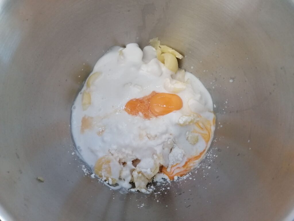 - Dans le cul-de poule, ou le bol du robot mixeur, contenant la chair d’ananas, ajouter les jaunes d’œufs, le sucre semoule, la poudre à crème, la crème de coco ainsi que le rhum.