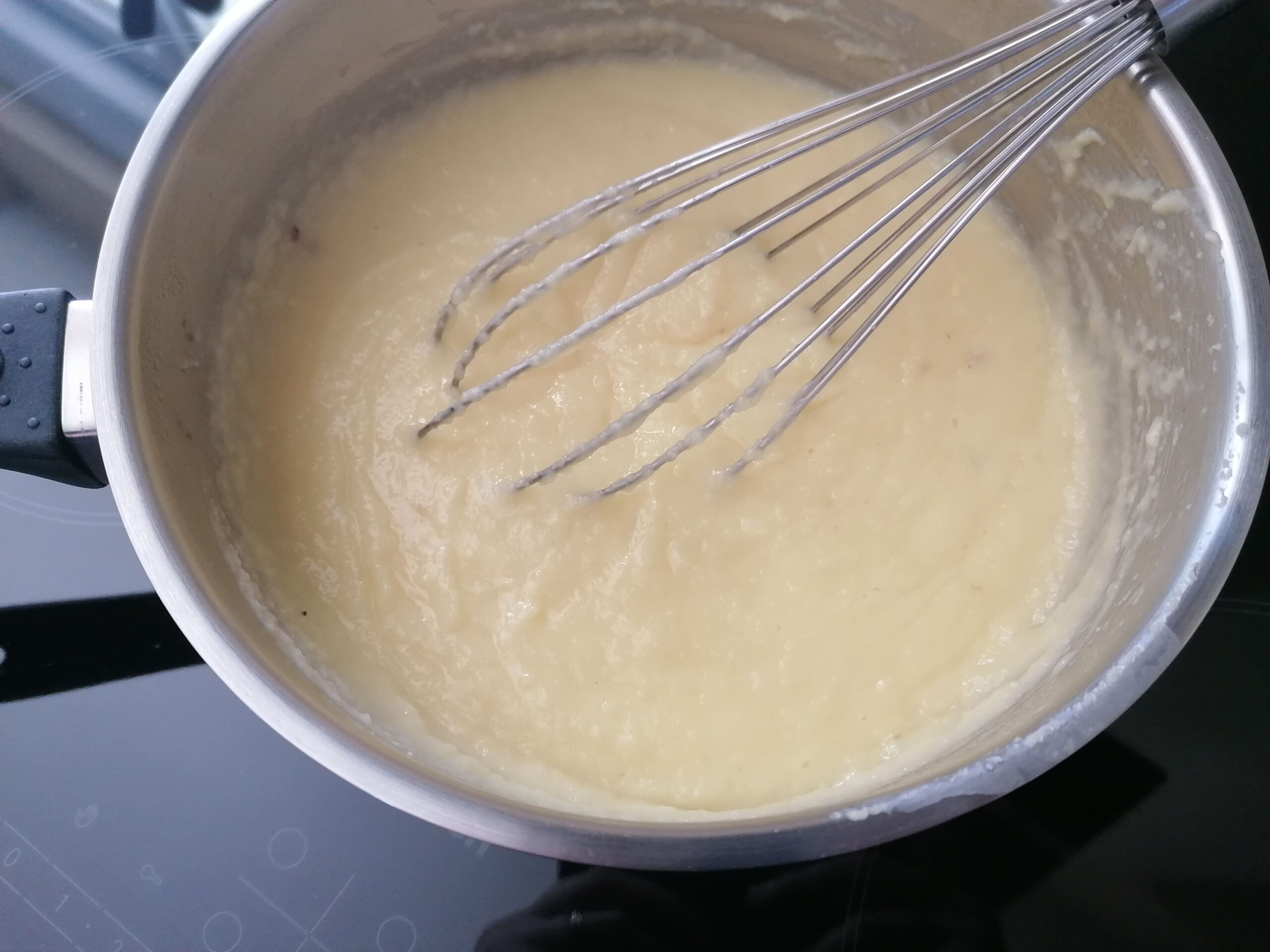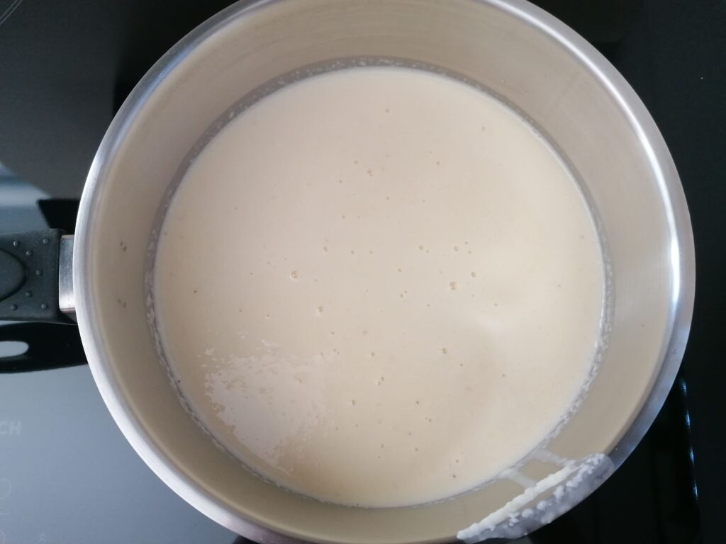 - Chauffer cette dernière sur feu doux, et en remuant constamment au fouet, ceci afin d’éviter à la préparation d’accrocher au fond de l’ustensile et/ou d’obtenir de grumeaux, jusqu’à épaississement de la crème et à la vue du premier « plop » puis poursuivre la cuisson durant 2 min pour une pasteurisation de cette dernière.