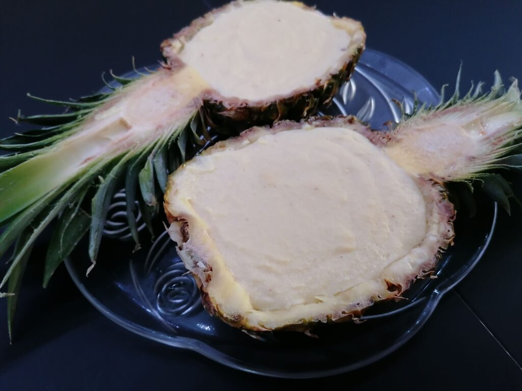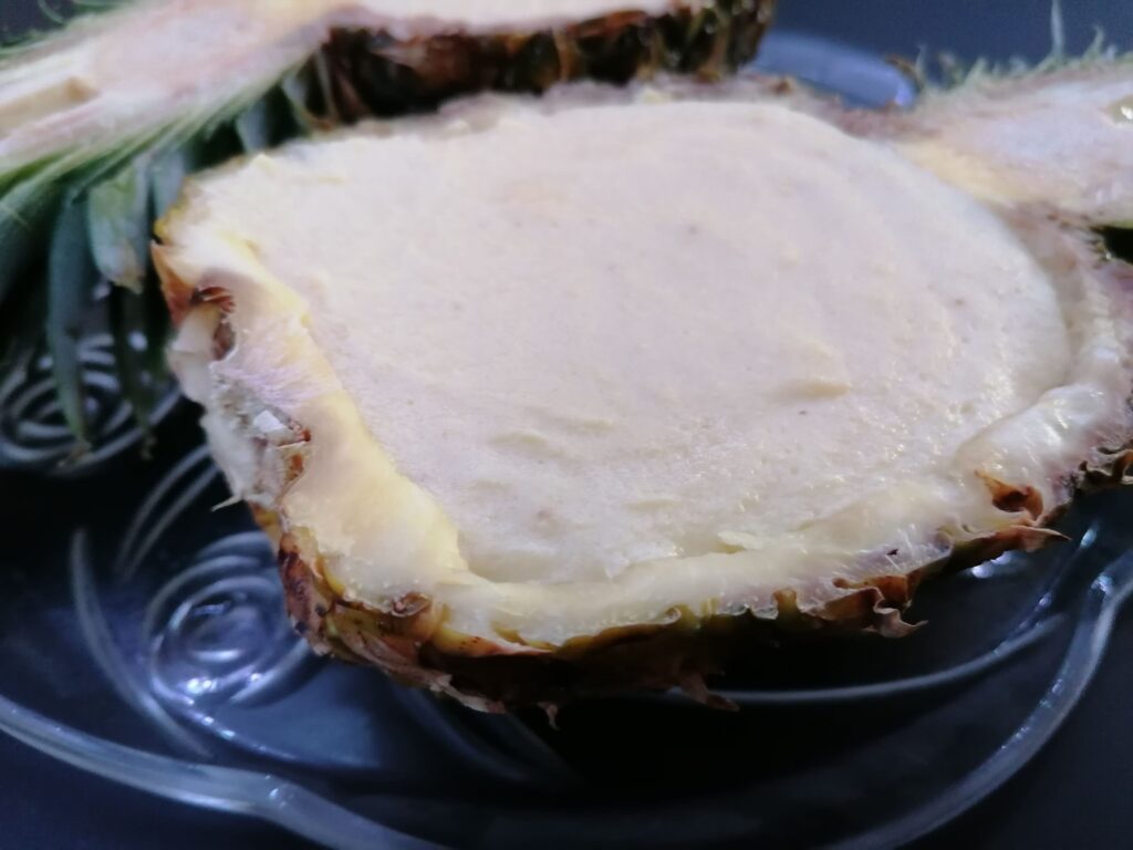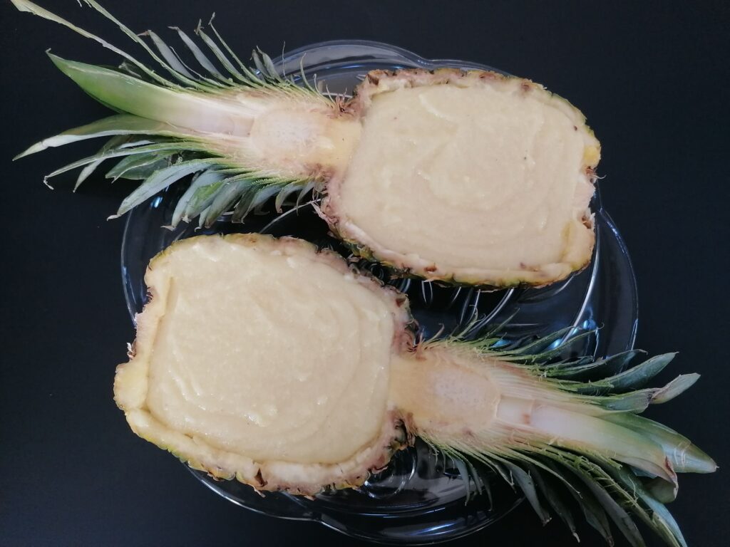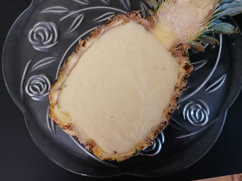 - Verser de suite cette crème, encore chaude et suffisamment liquide, la rendant alors plus facile à couler et à lisser uniformément dans des fonds, dans les demi-ananas laissées de côté, à température ambiante.