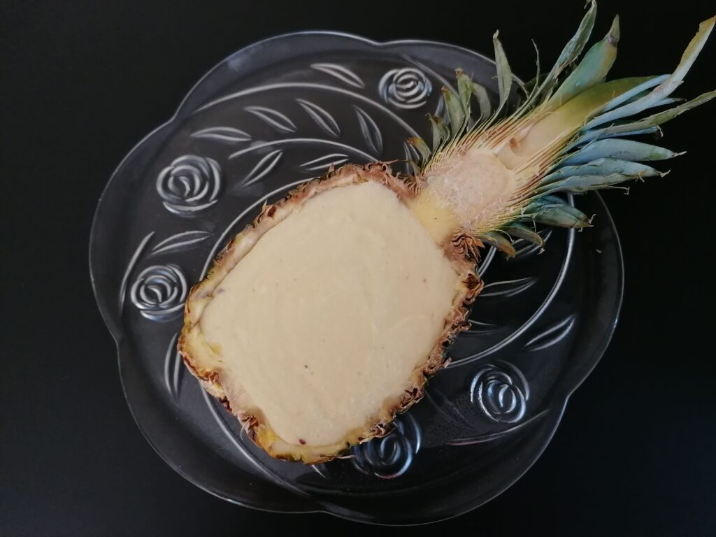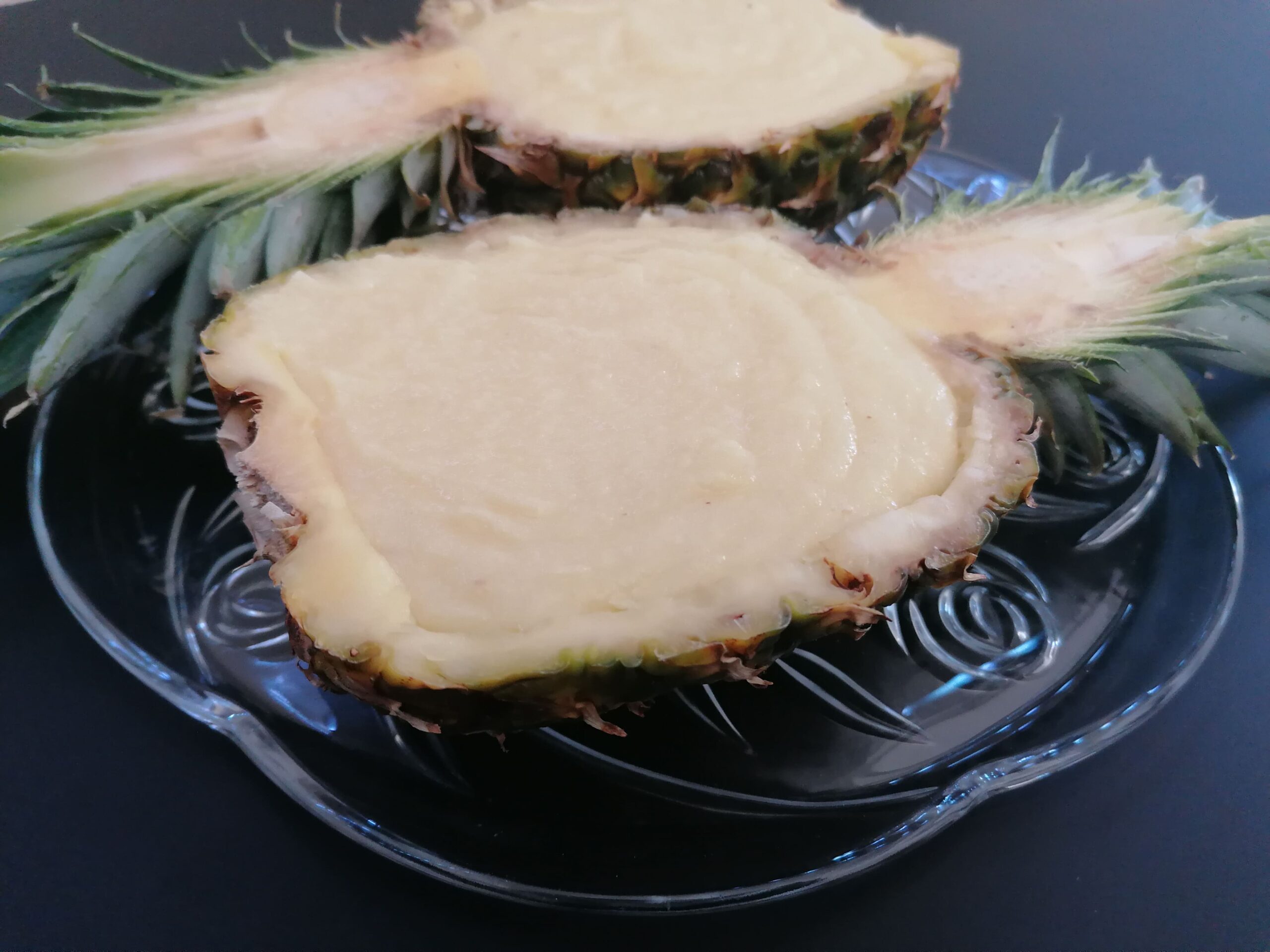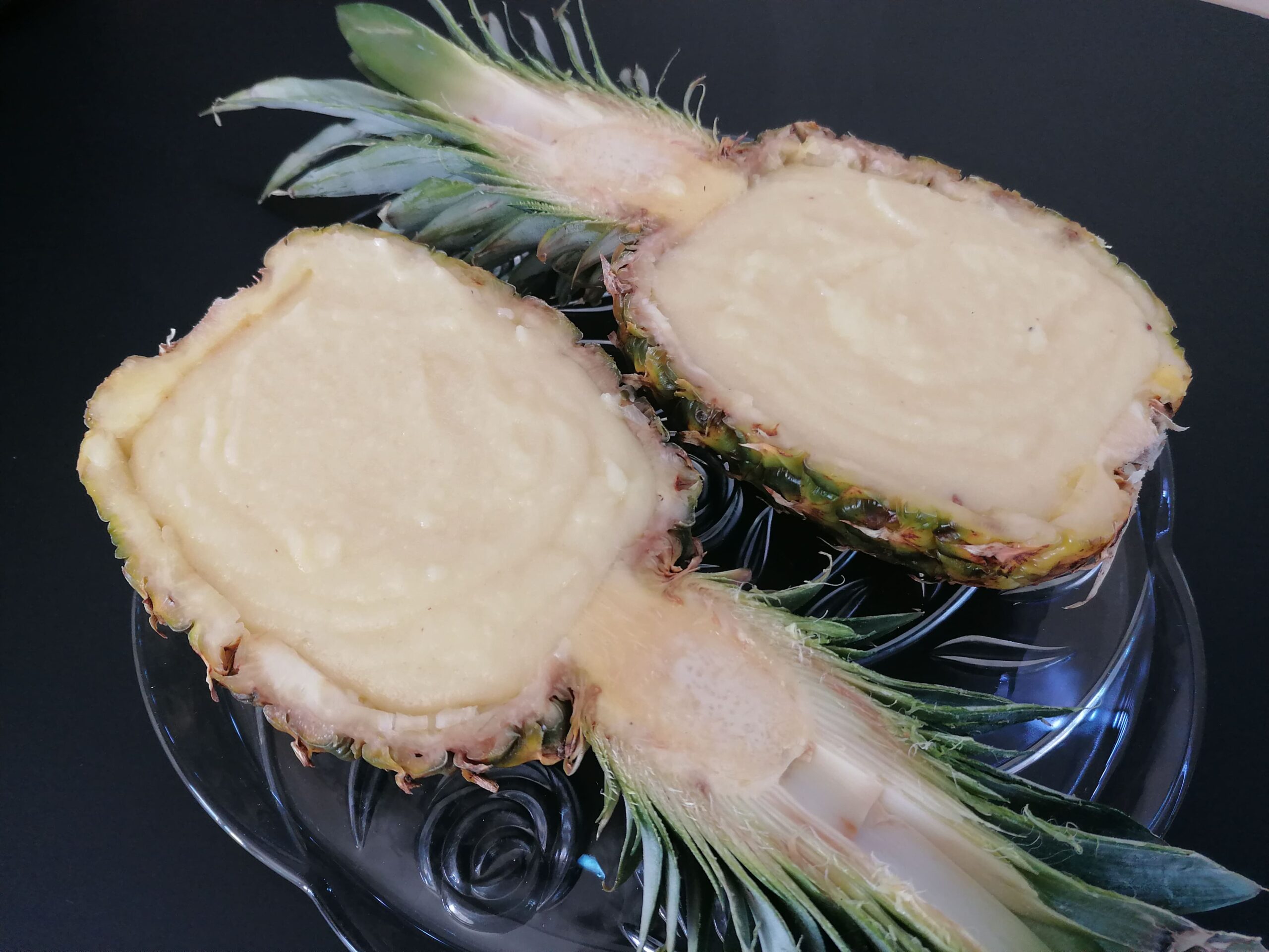 - Verser de suite cette crème, encore chaude et suffisamment liquide, la rendant alors plus facile à couler et à lisser uniformément dans des fonds, dans les demi-ananas laissées de côté, à température ambiante.
