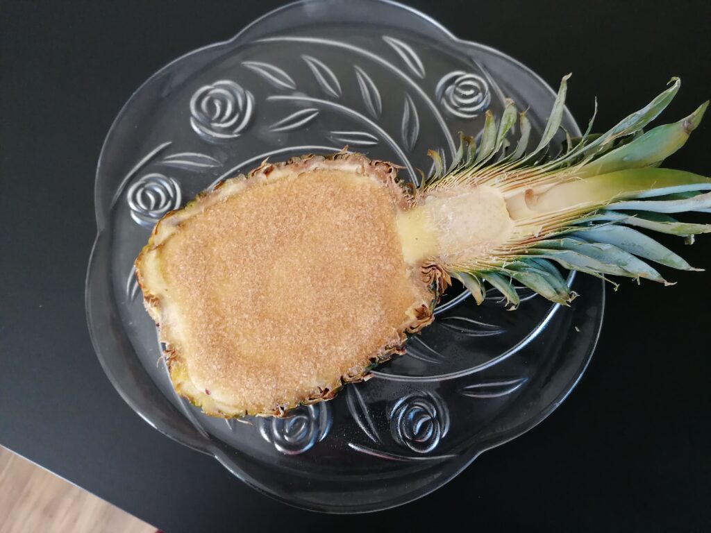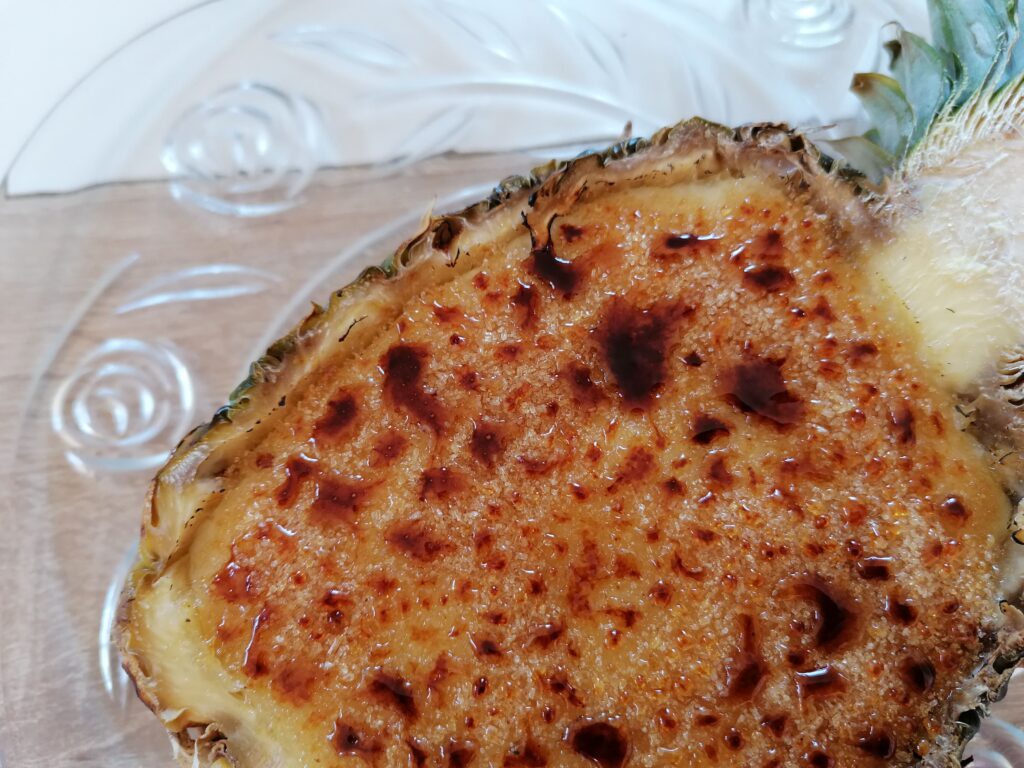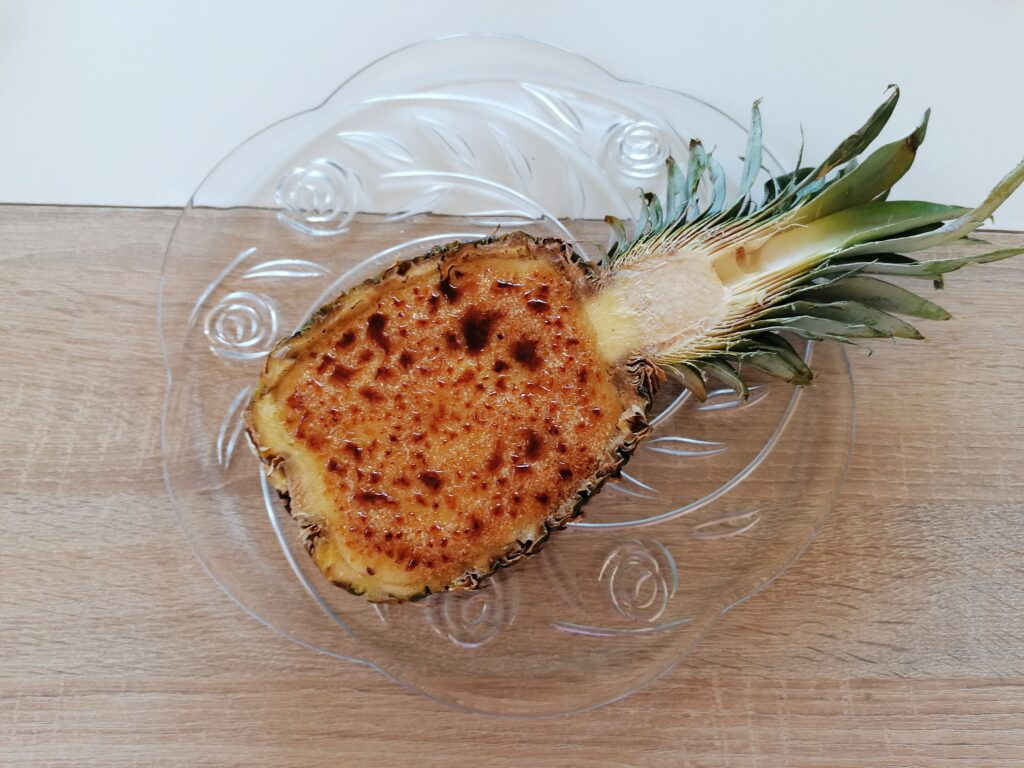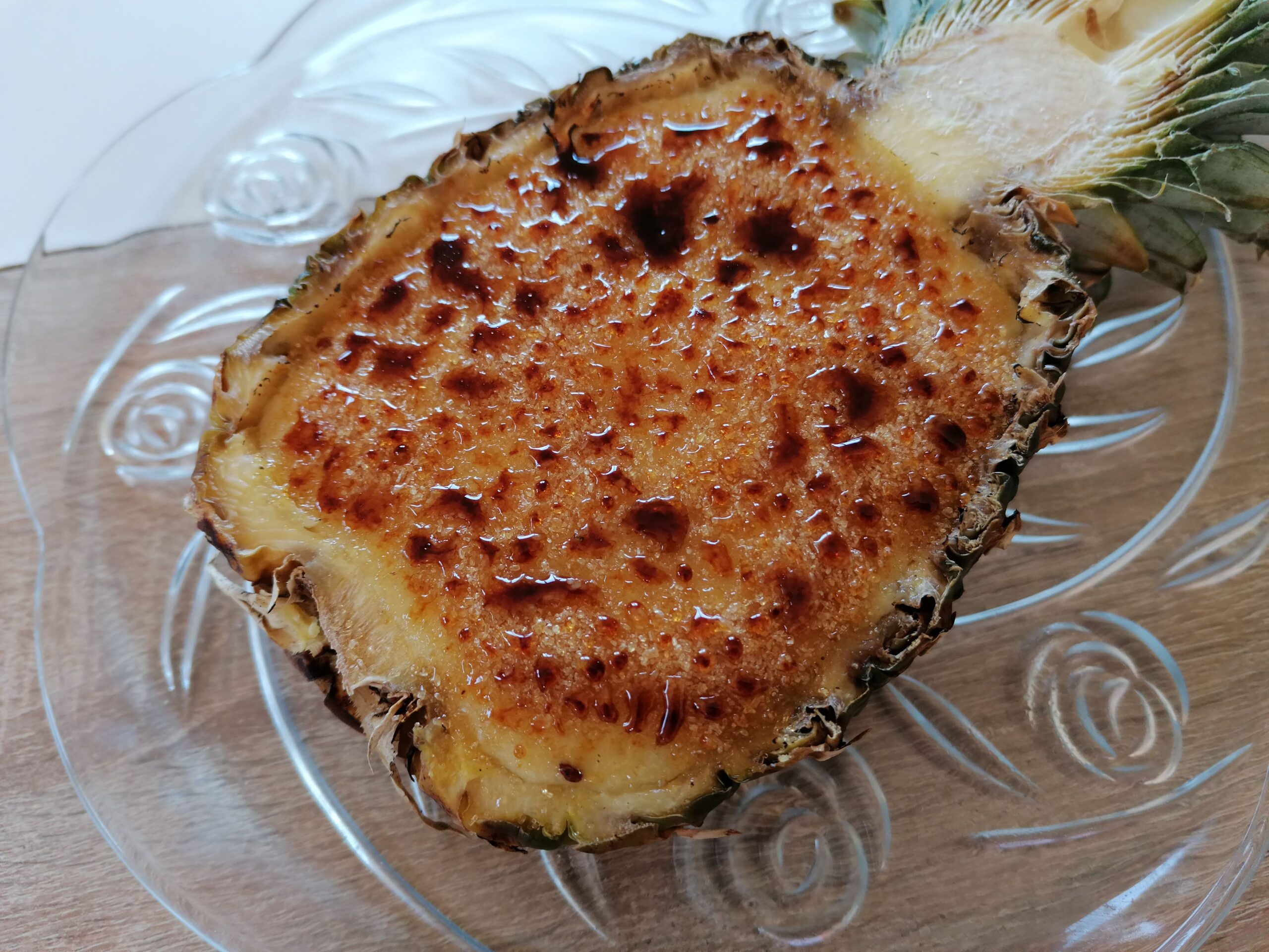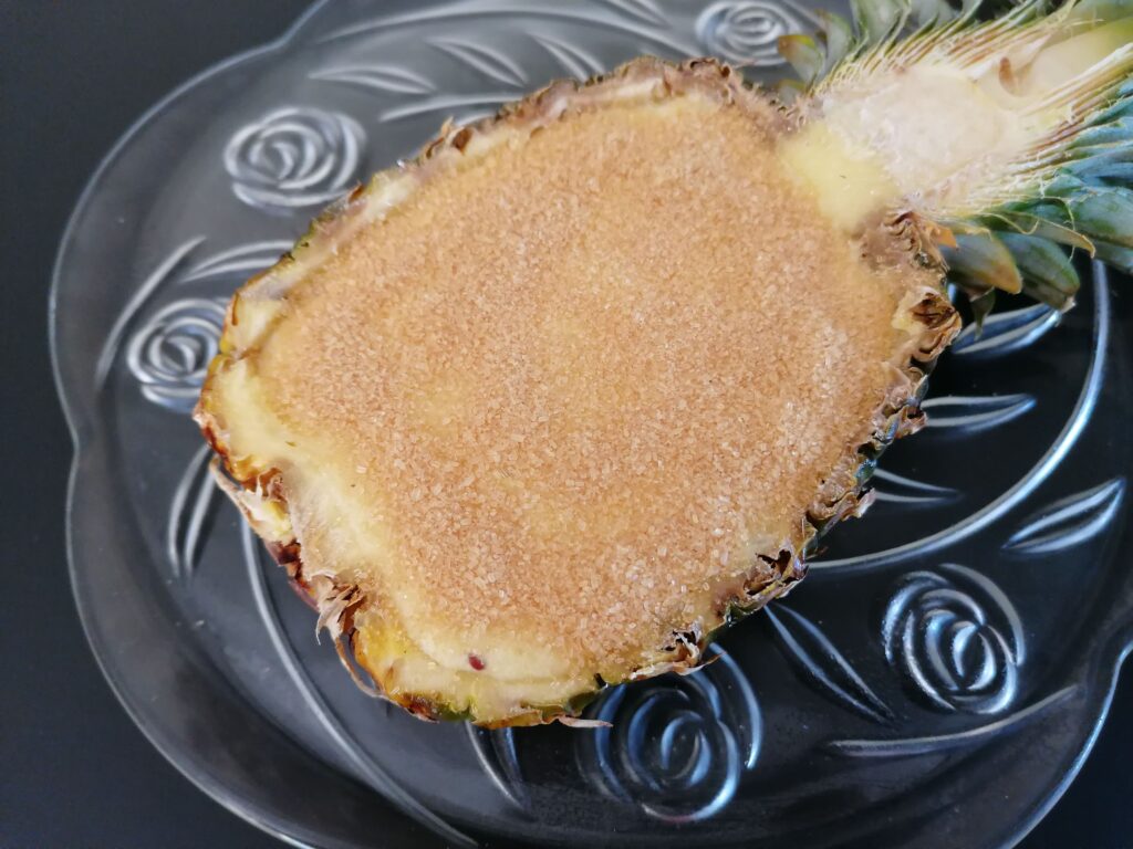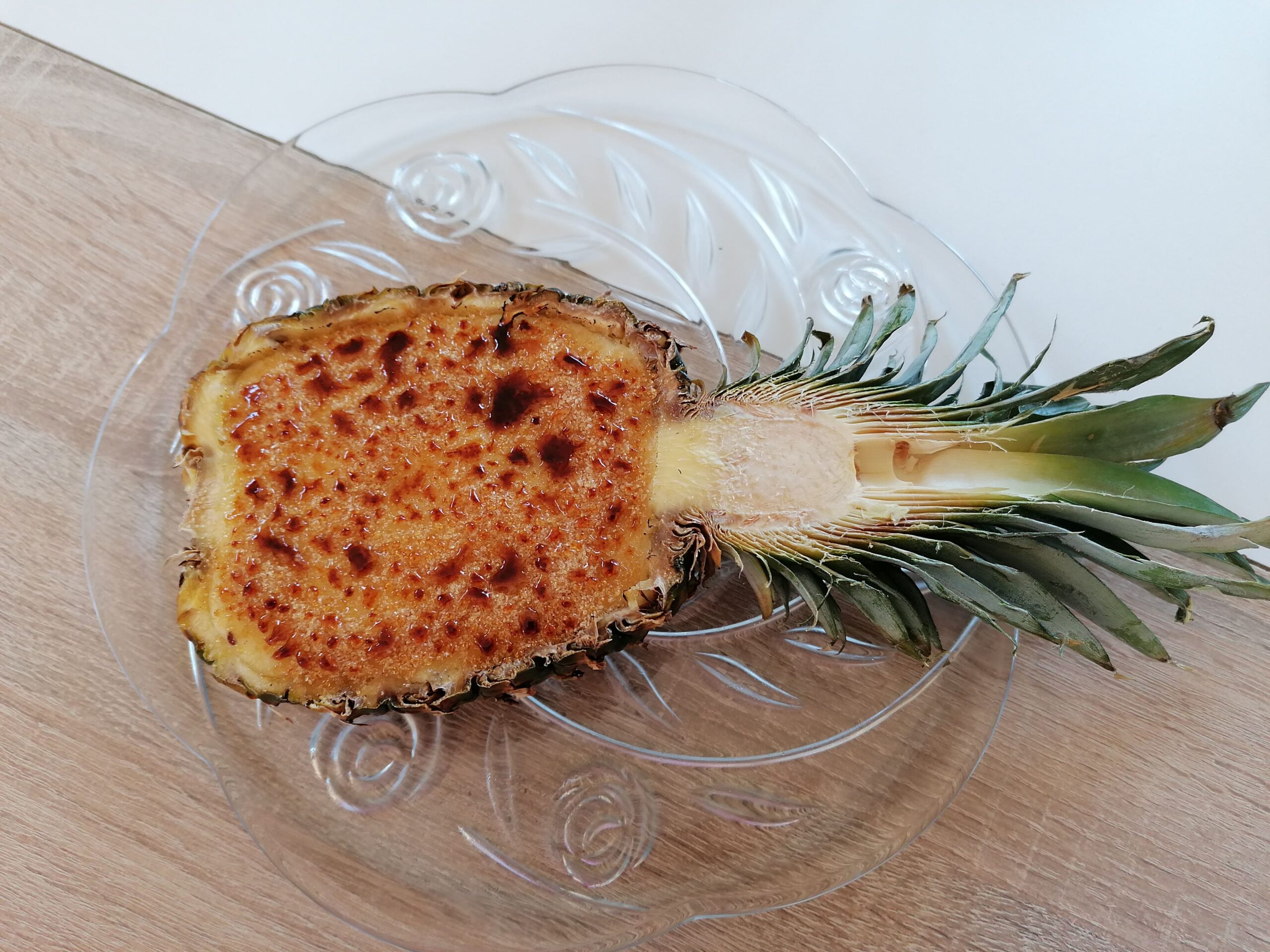- Au dernier moment, soit à la dégustation, récupérer le nombre de demi-ananas à présenter, parsemer généreusement leur surface de cassonade puis caraméliser le tout au chalumeau pour justement avoir cette différence chaud / froid, mais sans excès toutefois pour ne pas obtenir un caramel amer, puisque plus sa couleur deviendra foncée, plus son goût sera amer !