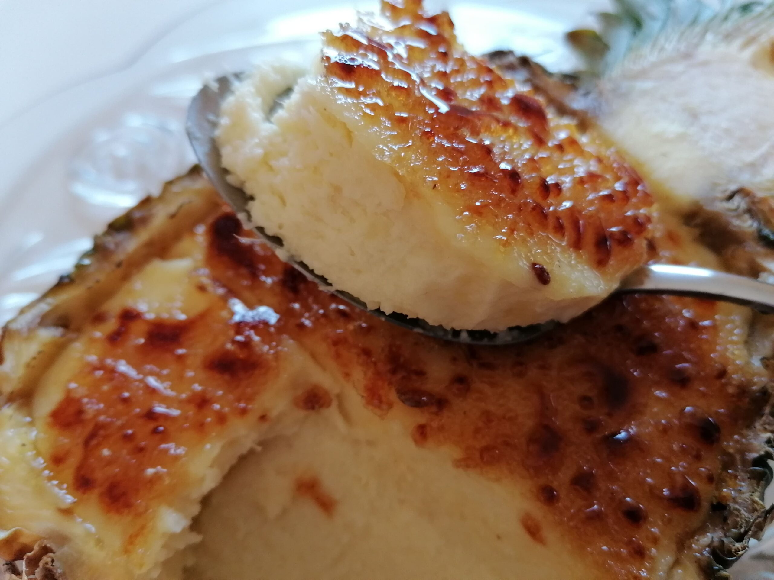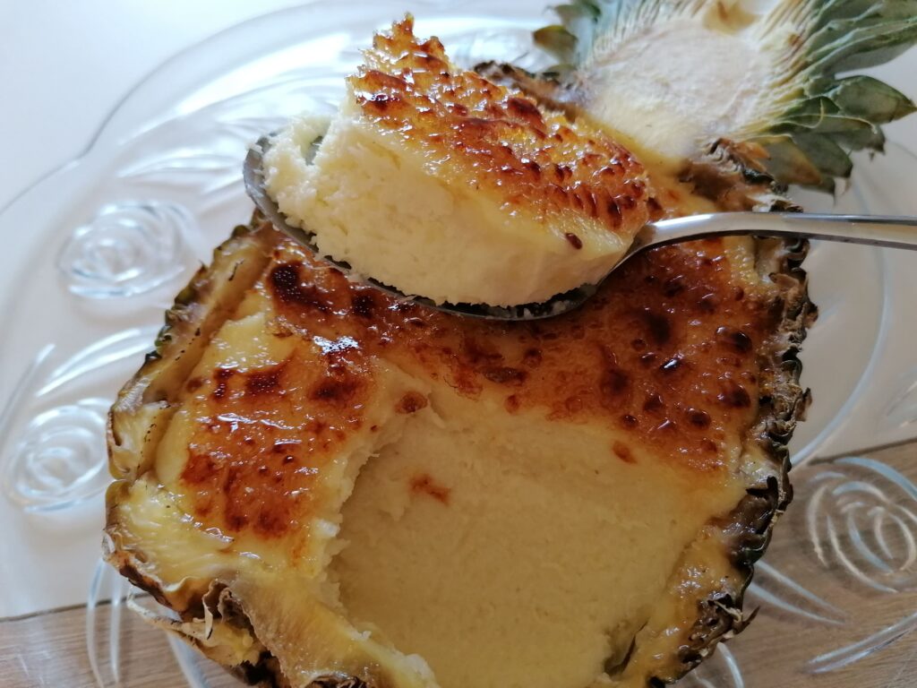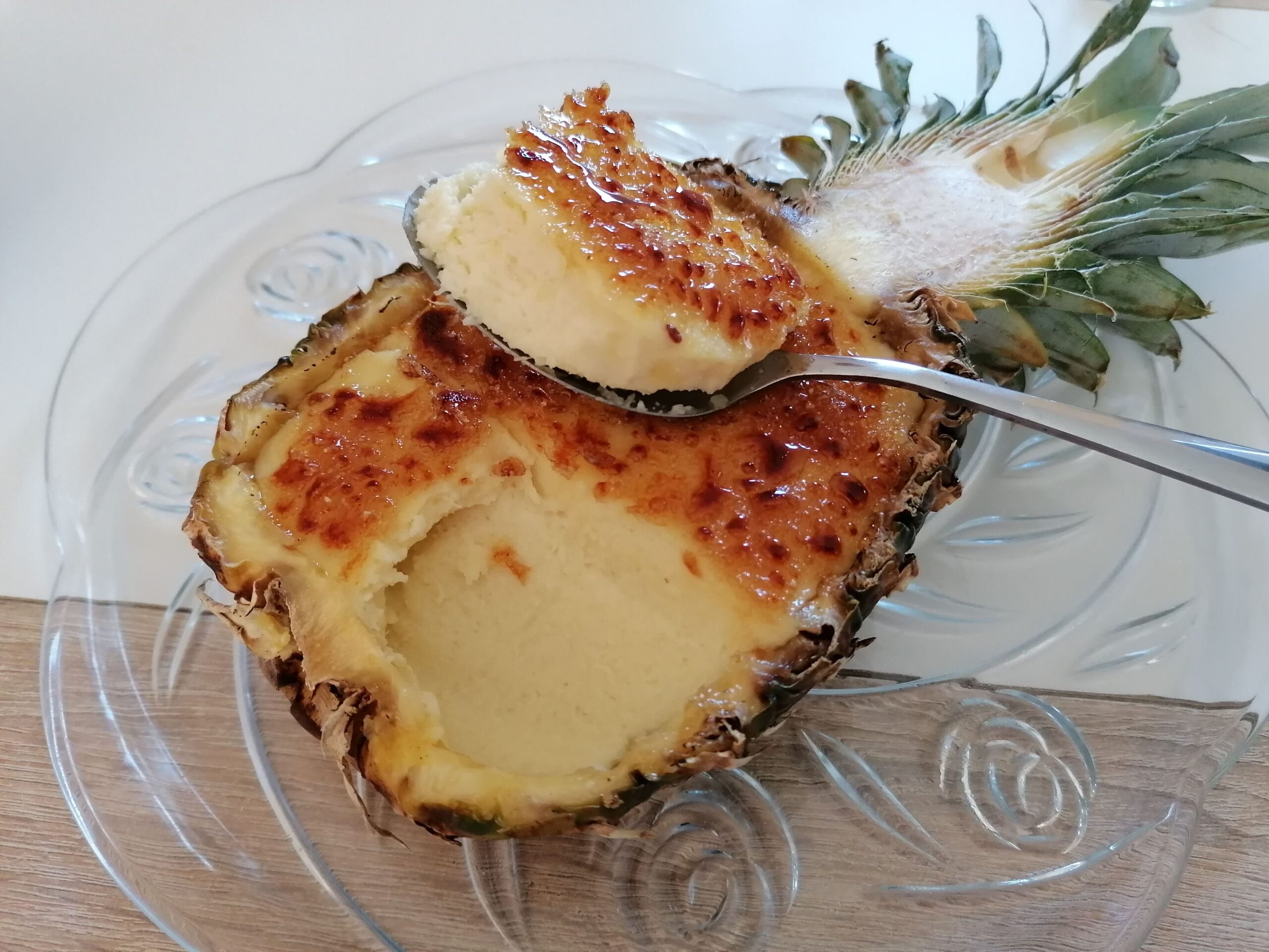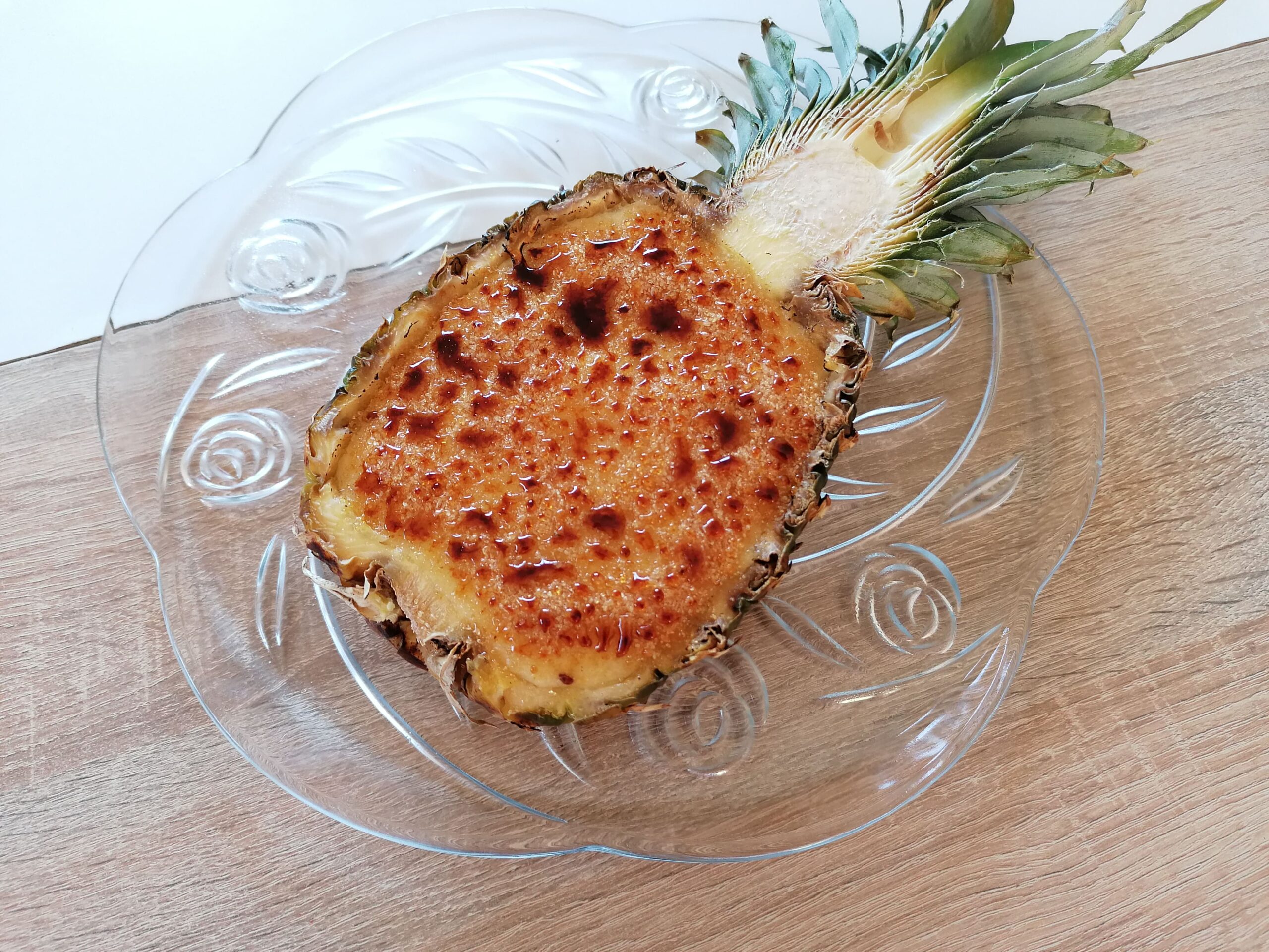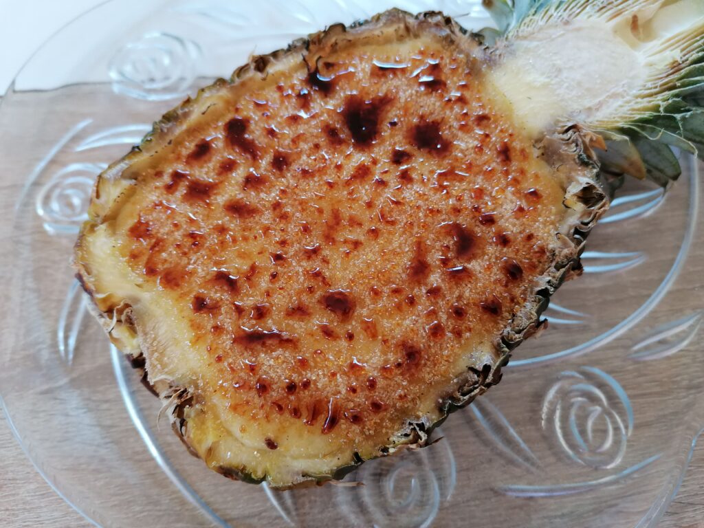 - Au dernier moment, soit à la dégustation, récupérer le nombre de demi-ananas à présenter, parsemer généreusement leur surface de cassonade puis caraméliser le tout au chalumeau pour justement avoir cette différence chaud / froid, mais sans excès toutefois pour ne pas obtenir un caramel amer, puisque plus sa couleur deviendra foncée, plus son goût sera amer !