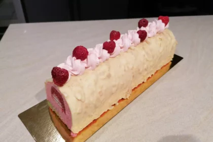 Pour 1 moule à bûche de 30 x 8 x 6,5 cm Pour 1 bûche de 8 personnes Ingrédients Insert framboises Biscuit madeleine pistaches Croustillant …