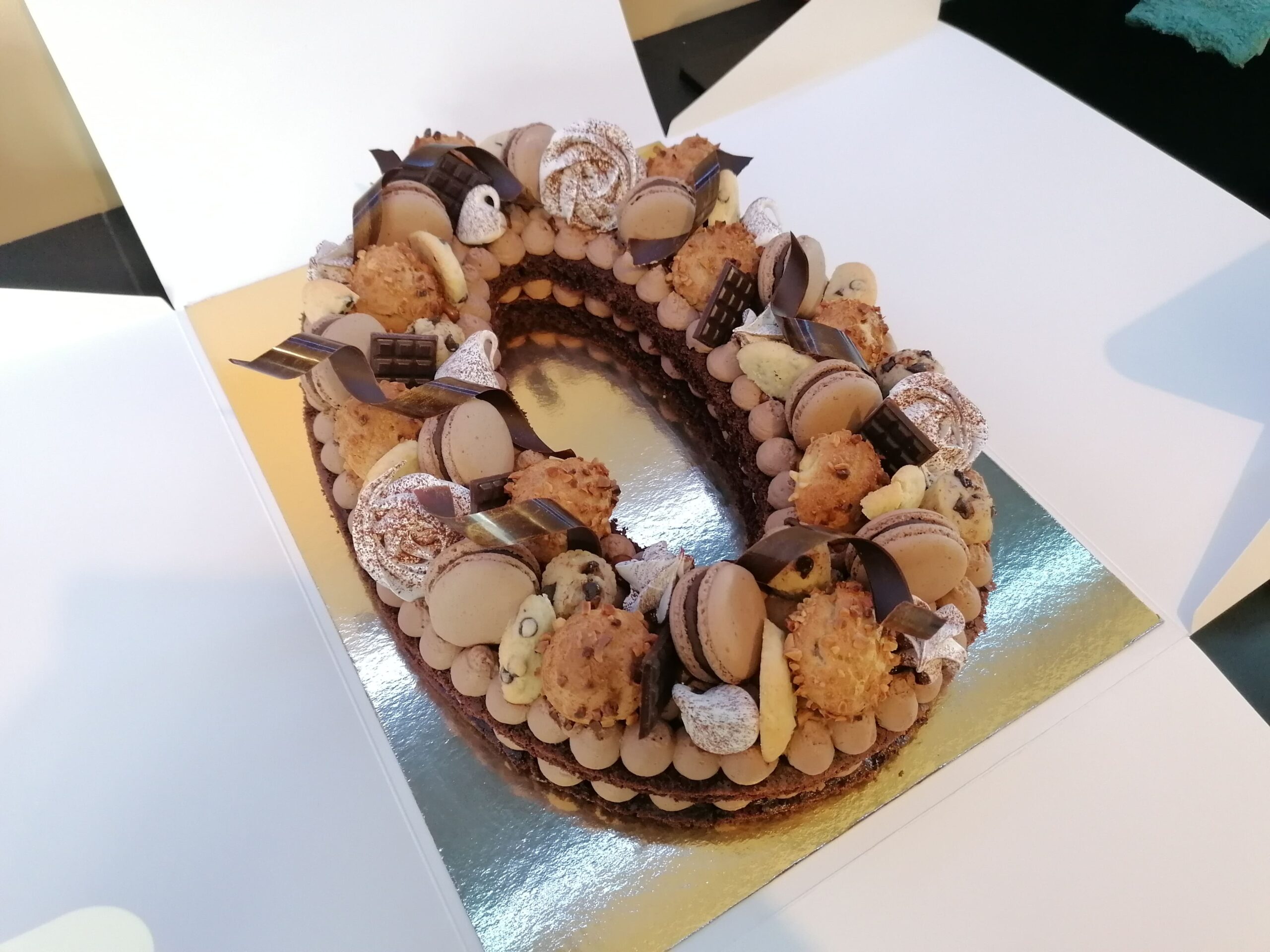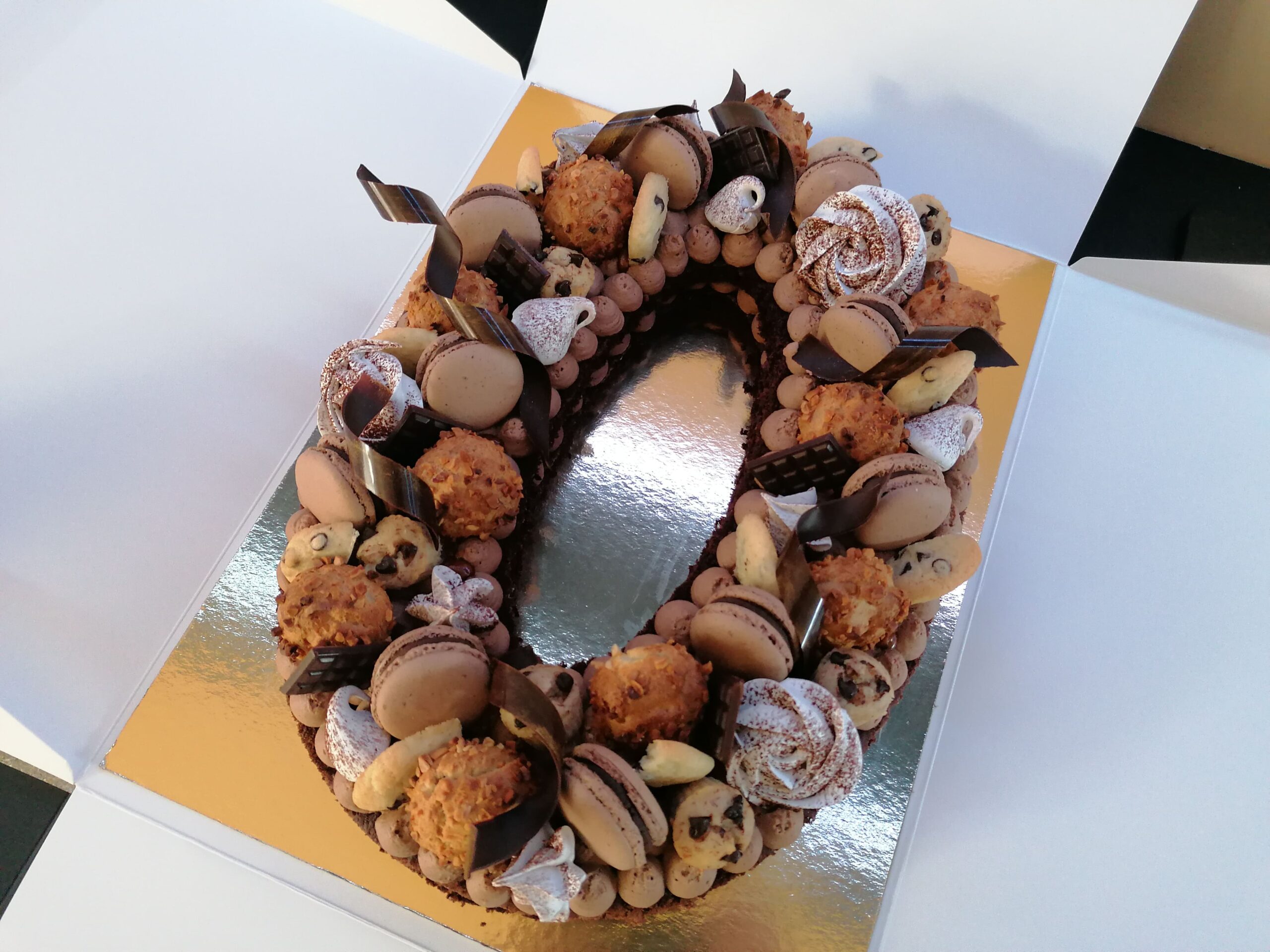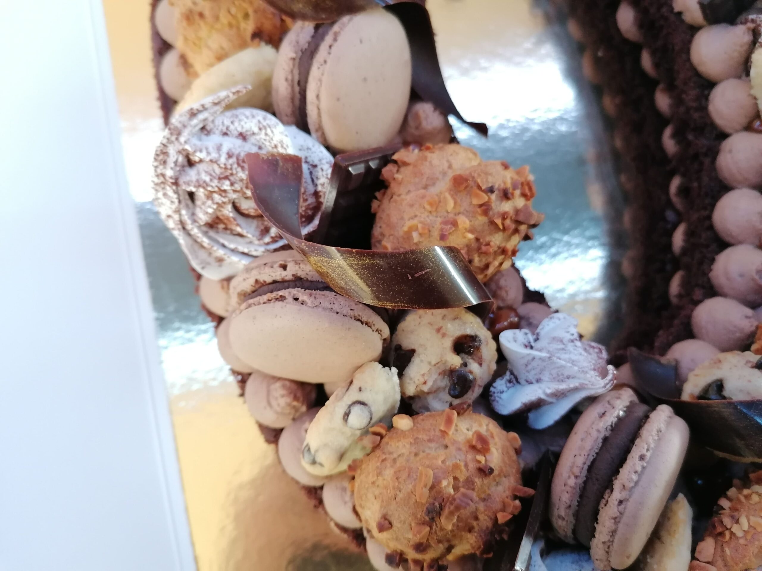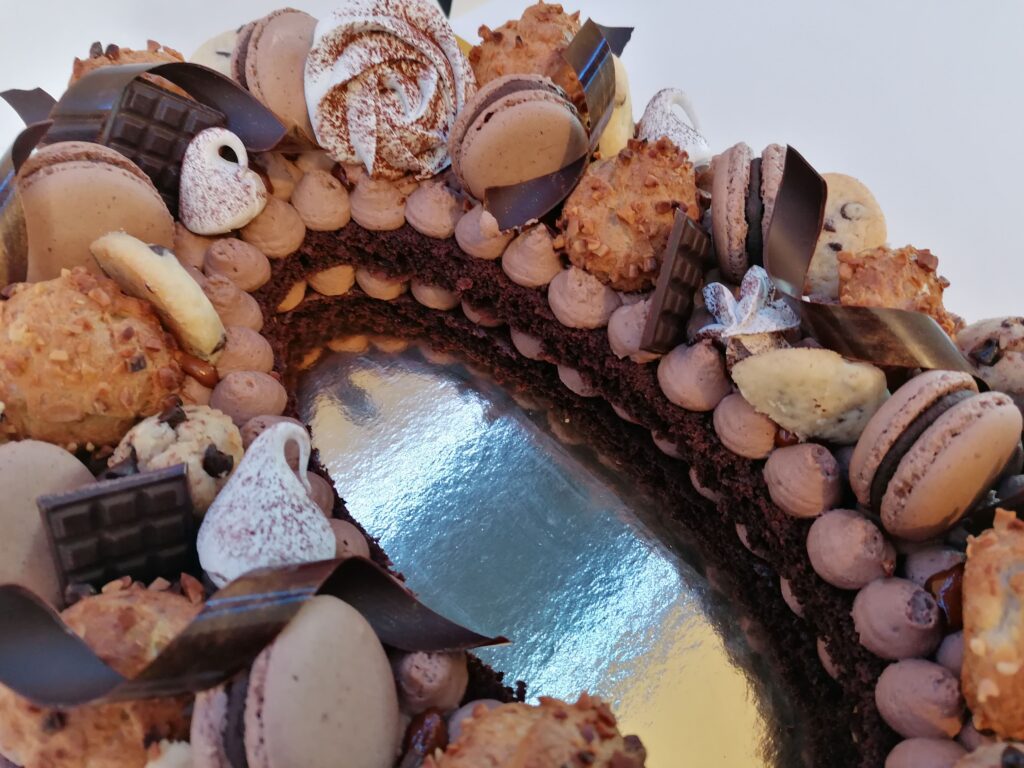 - décor final : macarons chocolat au lait, choux amandes chocolat et vanille, biscuits étoiles choco fourrés ganache chocolat noir, spritz vanille & décors chocolat au lait dorés (serpentins)