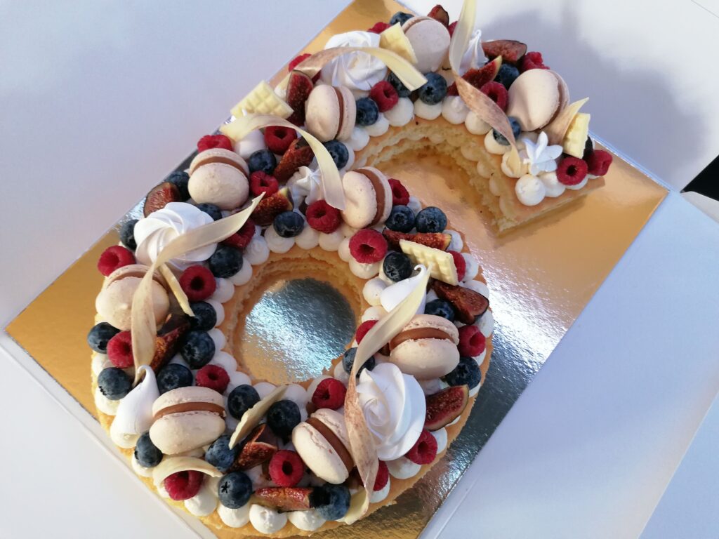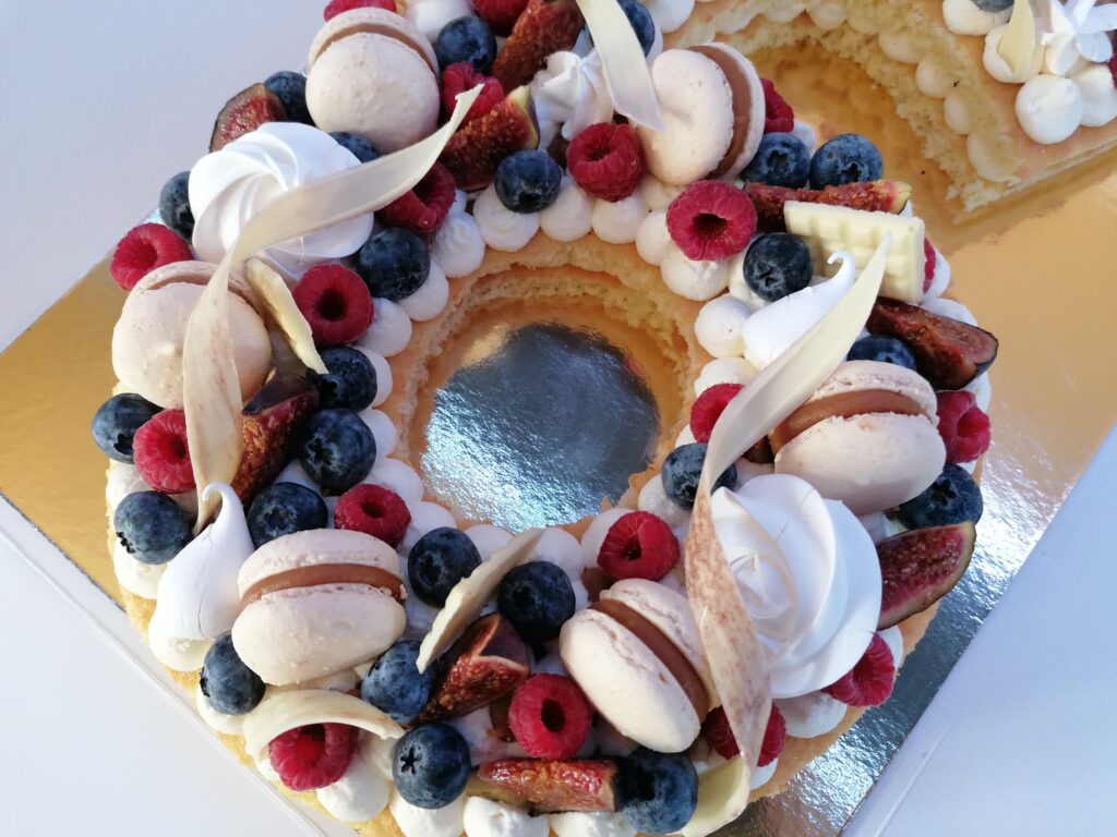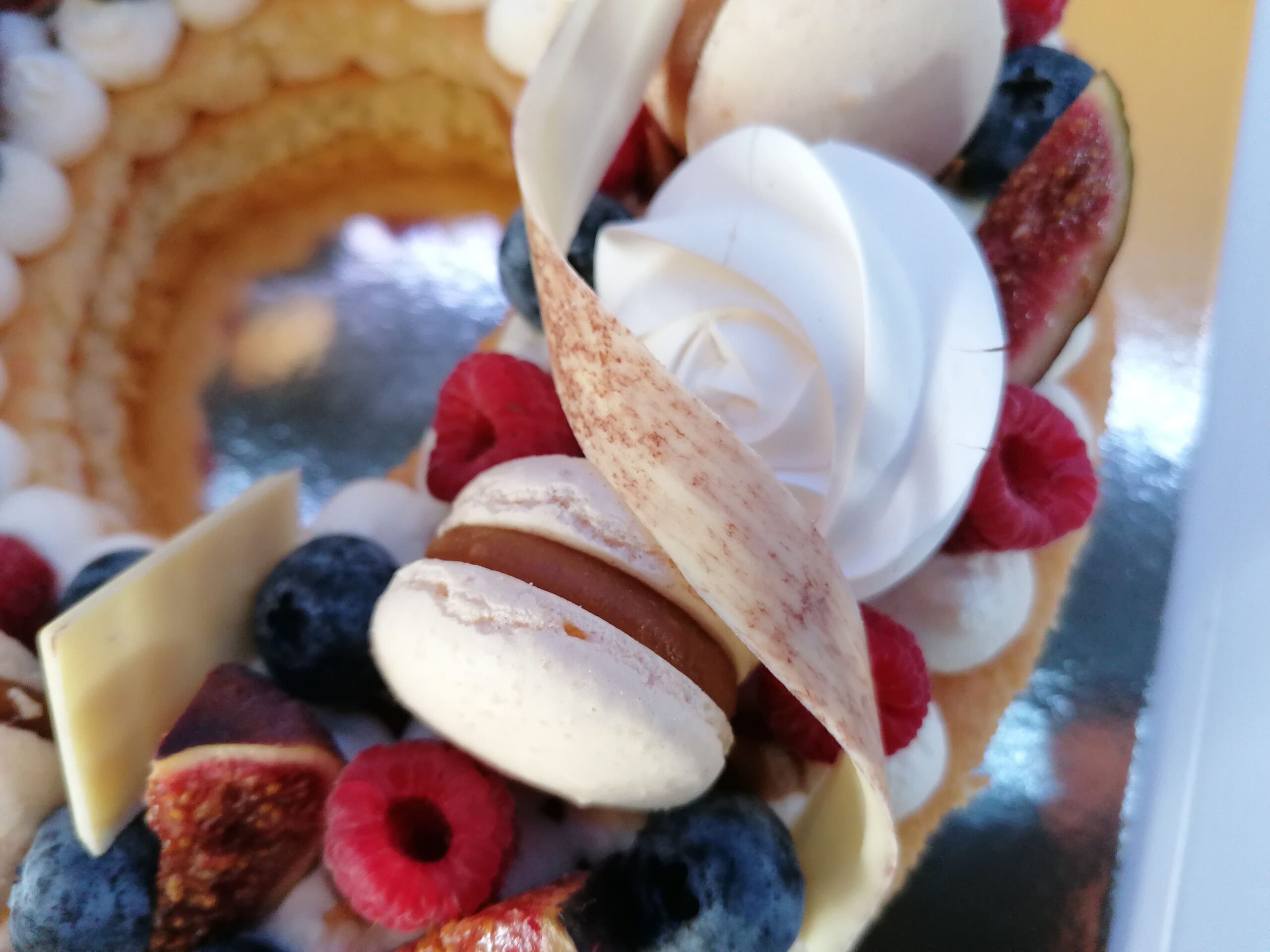 - décor final : macarons caramel beurre salé, meringues, fruits (figues nappées d’un nappage neutre, framboises et myrtilles) & décors chocolat blanc cacaotés, ou pas (mini tablettes, serpentins)