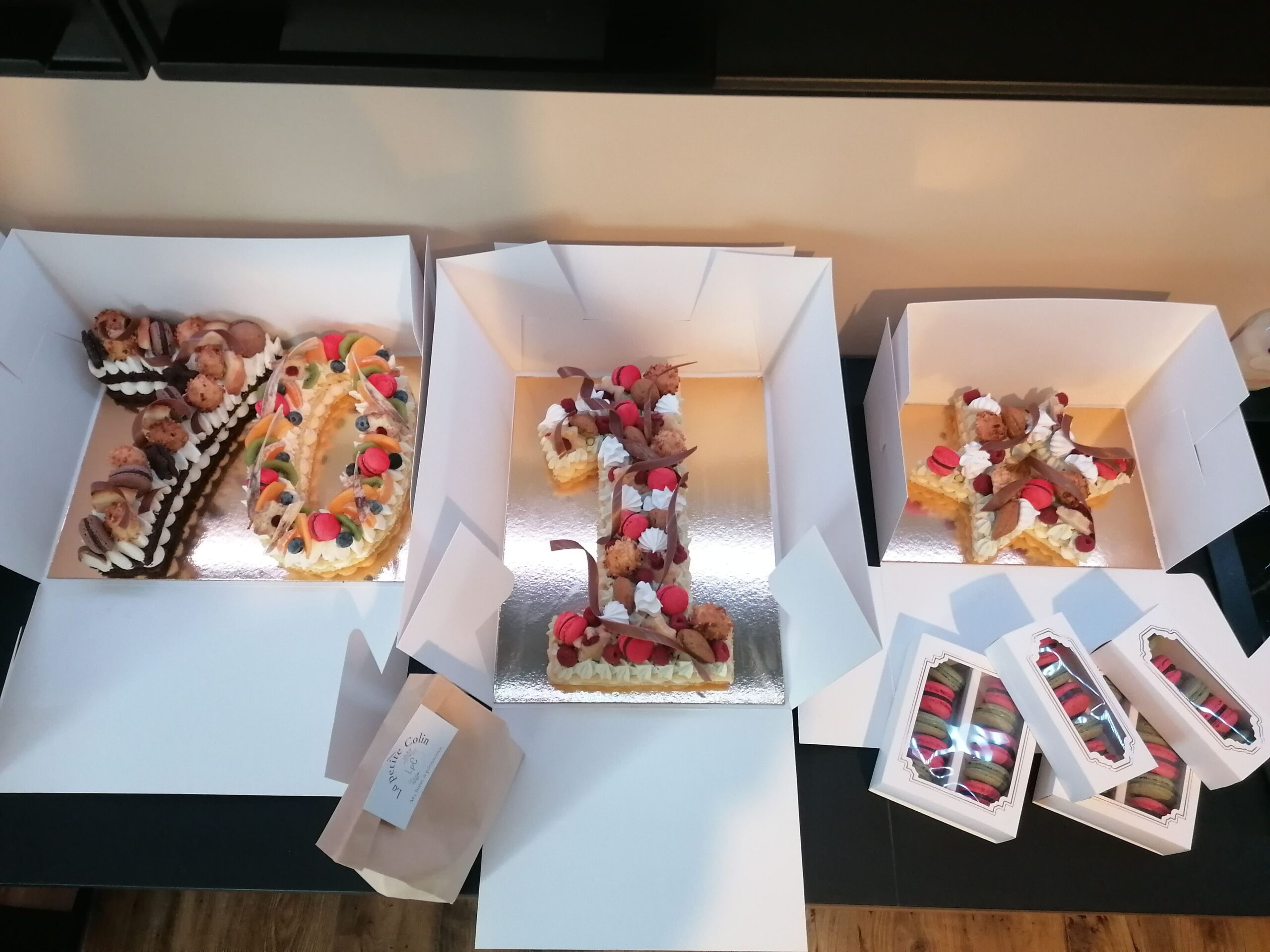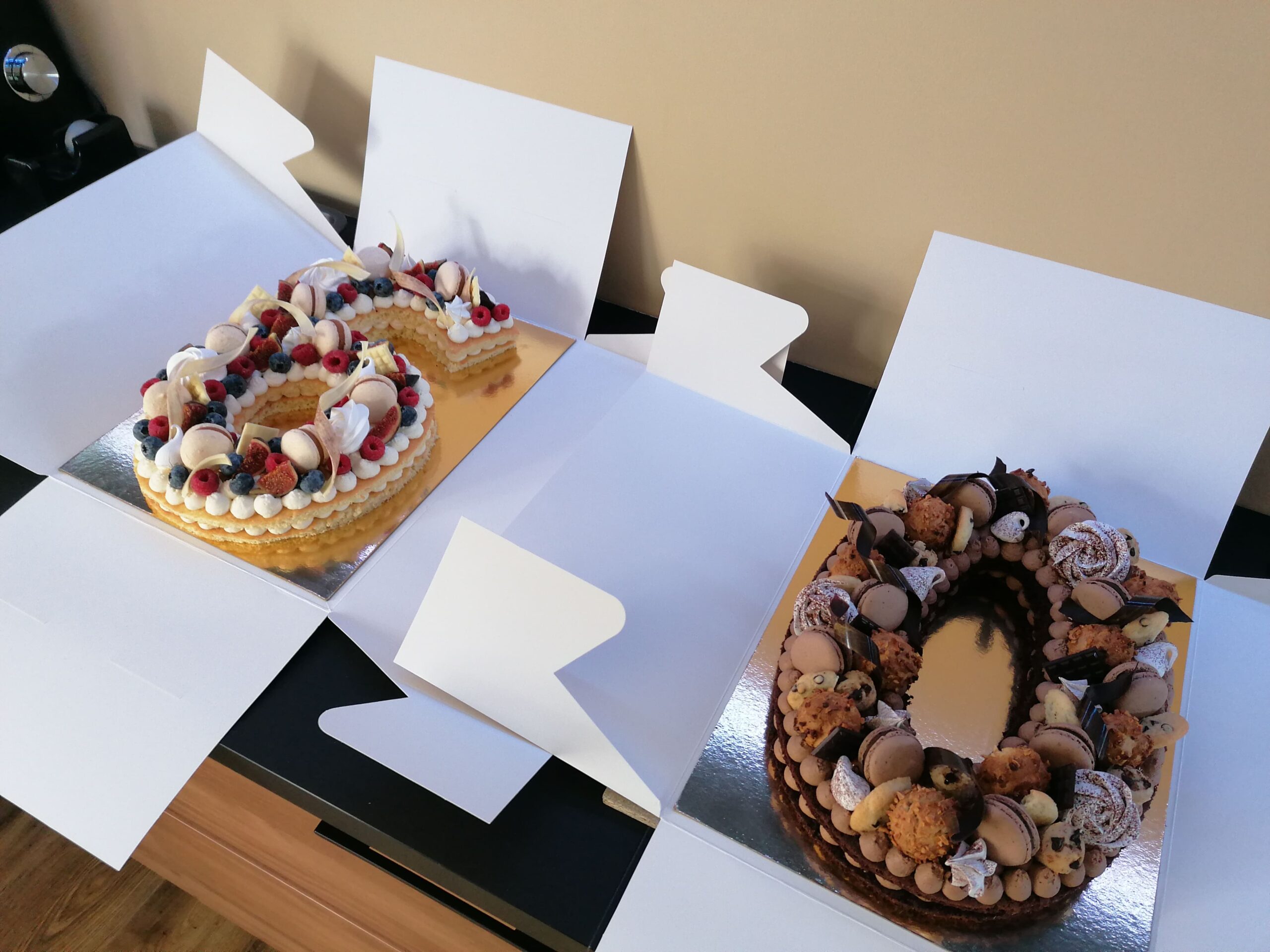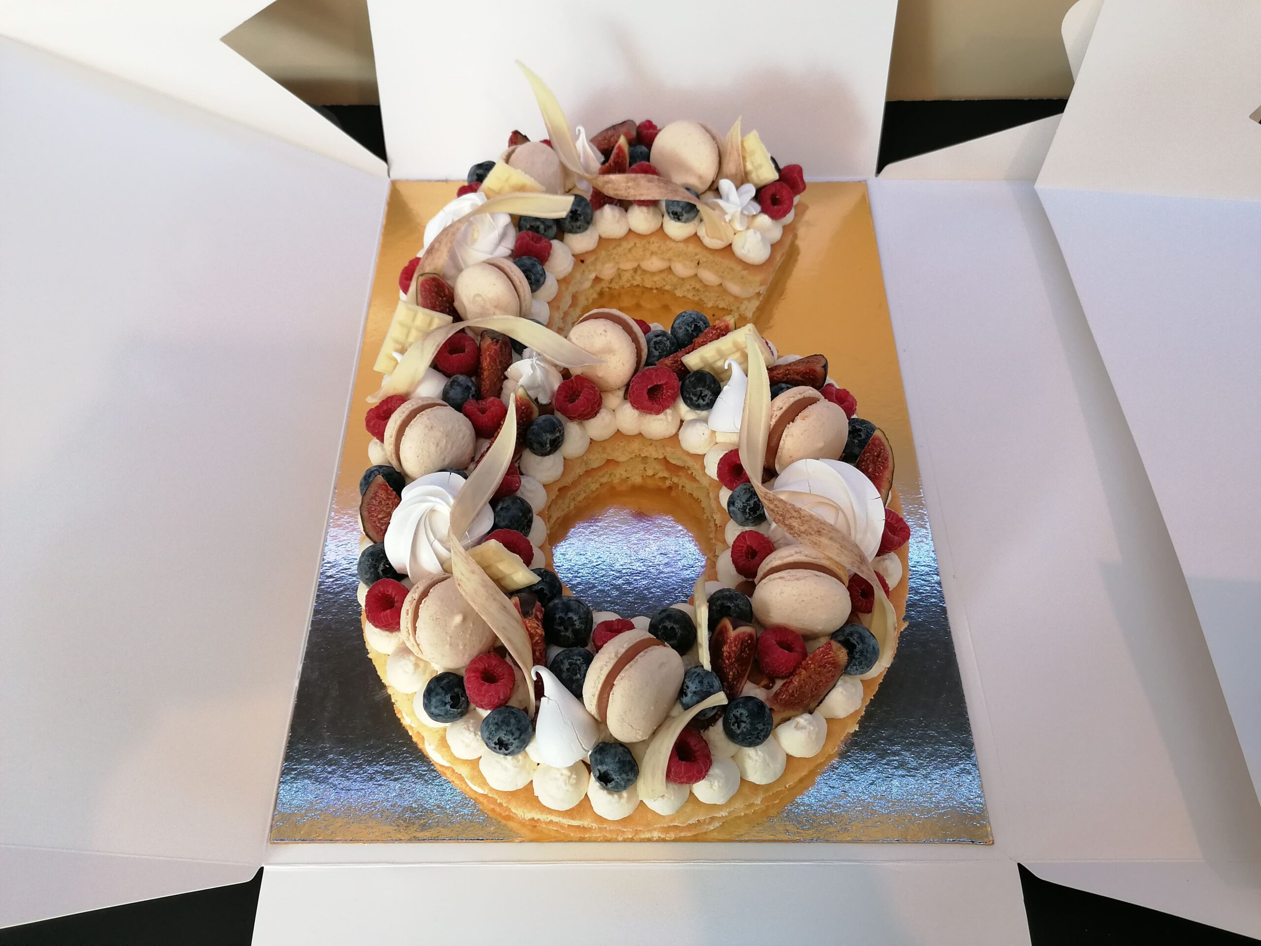 - décor final : macarons caramel beurre salé, meringues, fruits (figues nappées d’un nappage neutre, framboises et myrtilles) & décors chocolat blanc cacaotés, ou pas (mini tablettes, serpentins)