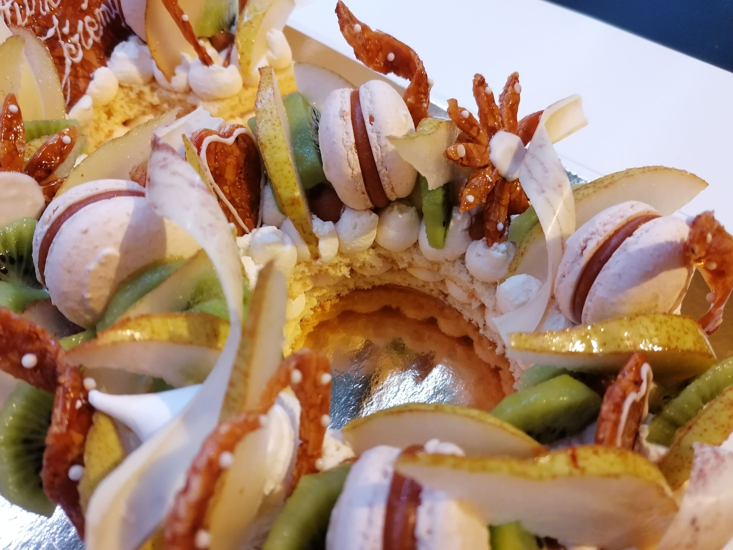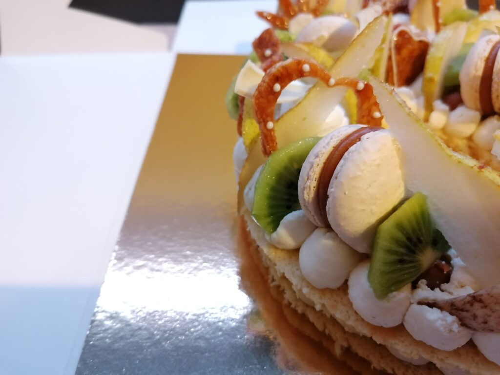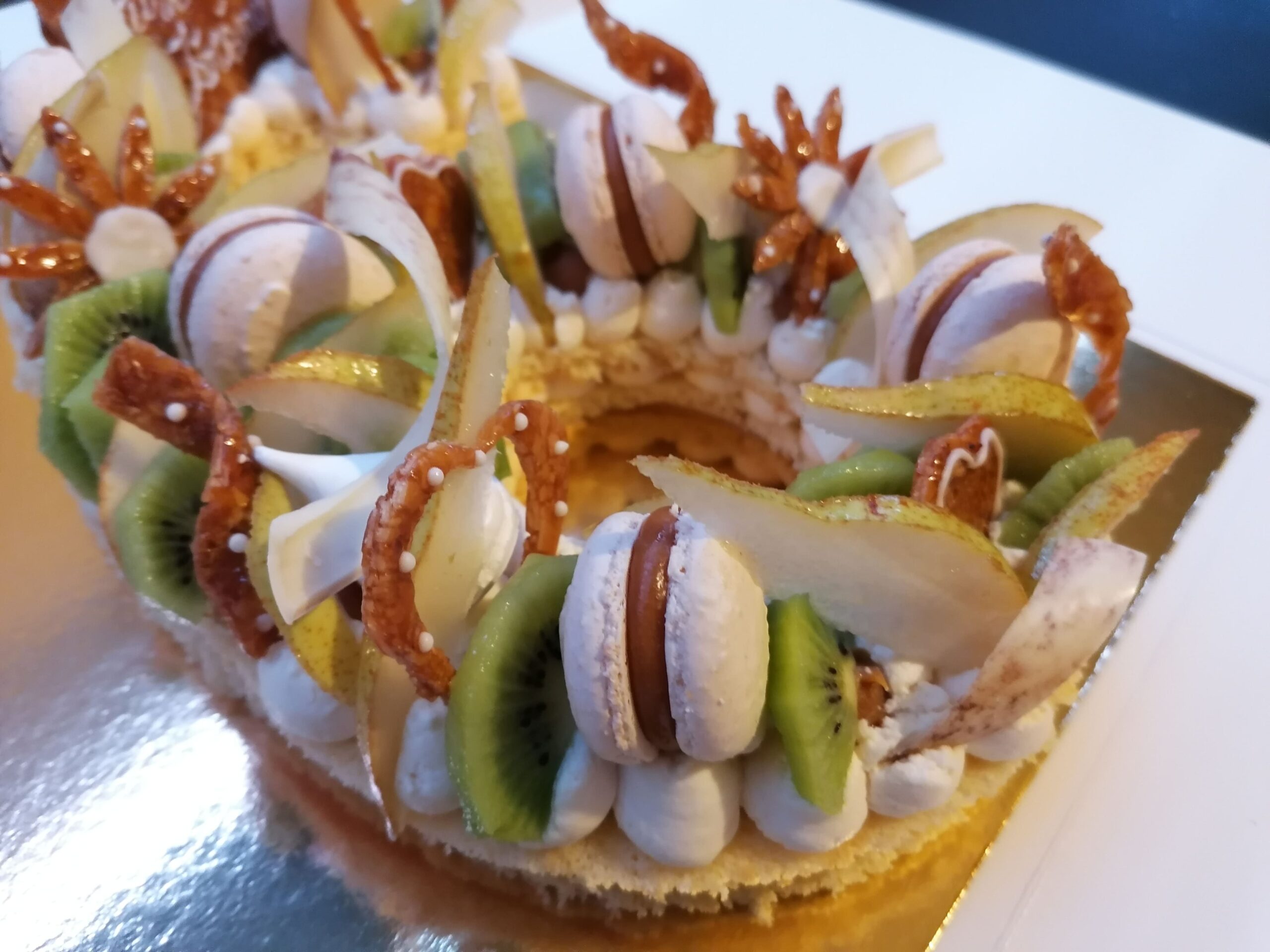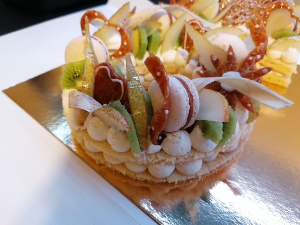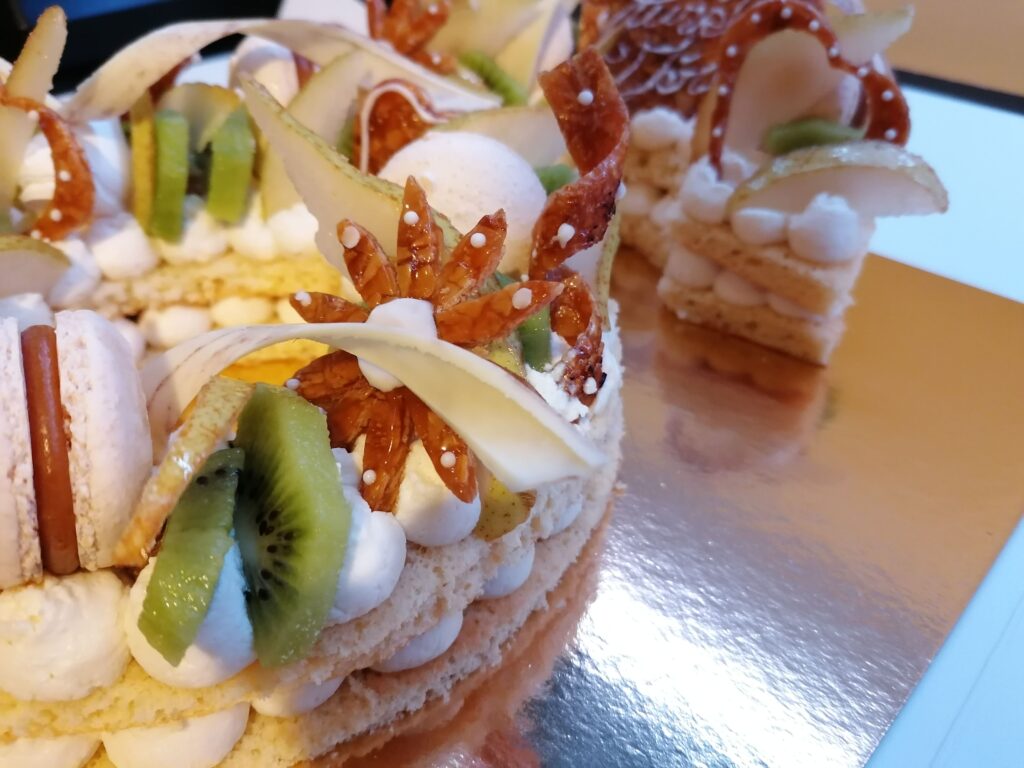 - décor final : macarons caramel beurre salé, meringues, plaque et décors en nougatine avec glace royale (cœurs, …), fruits (kiwis et poires) nappés d’un nappage neutre & décors chocolat blanc cacaotés (serpentins)