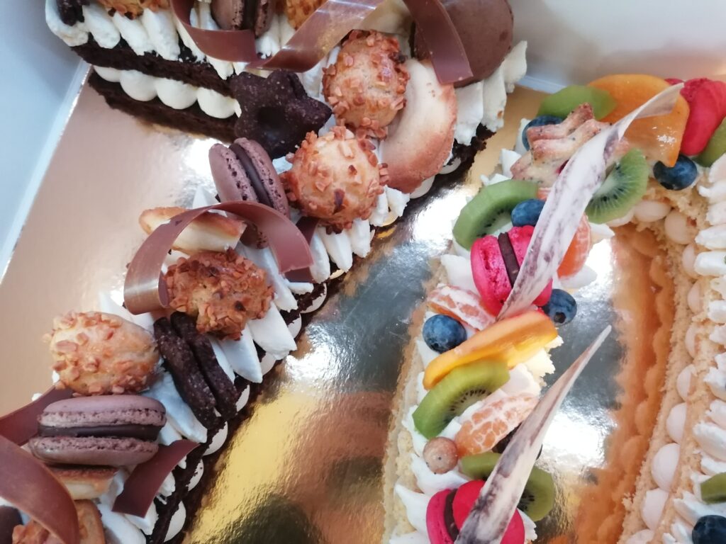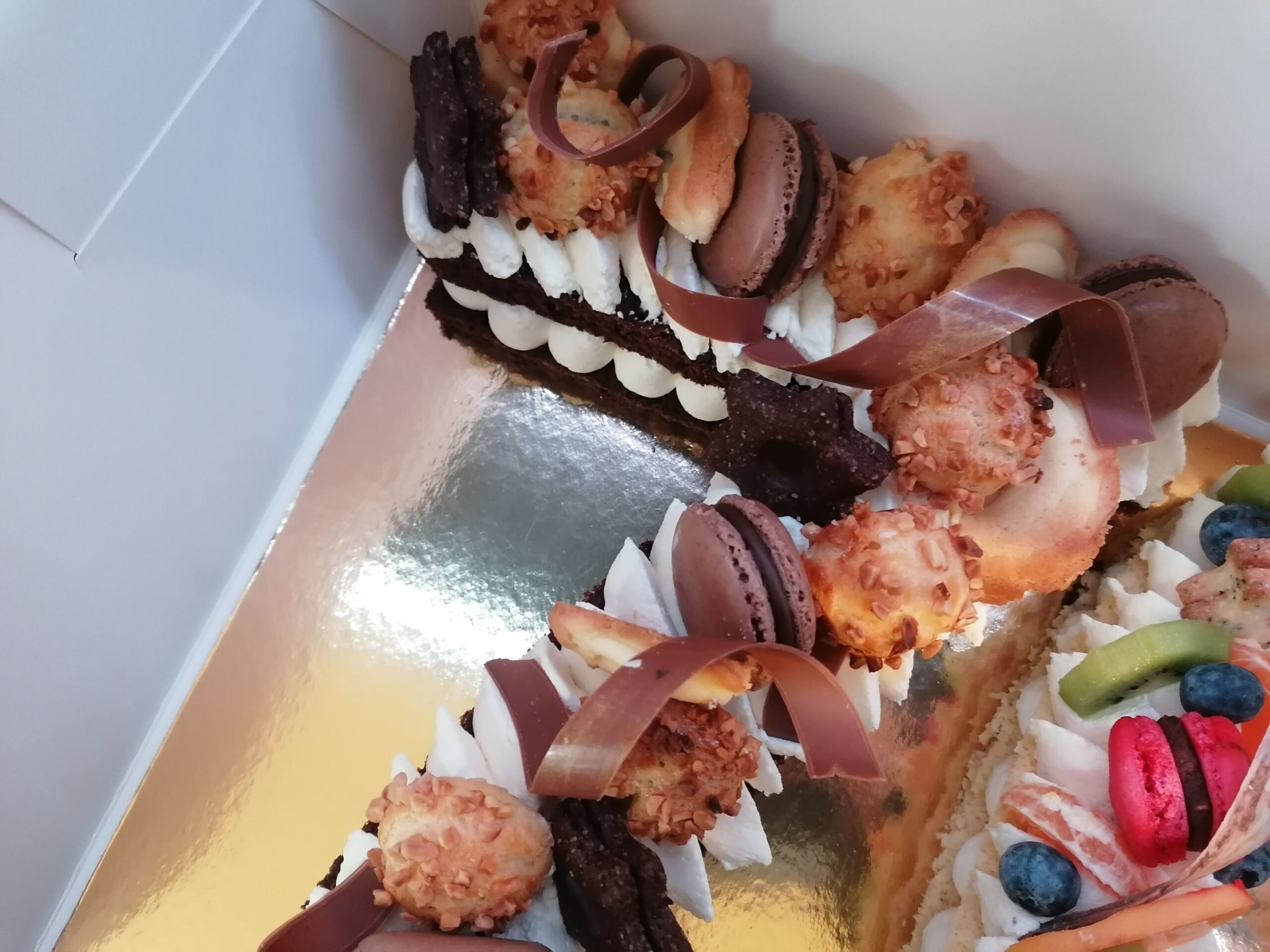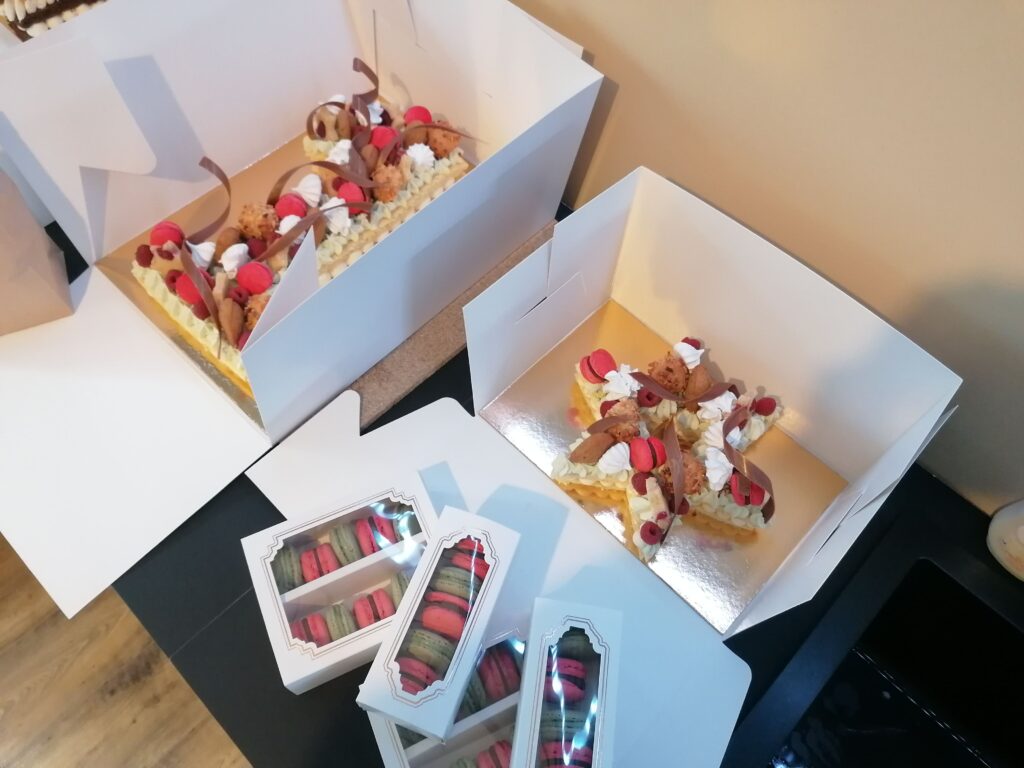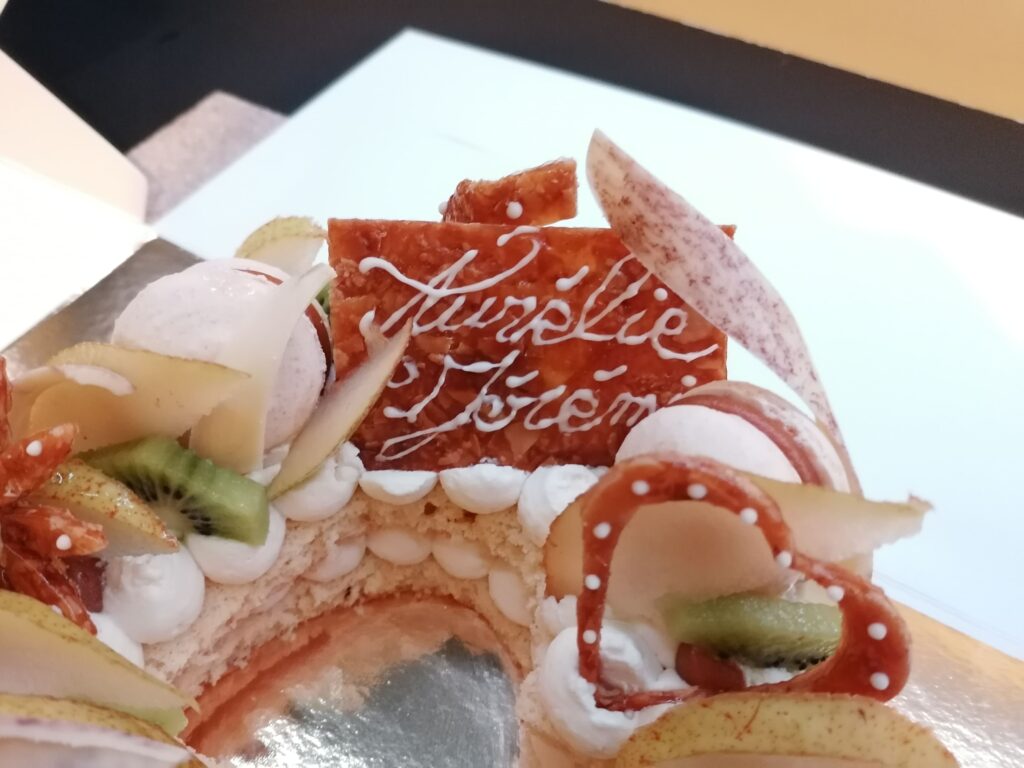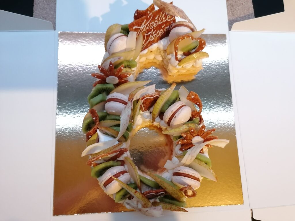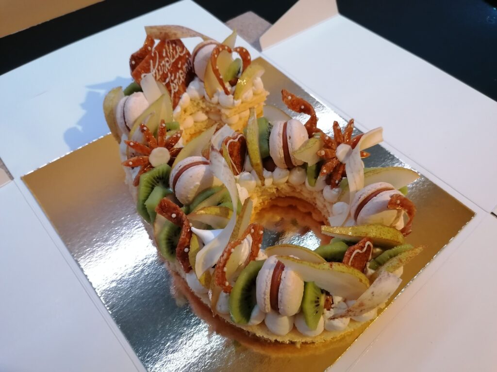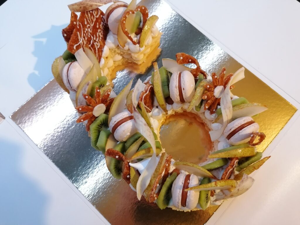 - décor final : macarons caramel beurre salé, meringues, plaque et décors en nougatine avec glace royale (cœurs, …), fruits (kiwis et poires) nappés d’un nappage neutre & décors chocolat blanc cacaotés (serpentins)