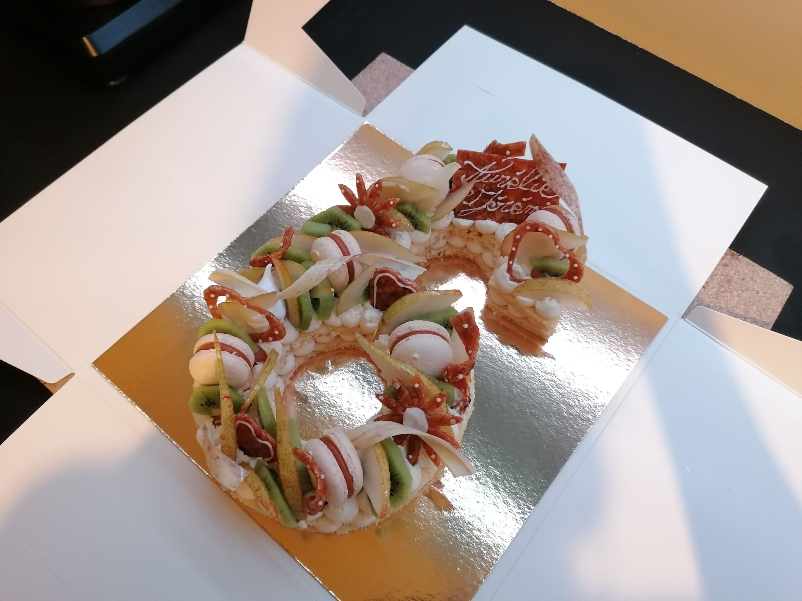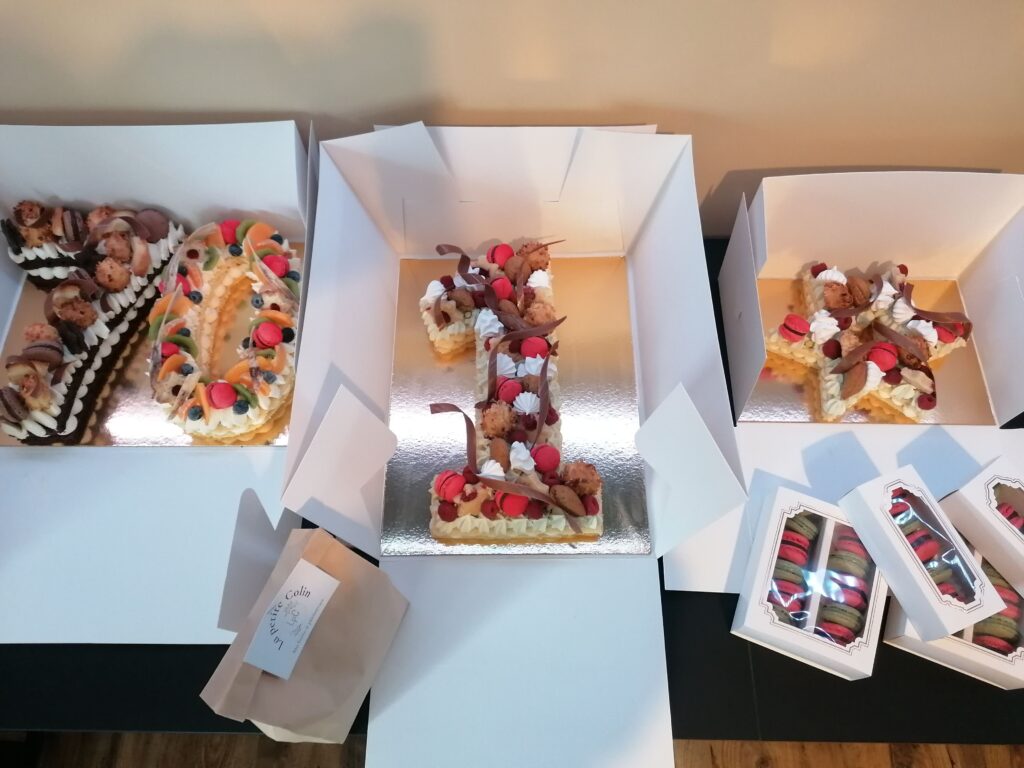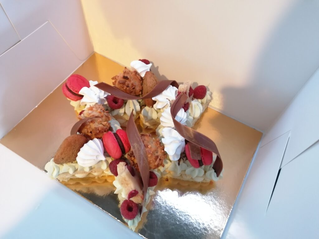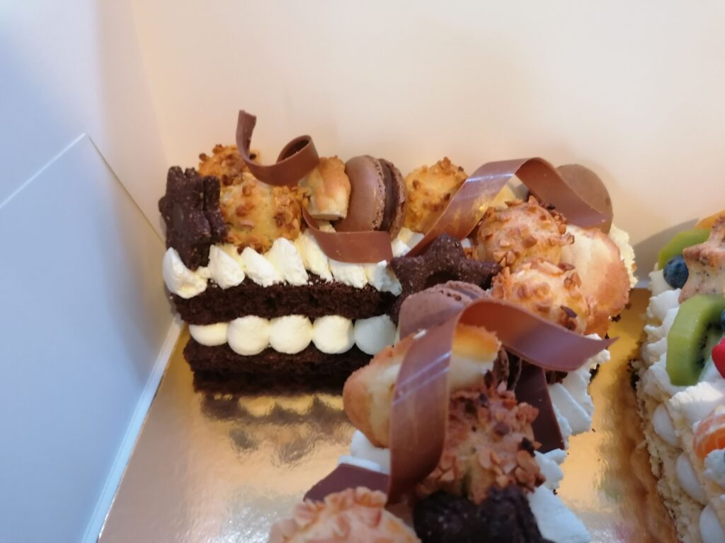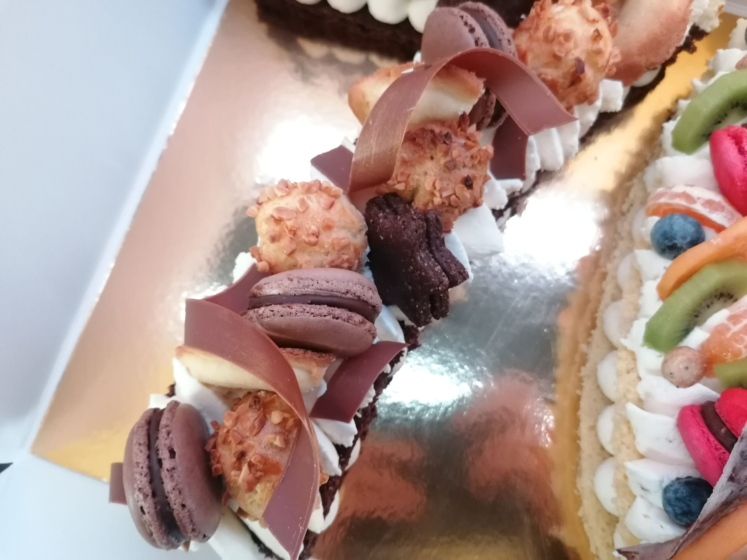 - décor final : macarons caramel beurre salé, meringues, plaque et décors en nougatine avec glace royale (cœurs, …), fruits (kiwis et poires) nappés d’un nappage neutre & décors chocolat blanc cacaotés (serpentins)