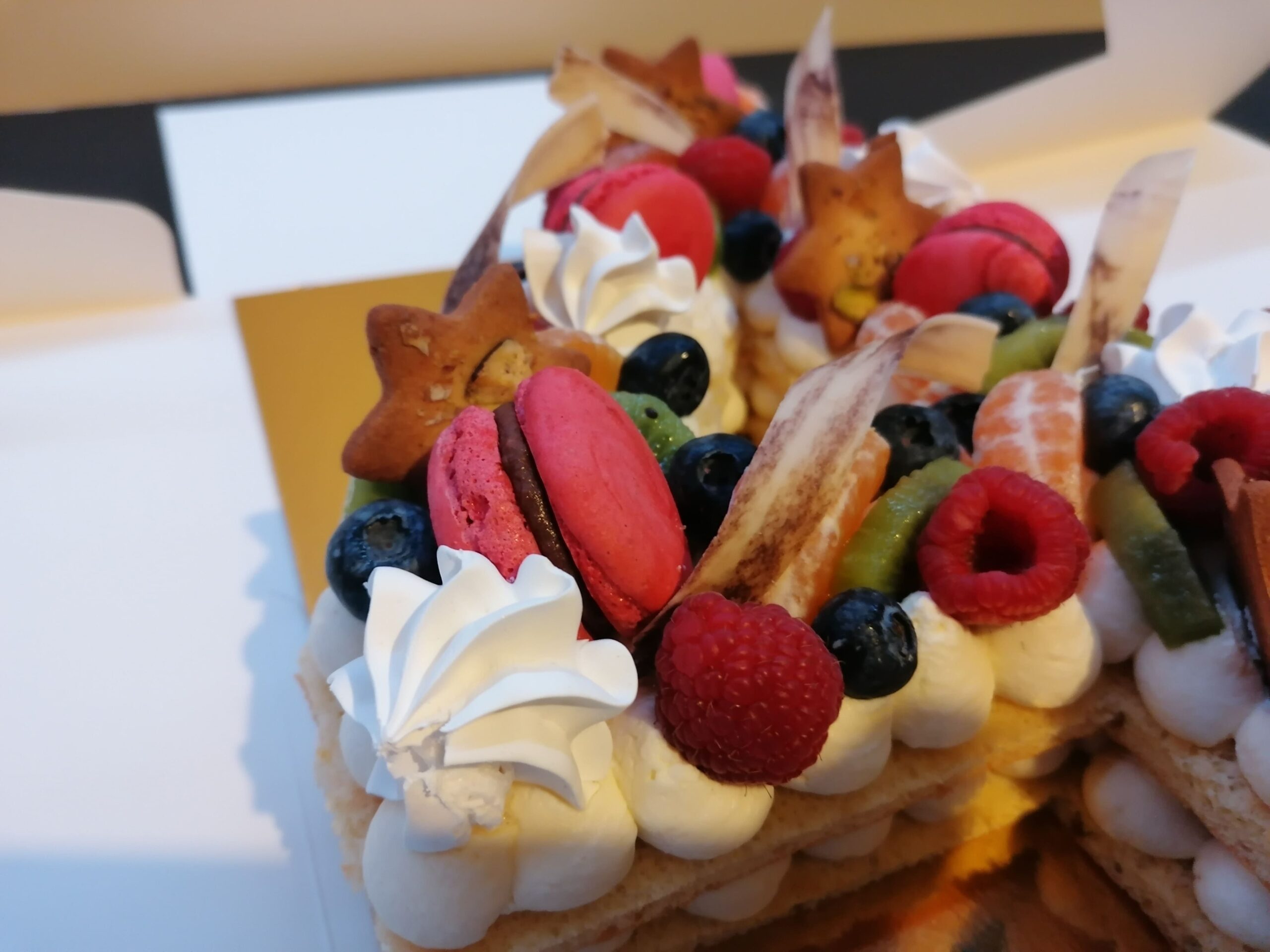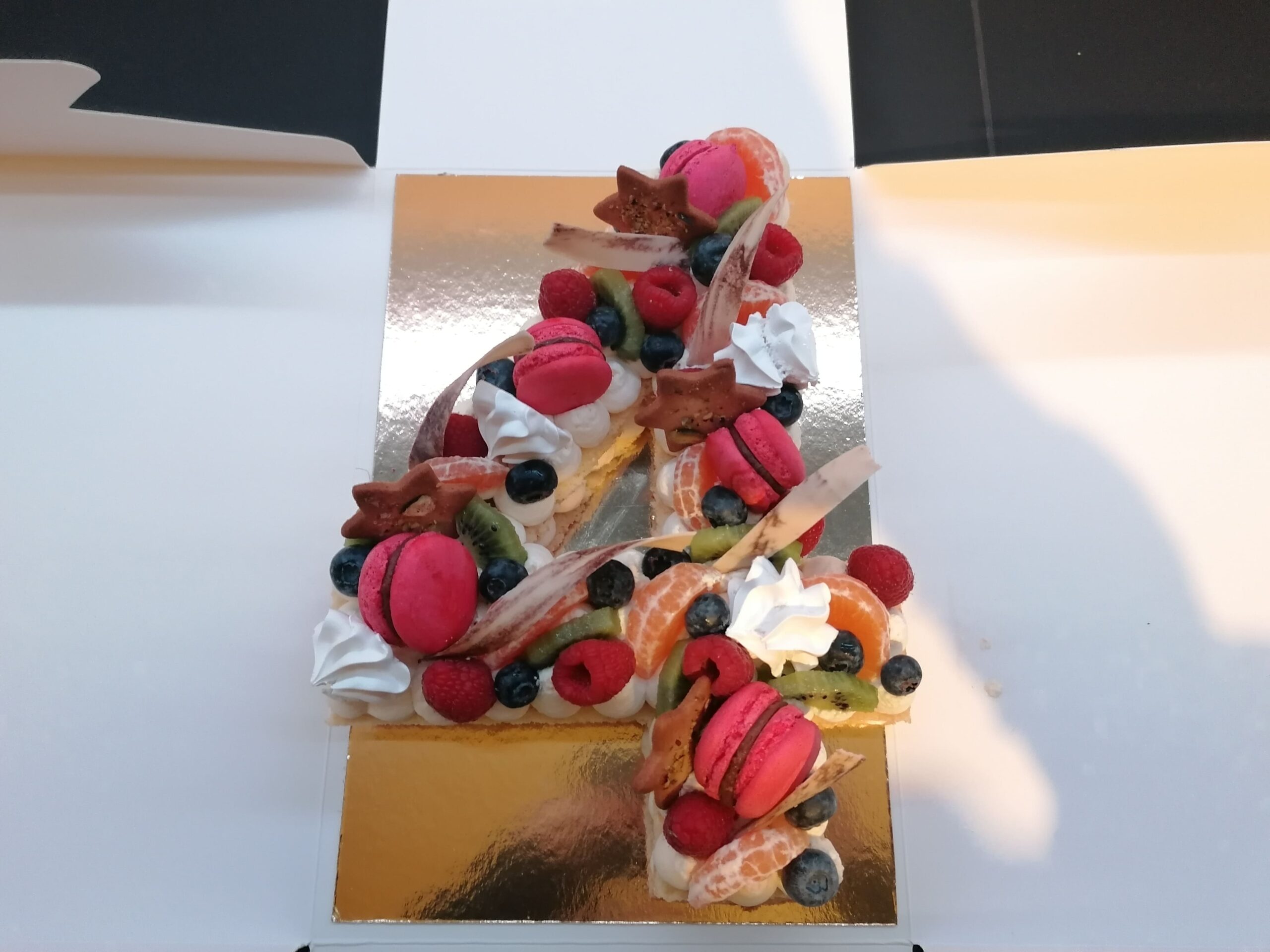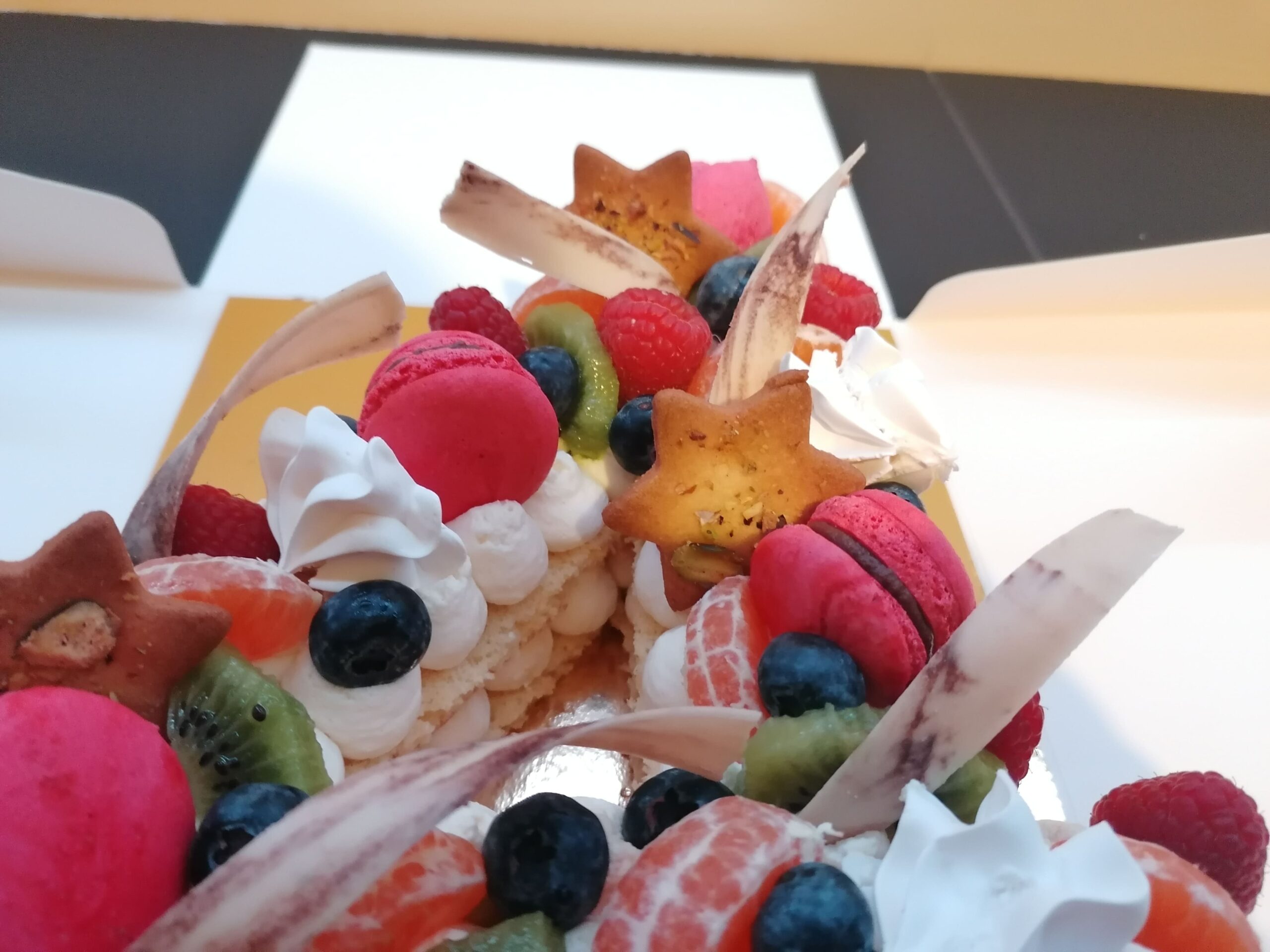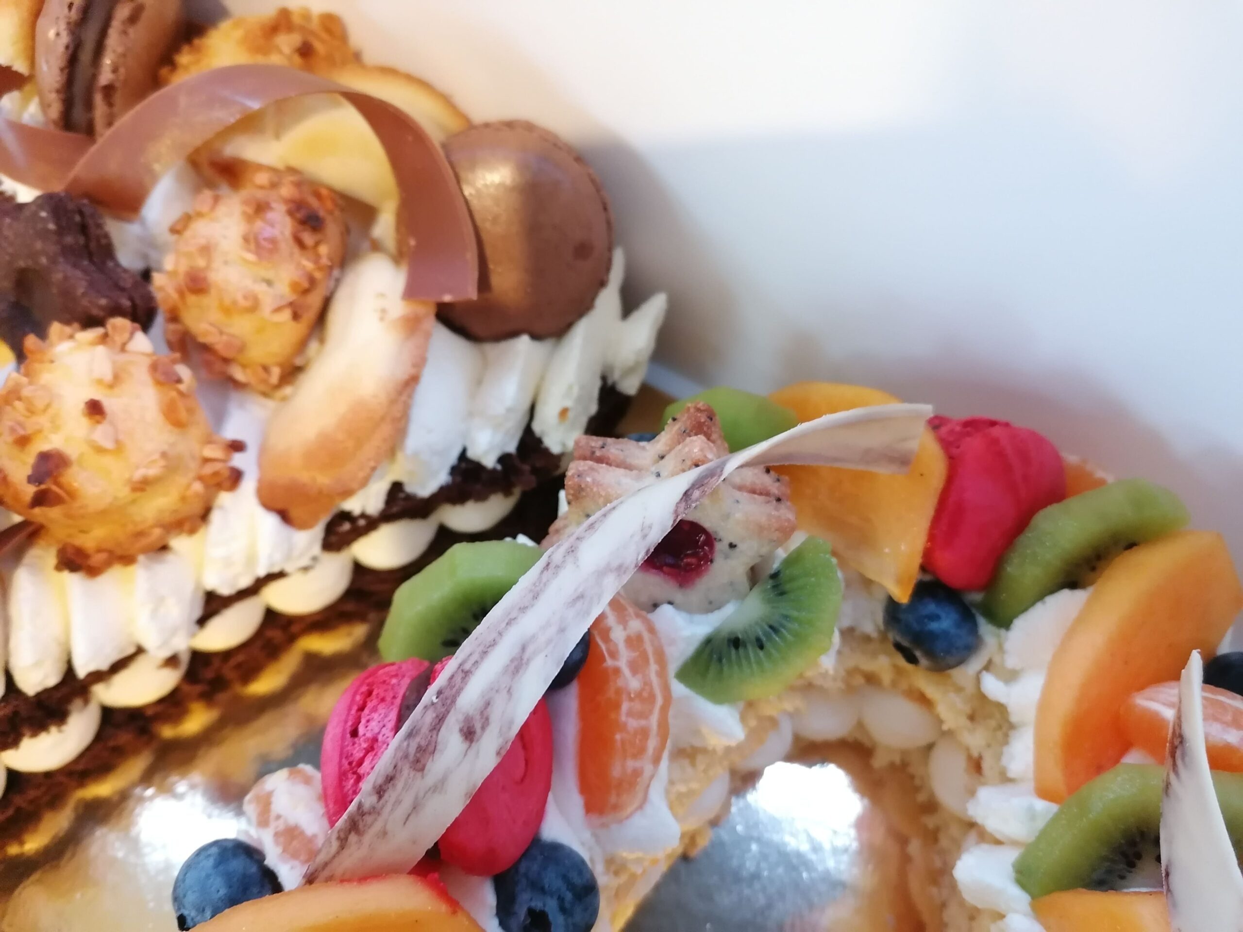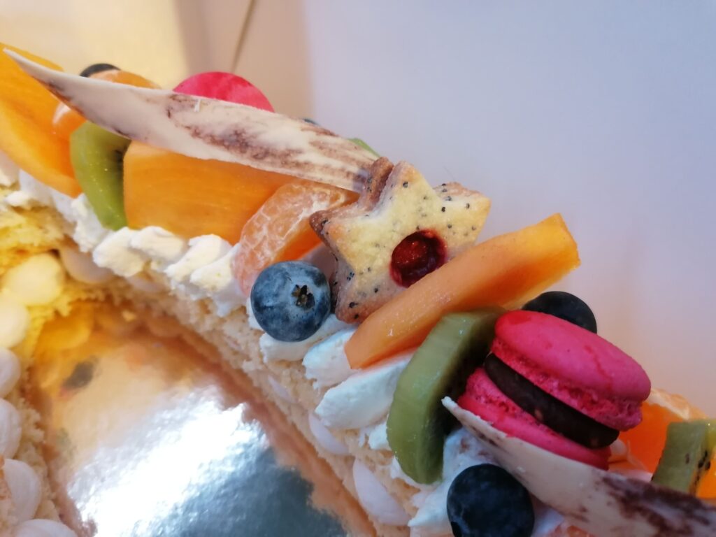 - décor final : macarons framboises, biscuits étoiles citron pavot fourrés confit framboises, fruits (kaki, kiwi, clémentines et myrtilles) nappés d’un nappage neutre (sauf myrtilles) & décors chocolat blanc cacaotés (serpentins)