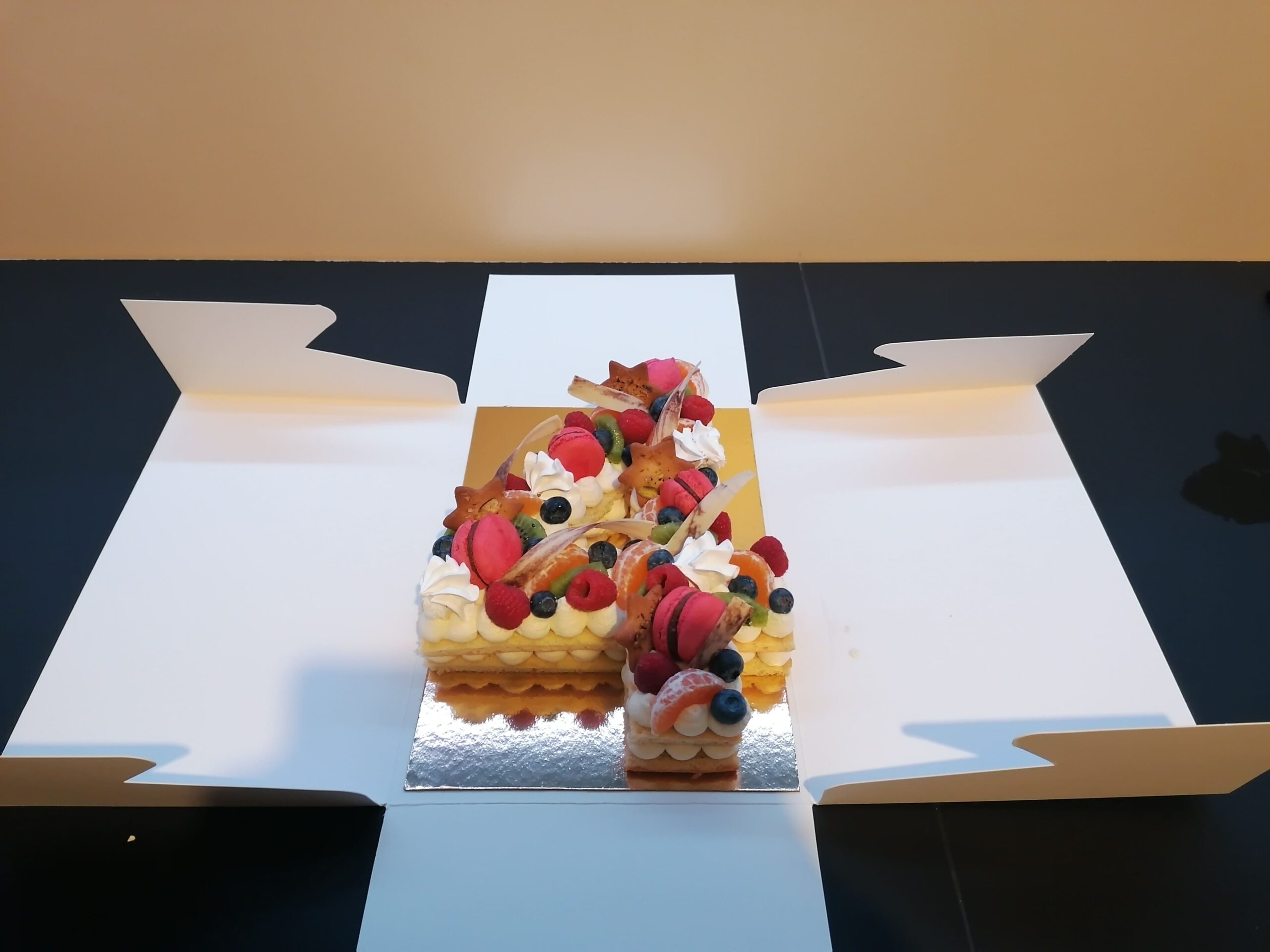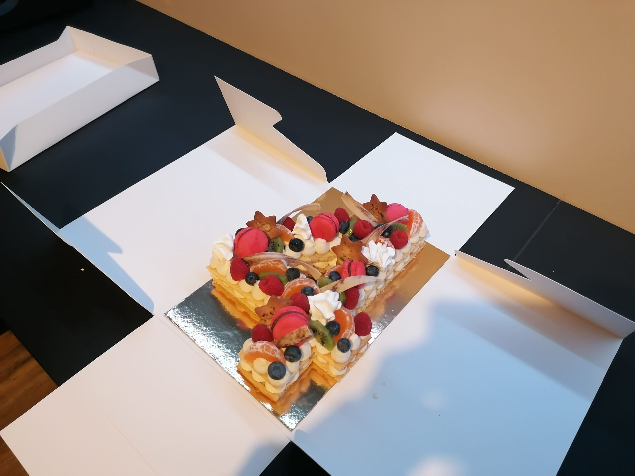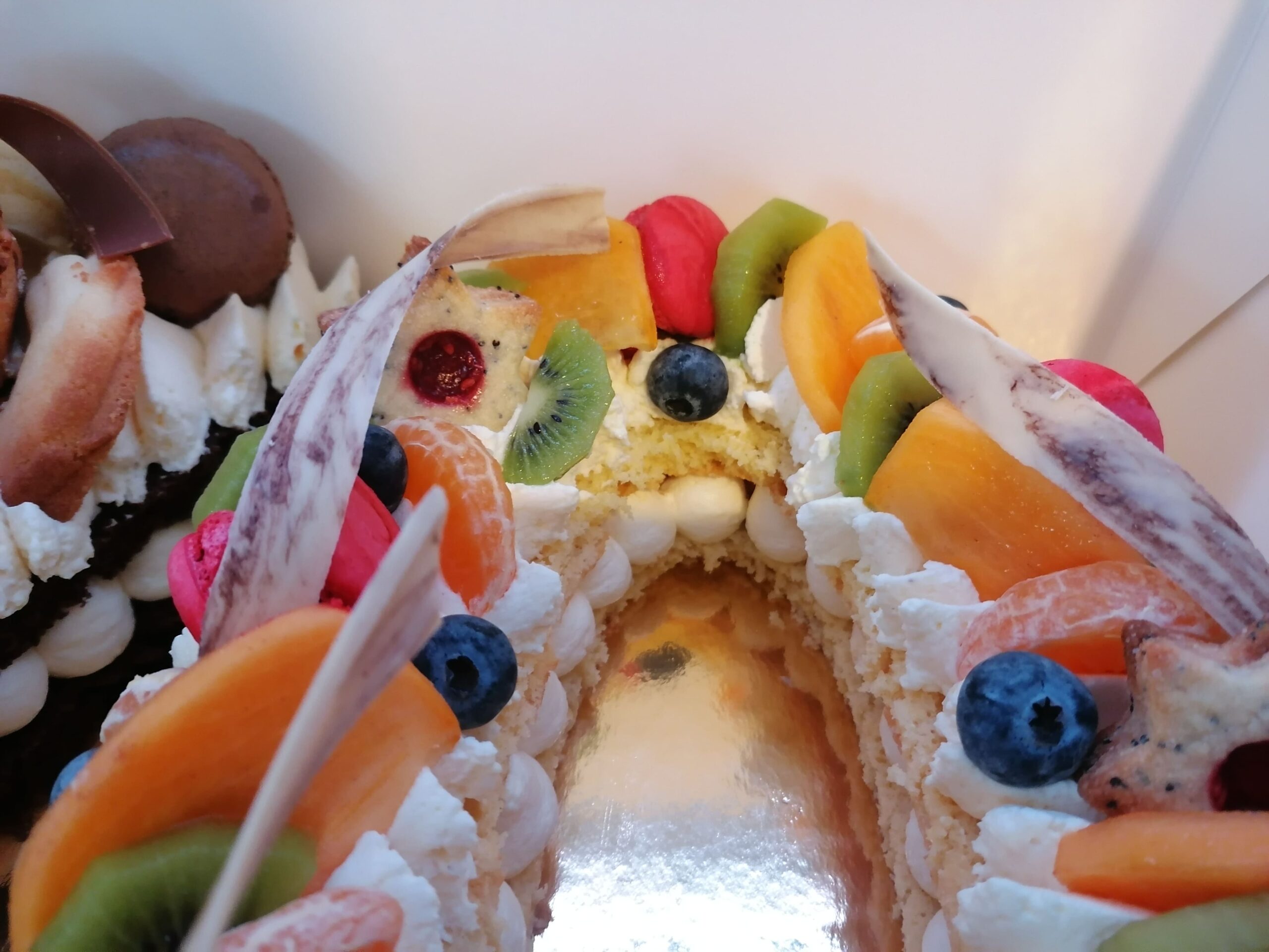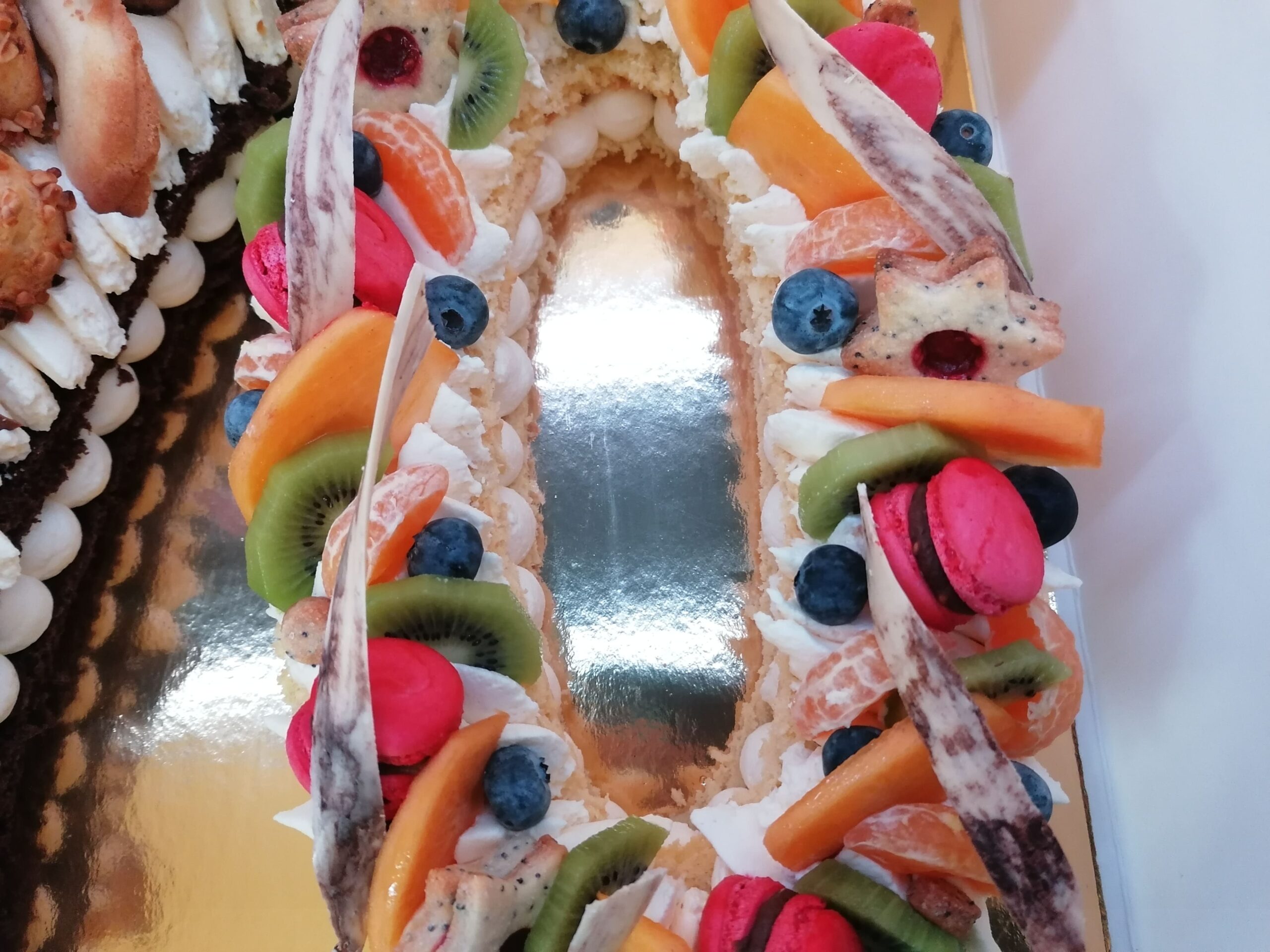 - décor final : macarons framboises, biscuits étoiles citron pavot fourrés confit framboises, fruits (kaki, kiwi, clémentines et myrtilles) nappés d’un nappage neutre (sauf myrtilles) & décors chocolat blanc cacaotés (serpentins)