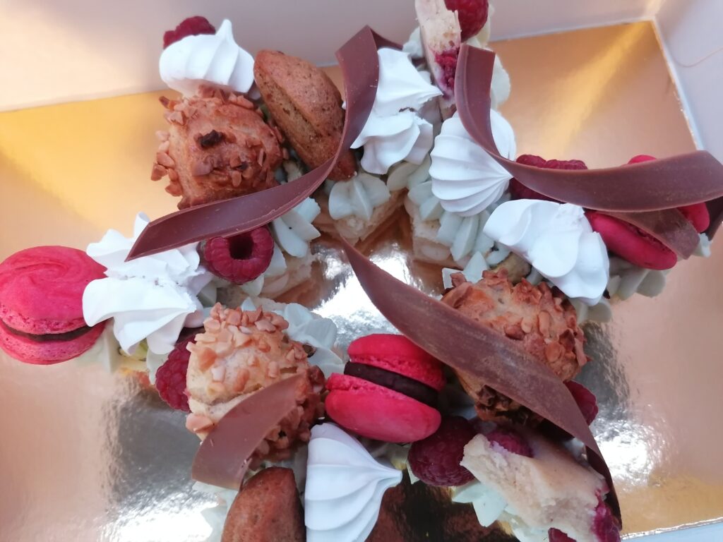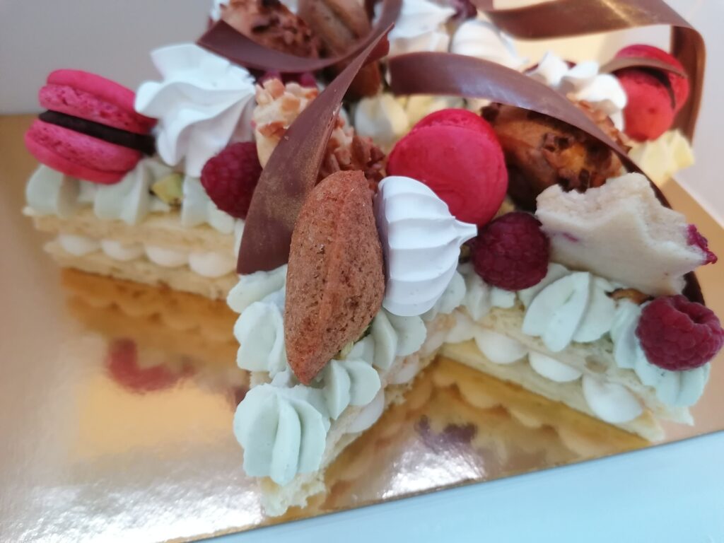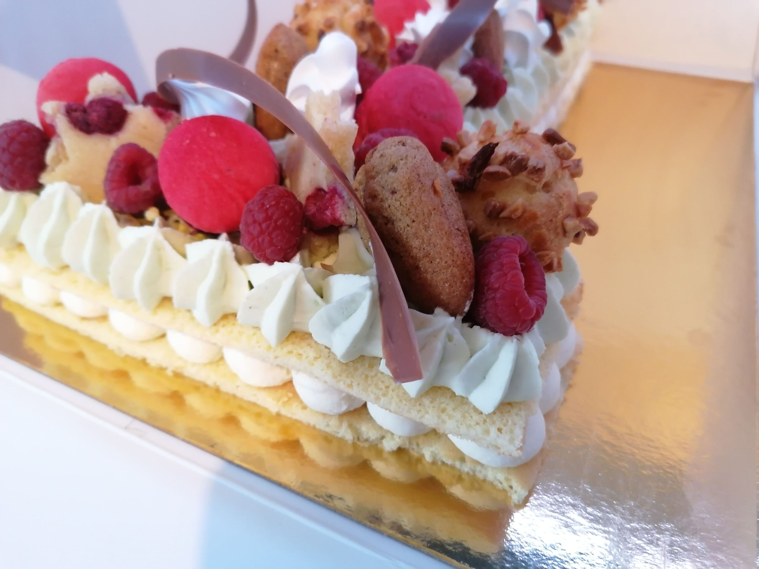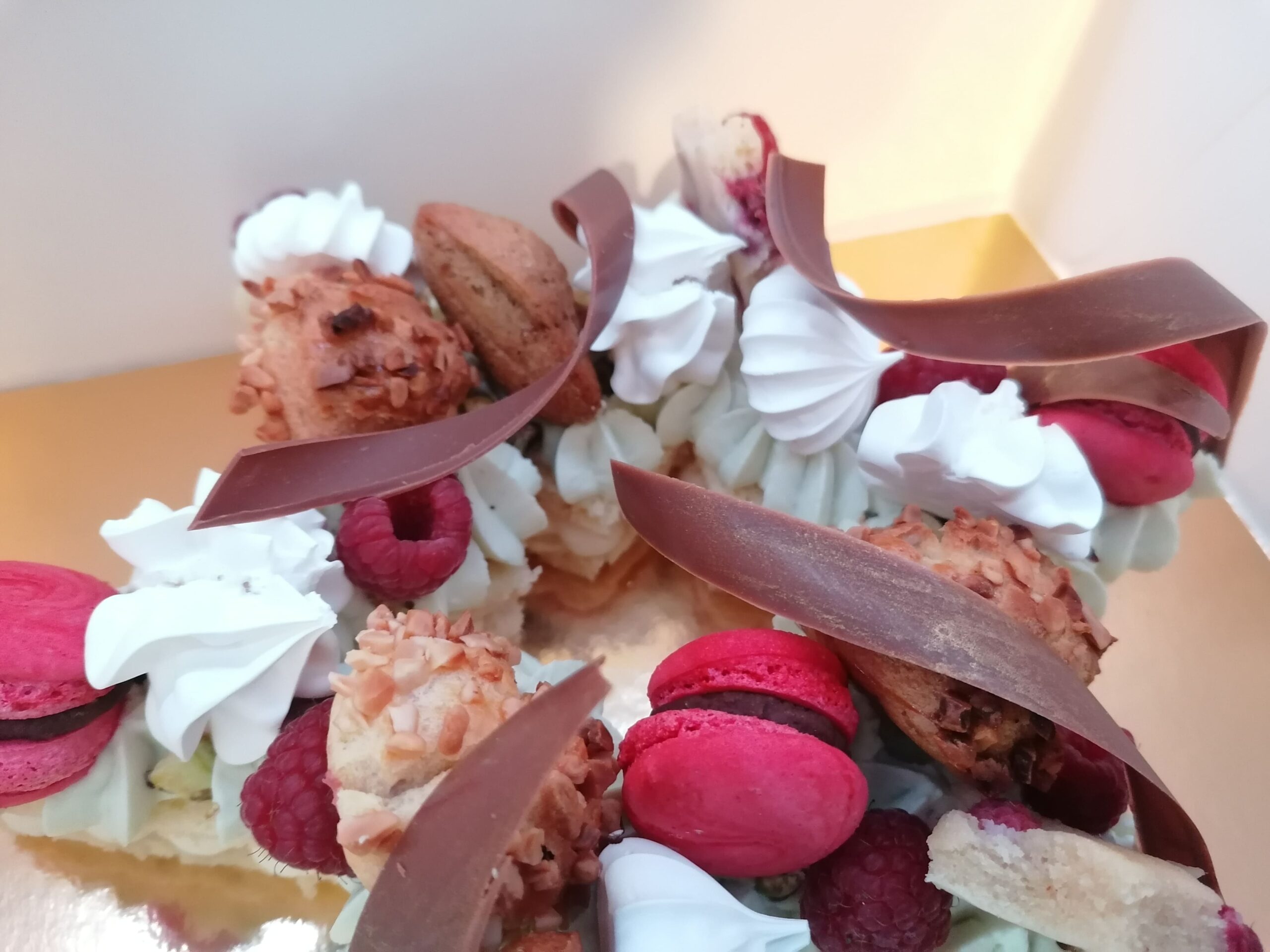 - décor final : pistaches torréfiées et concassées, choux amandes framboises, macarons framboises, mini madeleines pistaches, financiers étoiles framboises, meringues aromatisées pistaches et framboises, framboises & décors chocolat au lait dorés (serpentins)