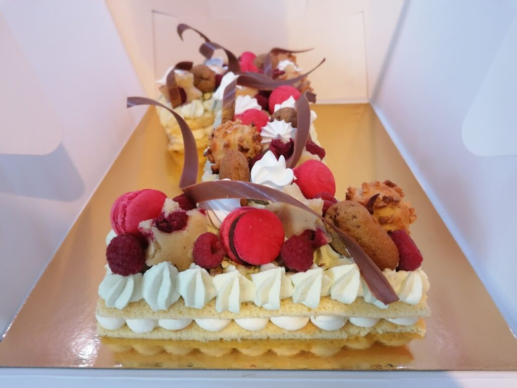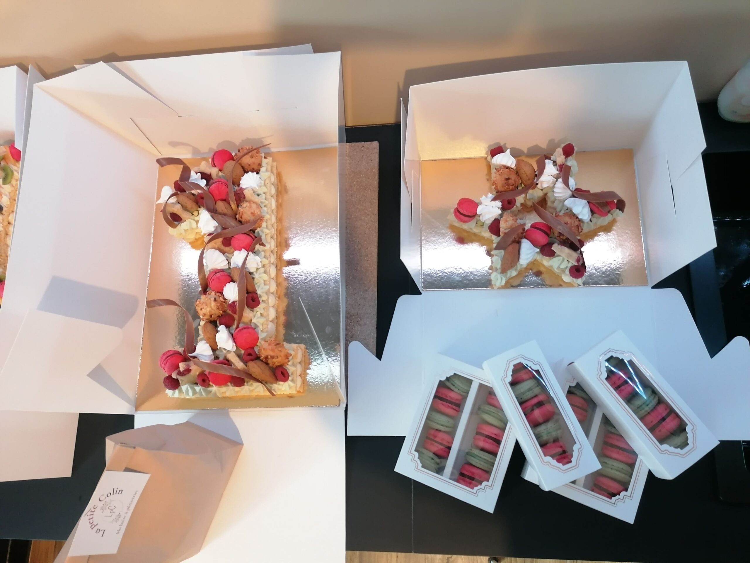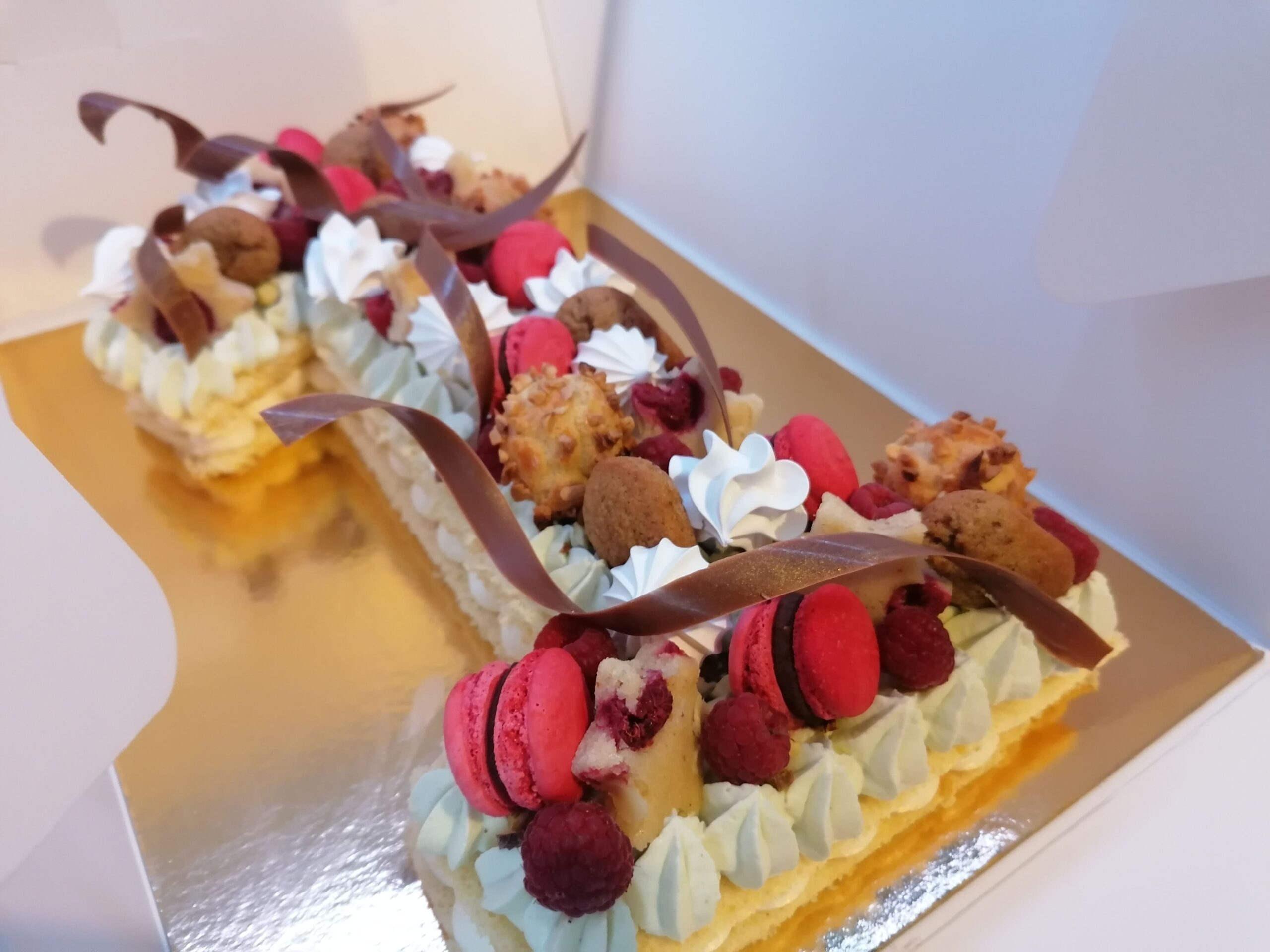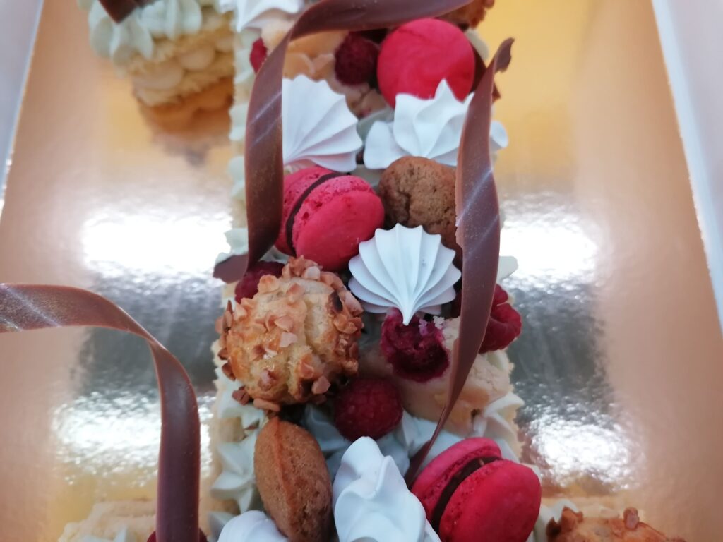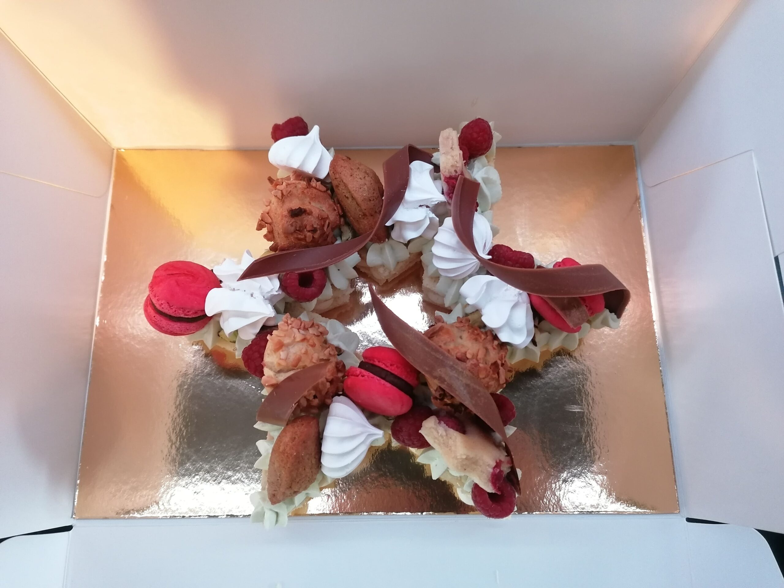 - décor final : pistaches torréfiées et concassées, choux amandes framboises, macarons framboises, mini madeleines pistaches, financiers étoiles framboises, meringues aromatisées pistaches et framboises, framboises & décors chocolat au lait dorés (serpentins)