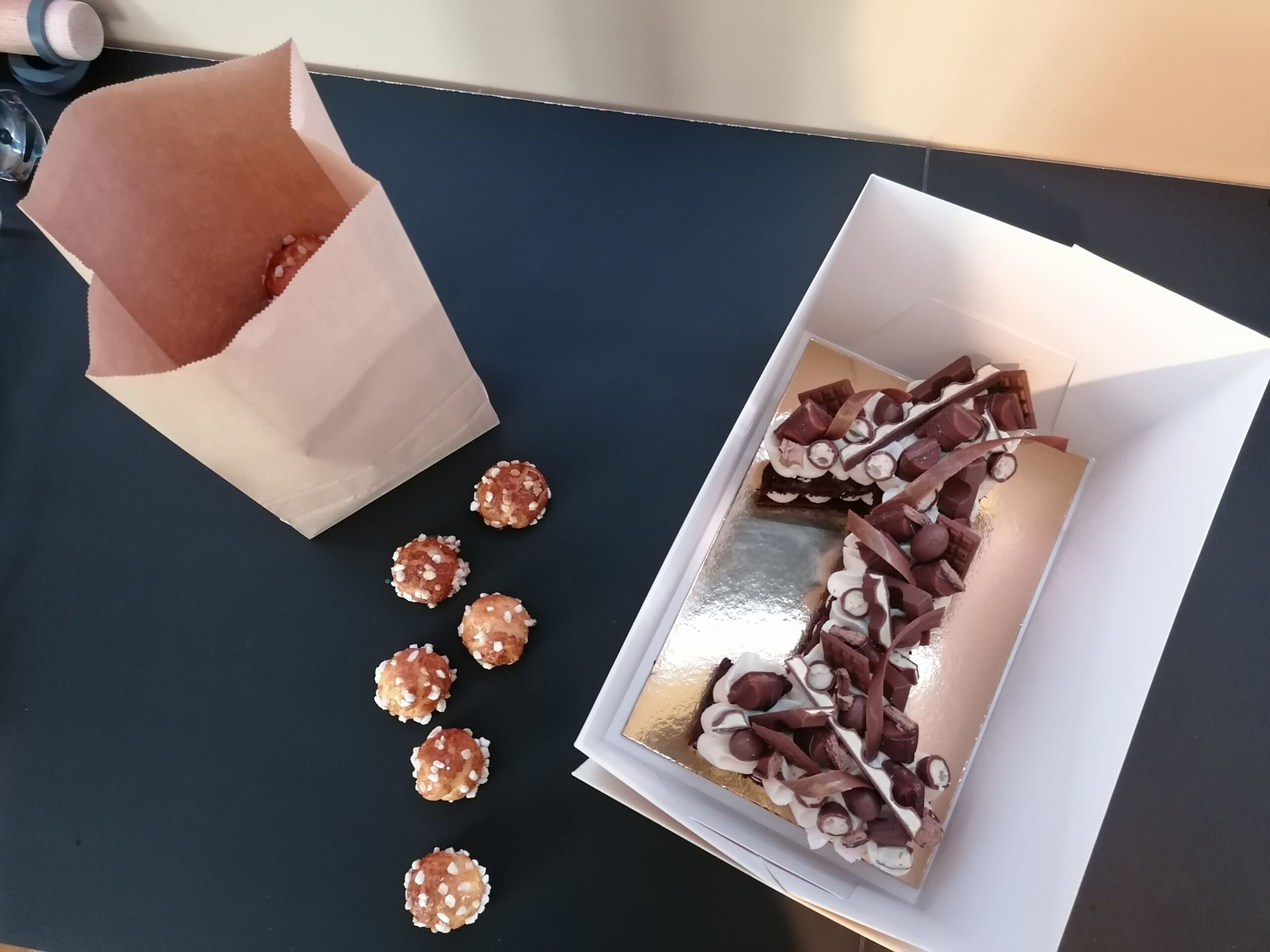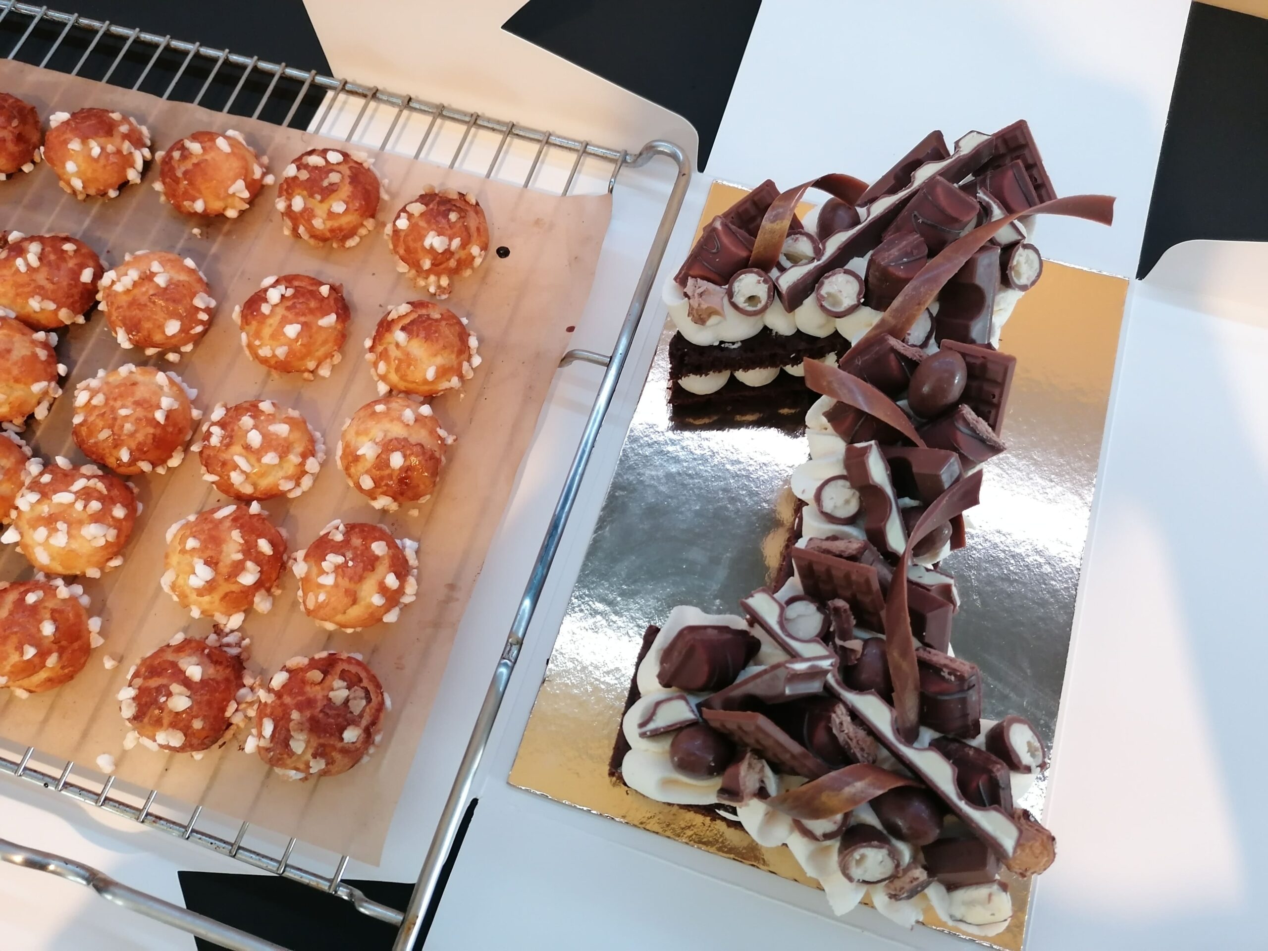 - décor final : macarons chocolat noir, choux amandes à la crème pâtissière chocolat noir, meringues cacao, mini financiers et mini cookies pépites chocolat noir & décors chocolat noir dorés, ou pas (mini tablettes, serpentins)