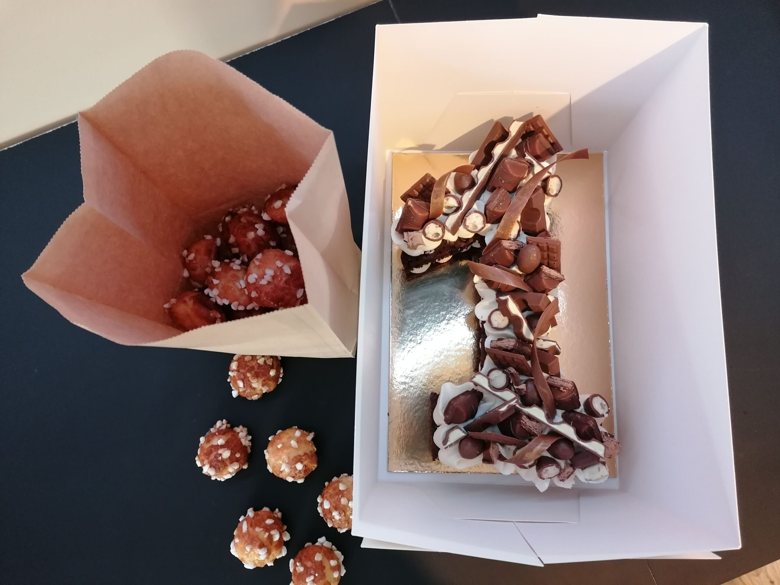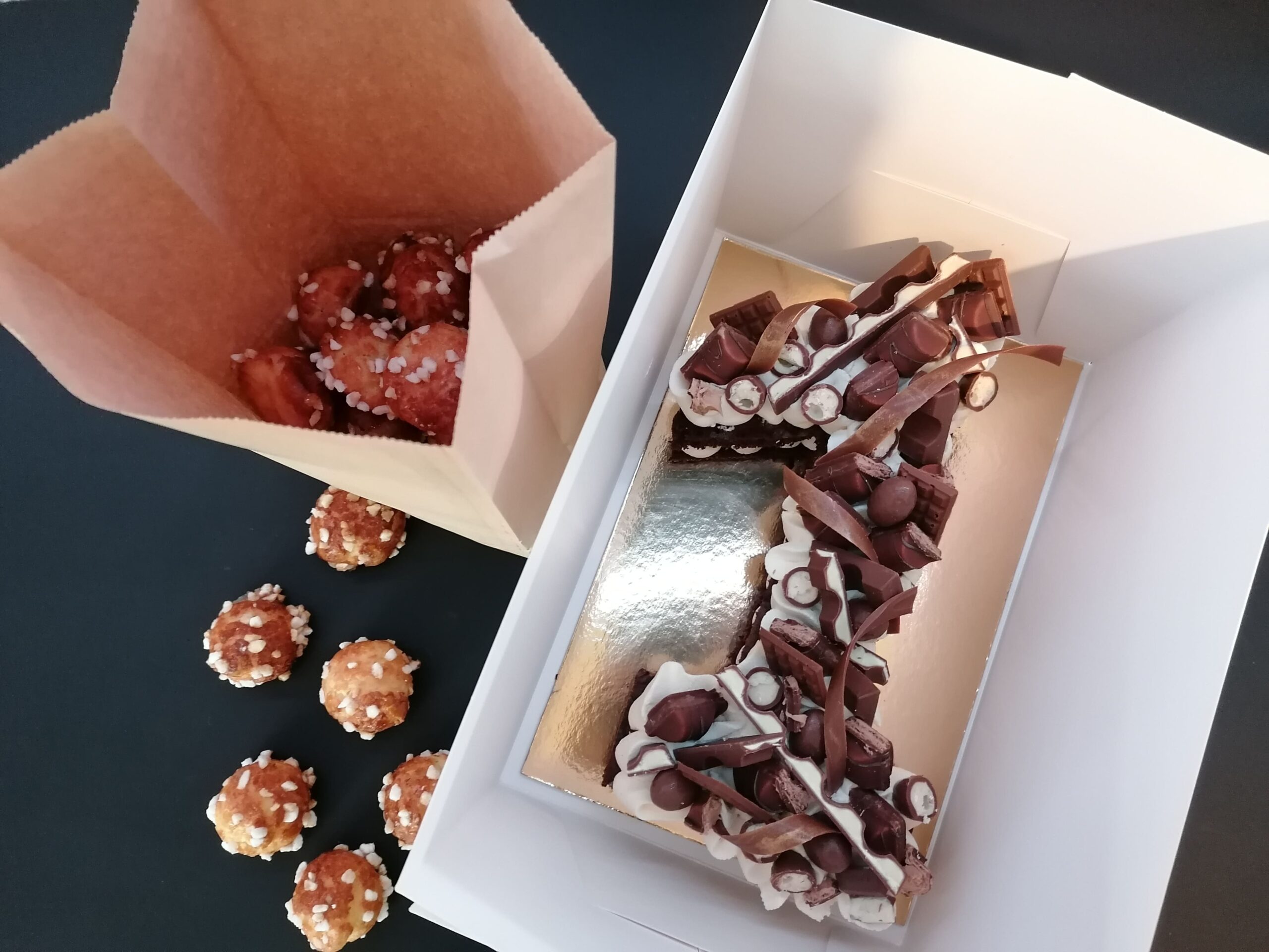 - décors chocolat noir dorés, ou pas (mini tablettes, serpentins) : QS