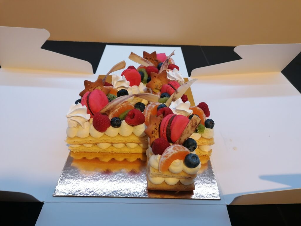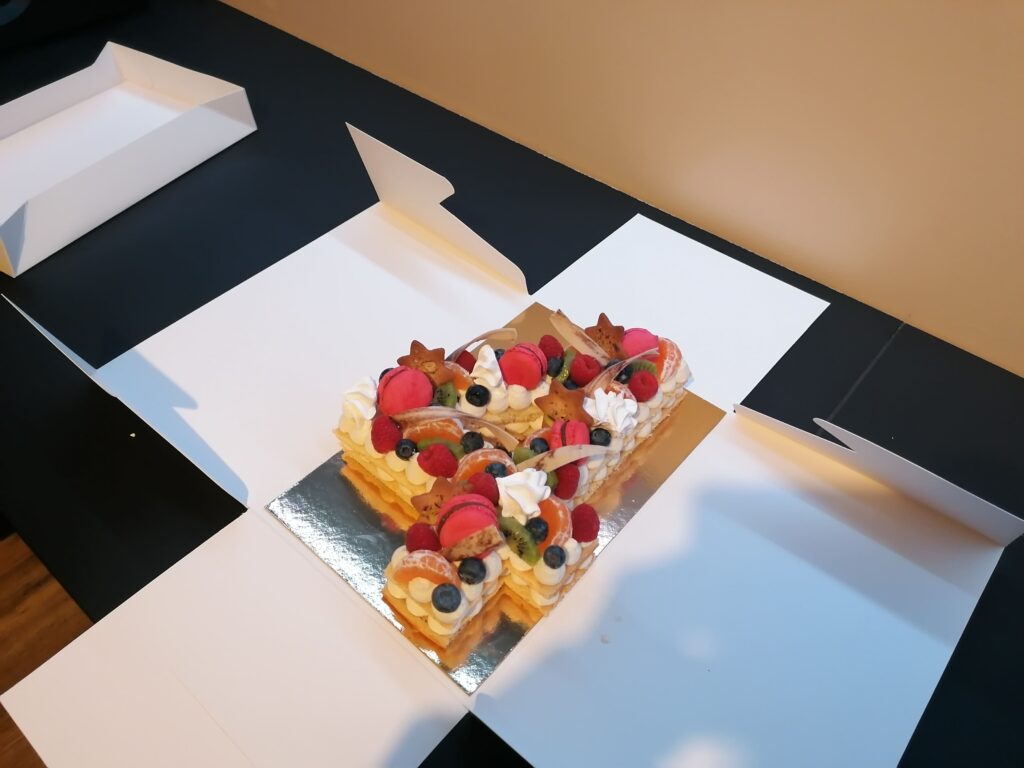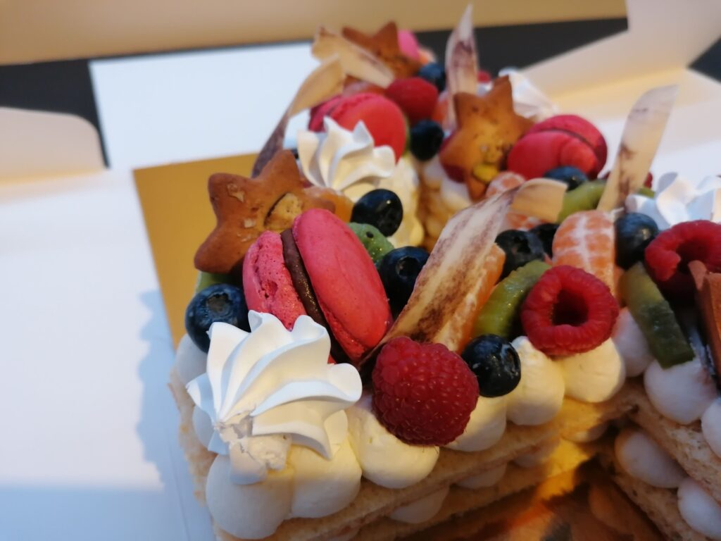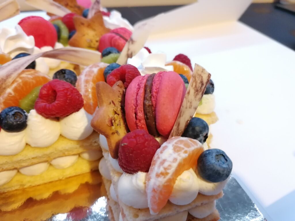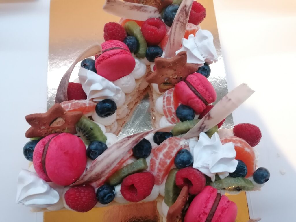 - décor final : macarons framboises, meringues aromatisées framboises, fruits (kiwi, clémentine, framboises et myrtilles) nappés d’un nappage neutre (sauf framboises et myrtilles), biscuits étoiles pistaches & décors chocolat blanc cacaotés (serpentins)