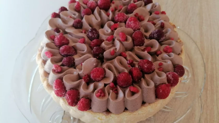 - Poser ce dernier sur la crème bavaroise remplie de framboises, en faisant attention de ne pas toucher le dessus de la cartouchière, sans quoi il y aurait des traces de chocolat impossible à effacer, puis appuyer légèrement dessus avec les doigts afin de retirer les vides dues aux bulles d’air qui pourraient s’être formées entre cet insert et la crème.