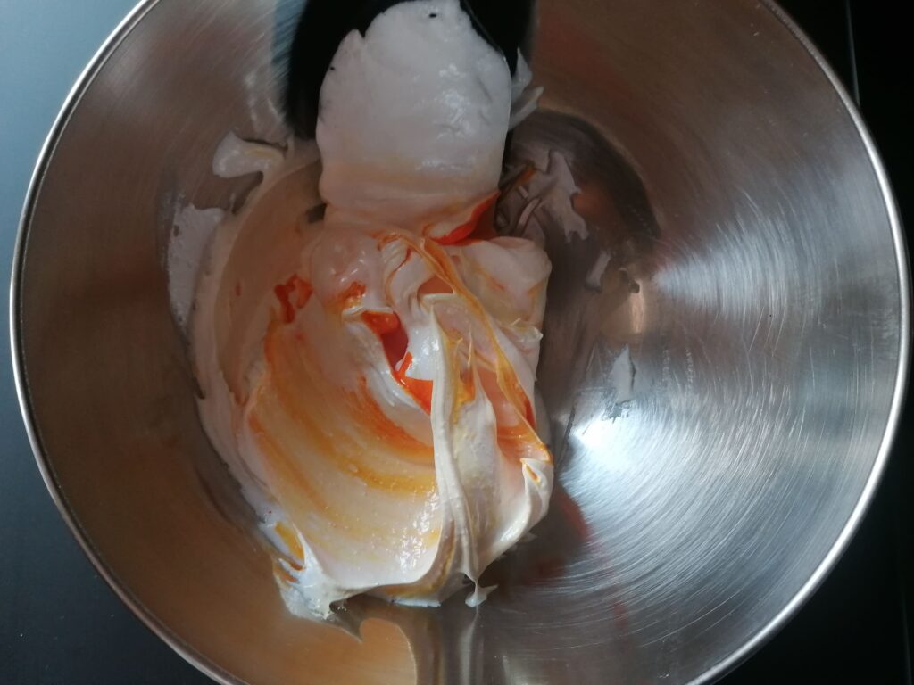- utilisation de sa seconde partie en y ajoutant un colorant jaune ananas, sans homogénéiser totalement la pâte, ceci afin de la conserver blanche tout en obtenant des reflets jaunes orangés, plus ou moins prononcés, dans la meringue.