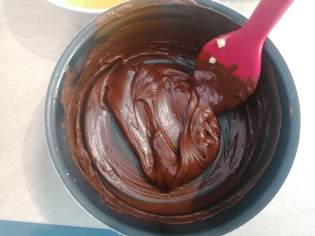 - Une fois le chocolat noir fondu, et redescendu autour des 40°C, incorporer à la spatule le beurre préalablement coupé en morceaux, ce qui apportera du fondant, puis les jaunes d’œufs mis de côté.