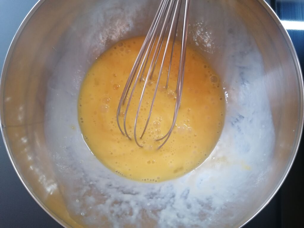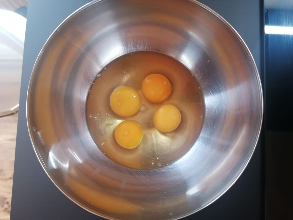 - En parallèle, casser, pour commencer, 4 œufs entiers dans un bol puis les délayer avec un fouet ou, à défaut, une fourchette afin que les jaunes soient bien incorporés aux blancs, pour pouvoir les ajouter de manière homogène dans la pâte, sans qu’il n’y est trop de blancs ou trop de jaunes qui y tombent à l’excès.