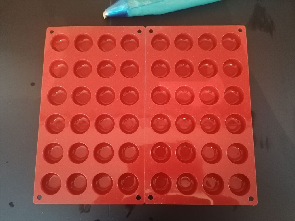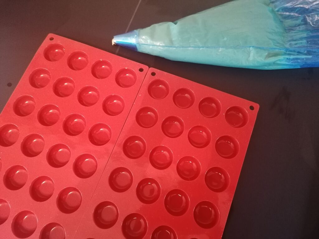 - récupérer des moules silicones avec des empreintes demi-sphères ou dits « pomponnettes » d’environ 3 à 3,5 cm de diamètre. Ici, ce sont des moules « pomponnettes », donc munis de demi-sphères mais à fond plat ;