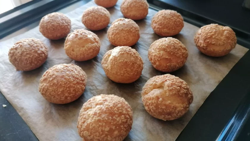 Chouquettes : choux crus d’environ 3 cm de diamètre avec utilisation de la 1ère technique : pâte à choux dressée et cuite sans congélation, avec dorure à l’œuf et sucre en grains