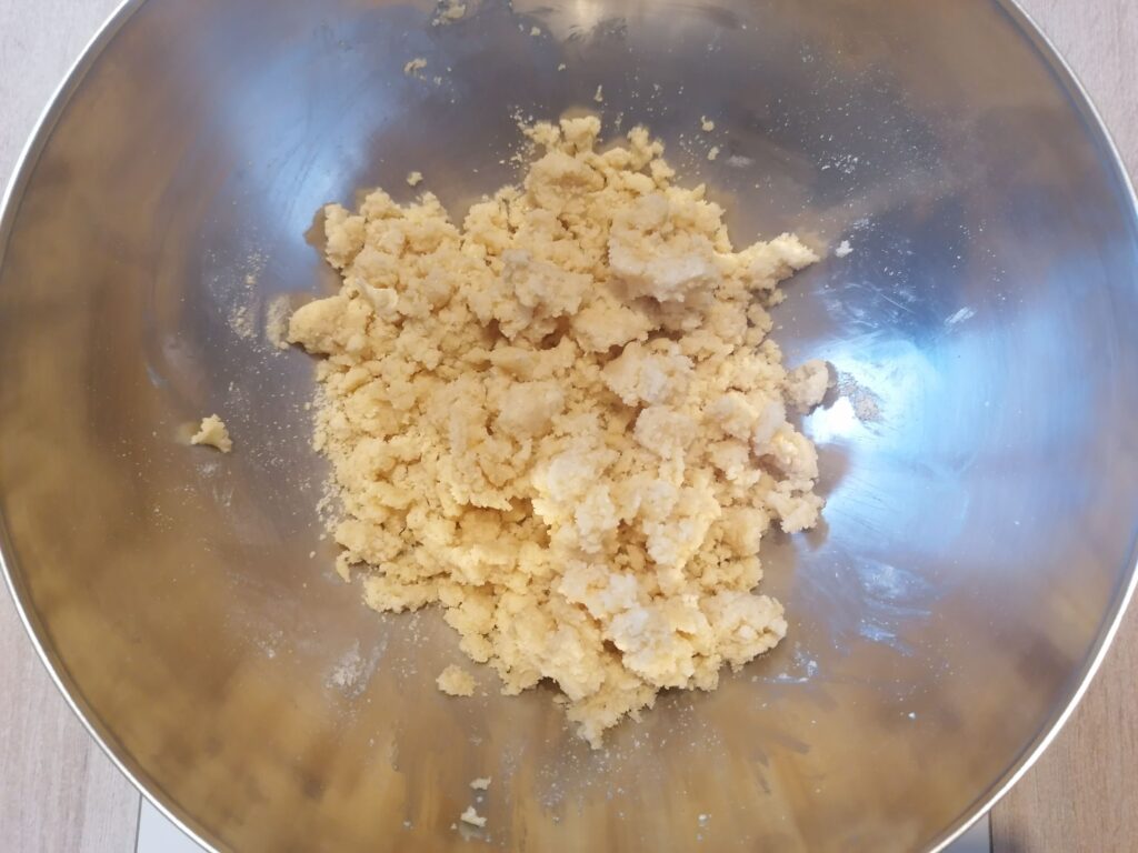 - La pâte, à ce stade et à la fin du mélange, ne se tiendra pas en boule mais s’effritera et sera plutôt friable, texture caractéristique d’un crumble !