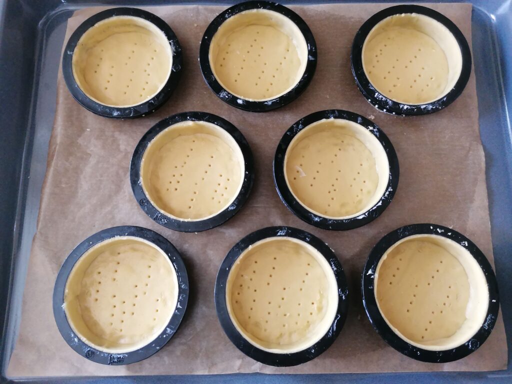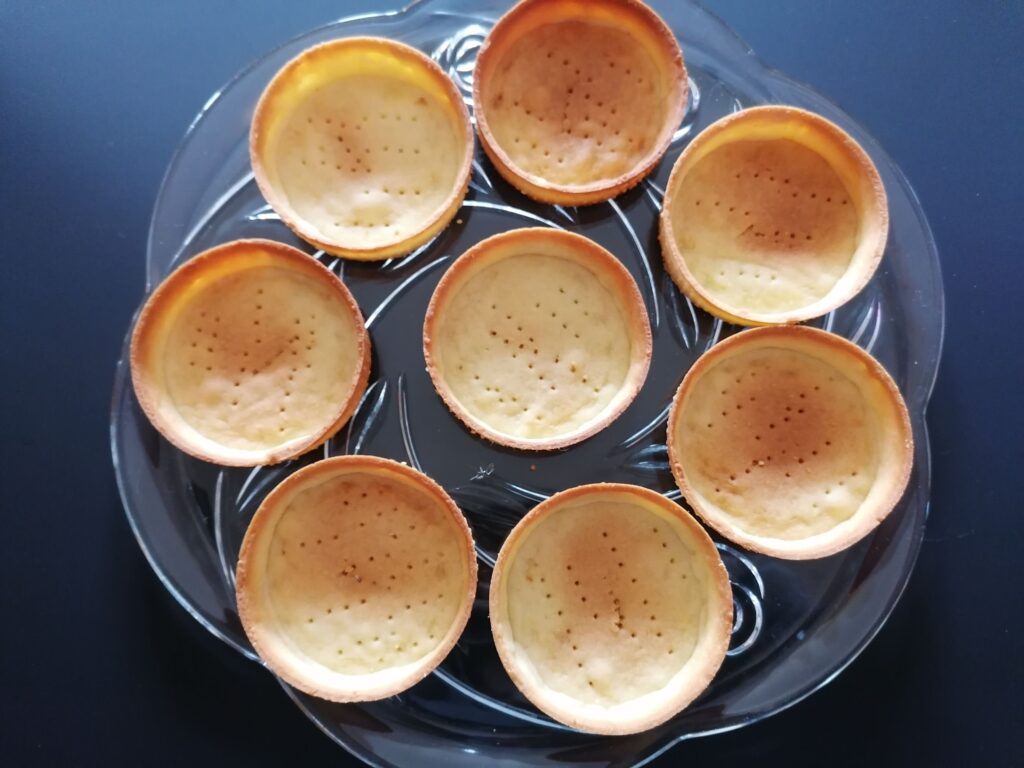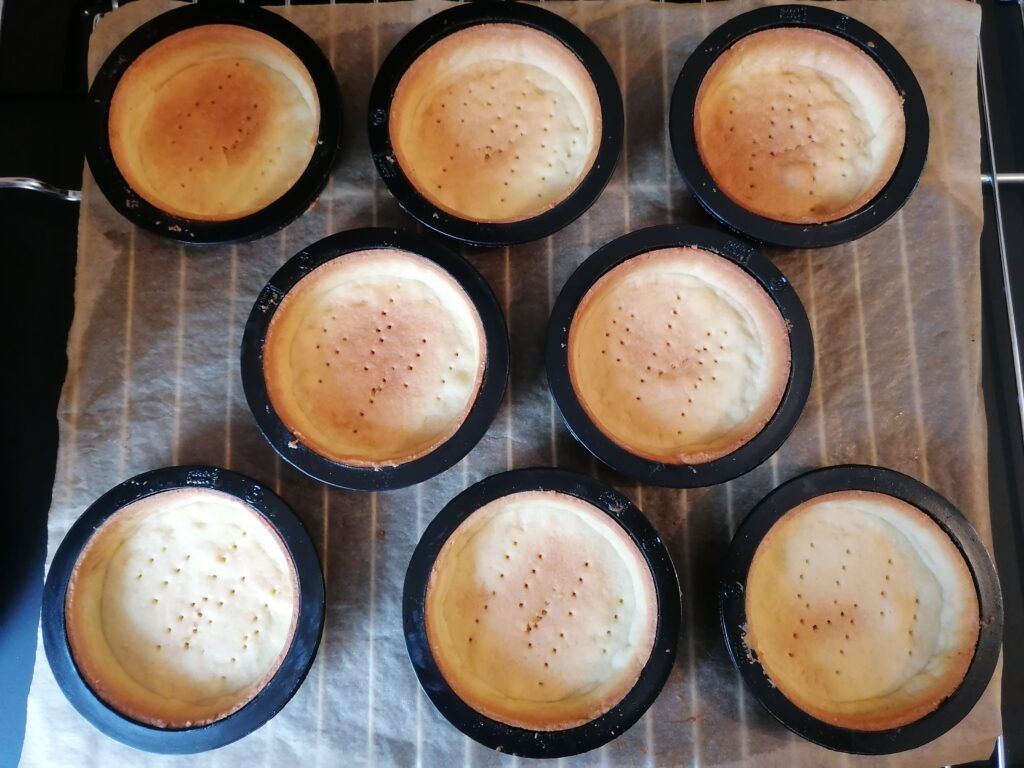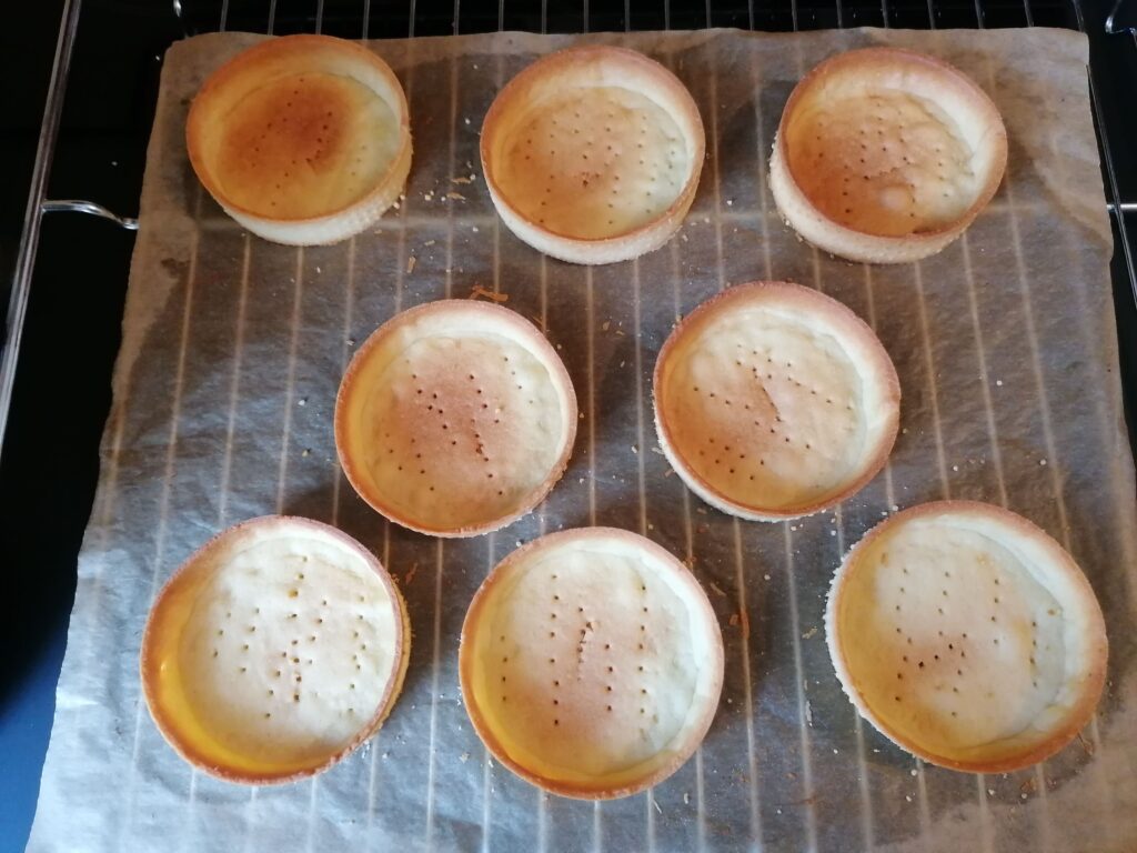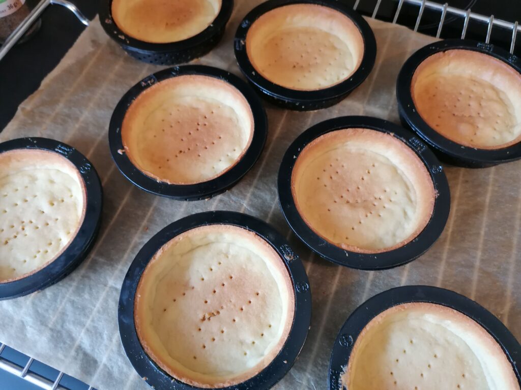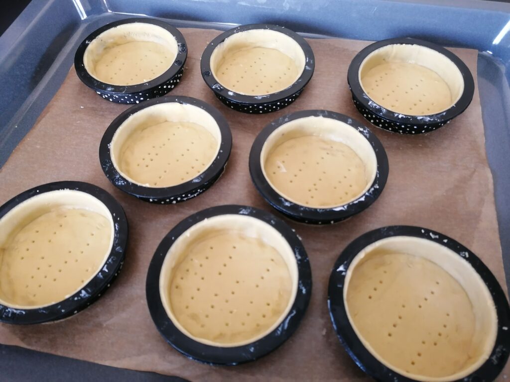 - Réaliser la pâte sucrée telle qu’elle est donnée dans la recette, en utilisant la seconde méthode de fonçage puis en cuisant les tartelettes à blanc.