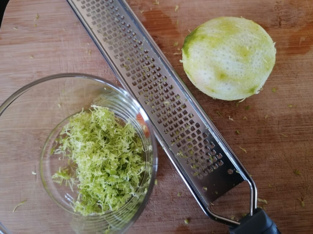 - zestes de citron non traité (ici, citron vert) : 1 p (1 de ceux utilisés pour le jus de la crème citron) (facultatif)