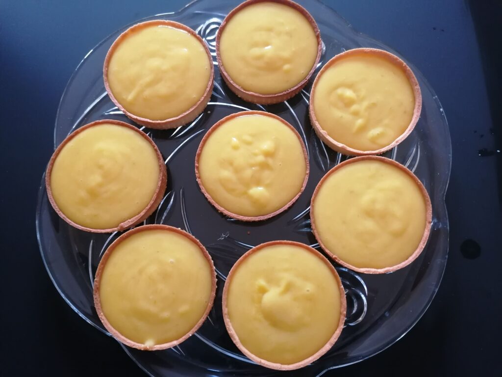 - Garnir de suite, de cette préparation encore chaude, les fonds de tartelettes refroidis jusqu’à hauteur.