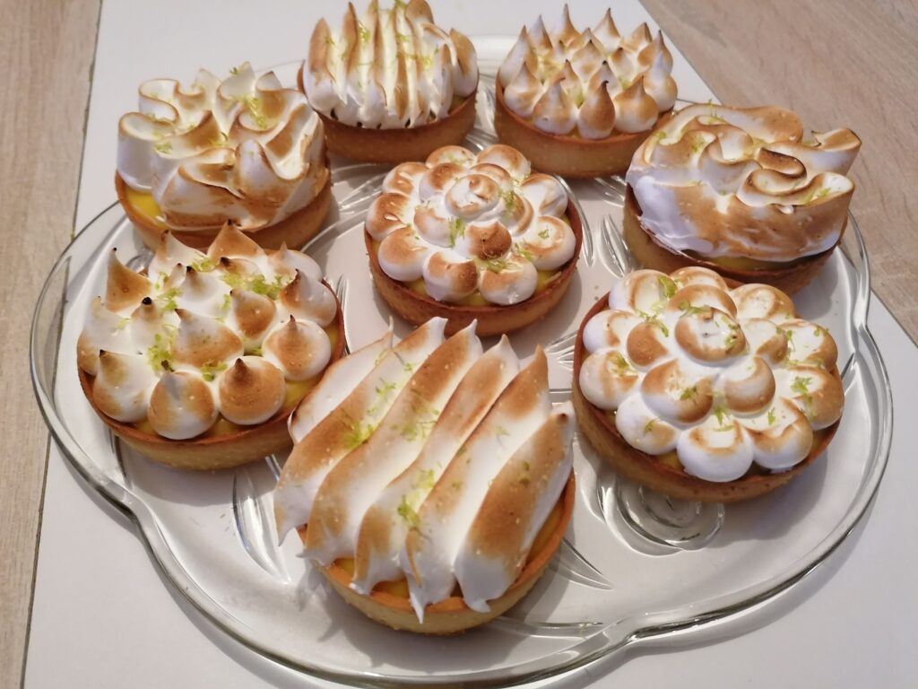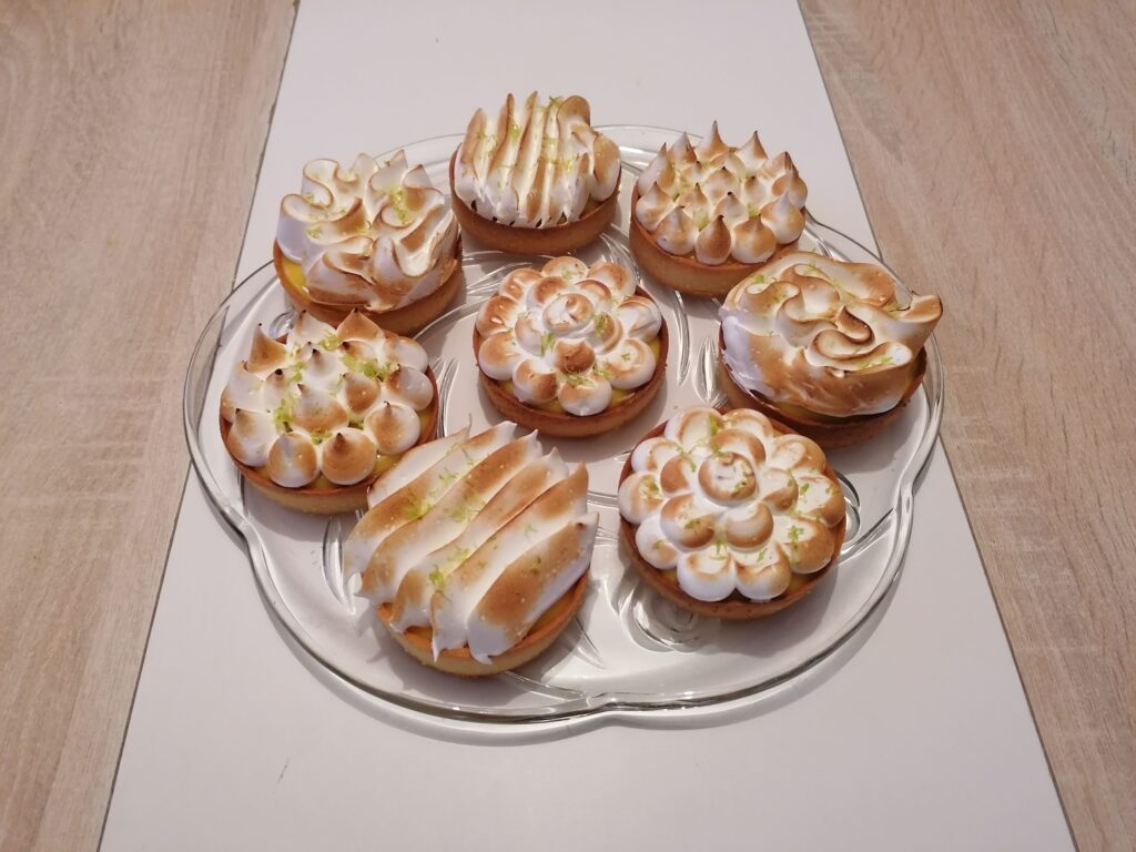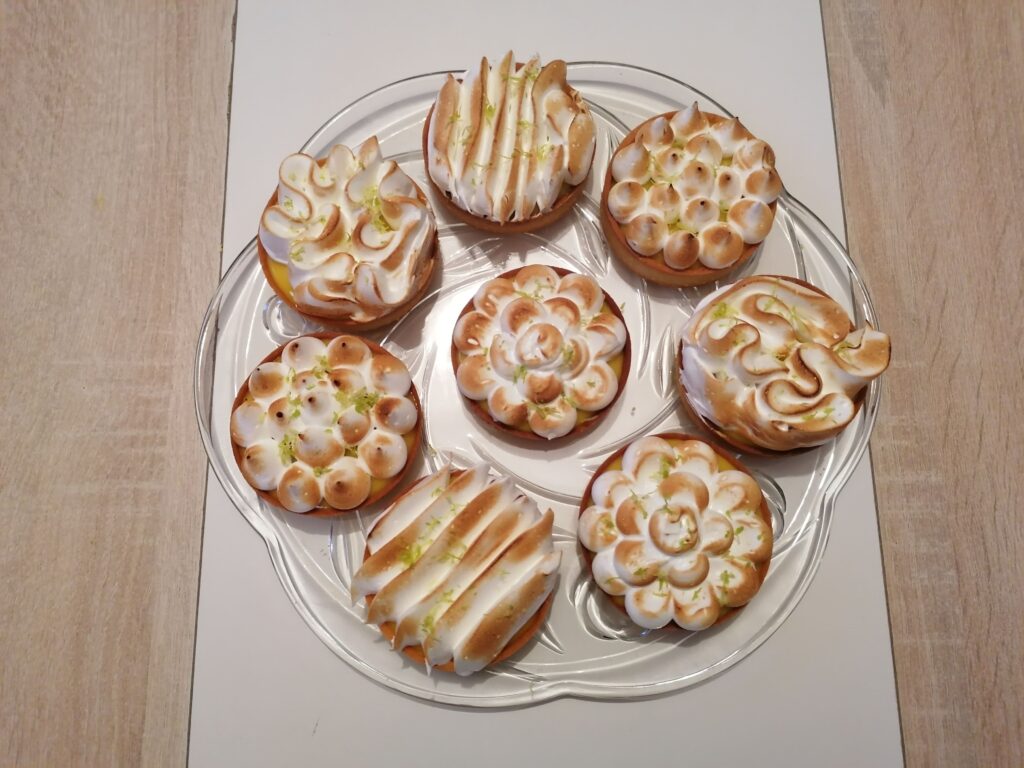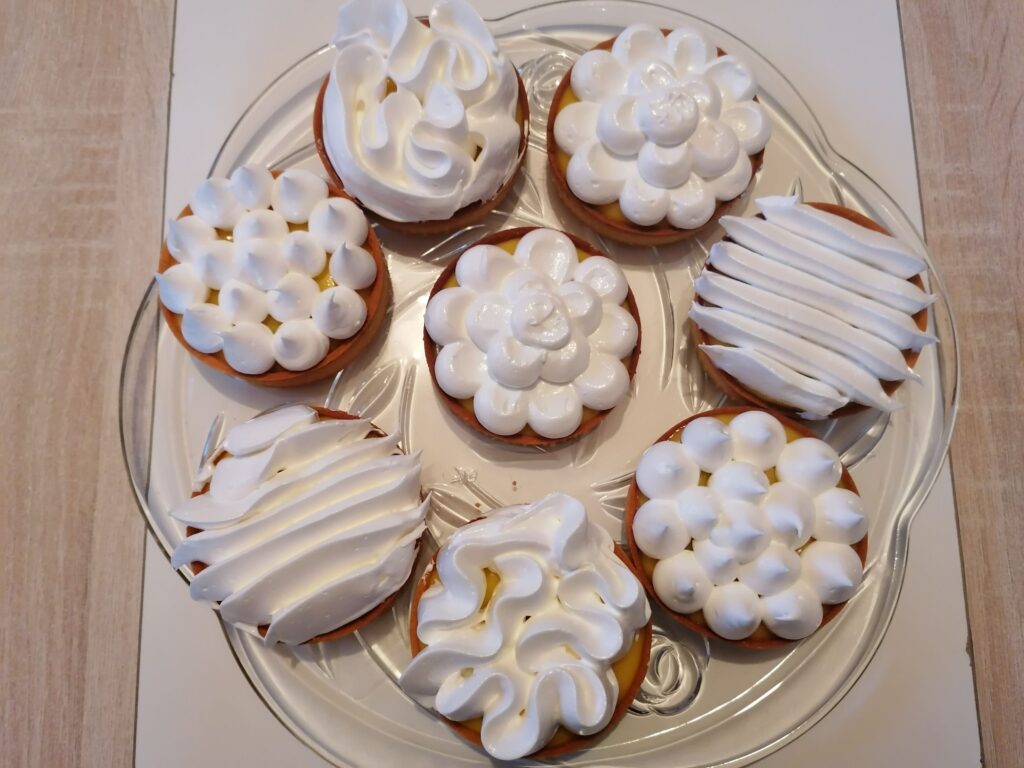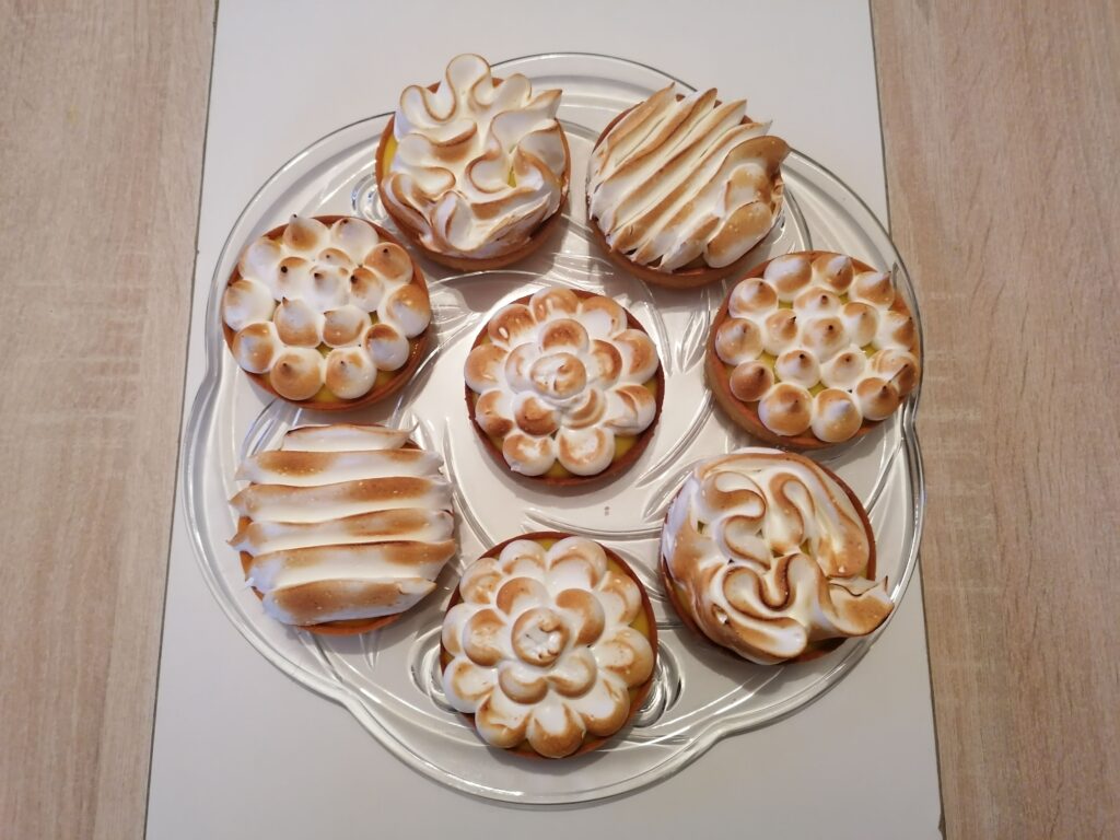 - Récupérer au froid les tartelettes garnies de crème citron puis les décorer en masquant, tout ou en partie, la surface de la crème :