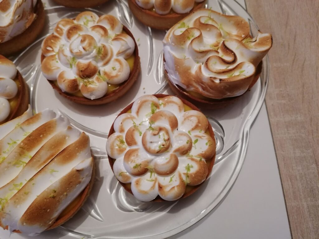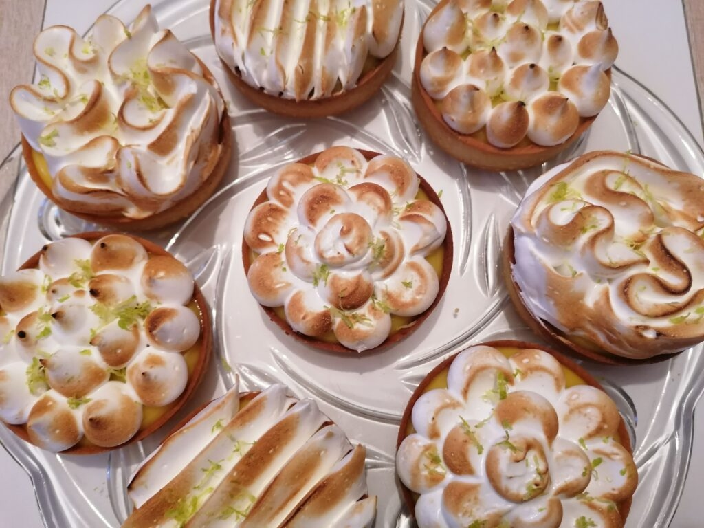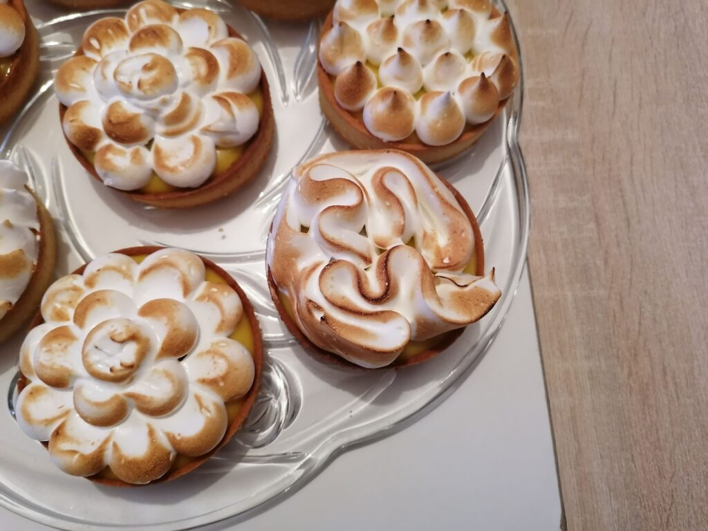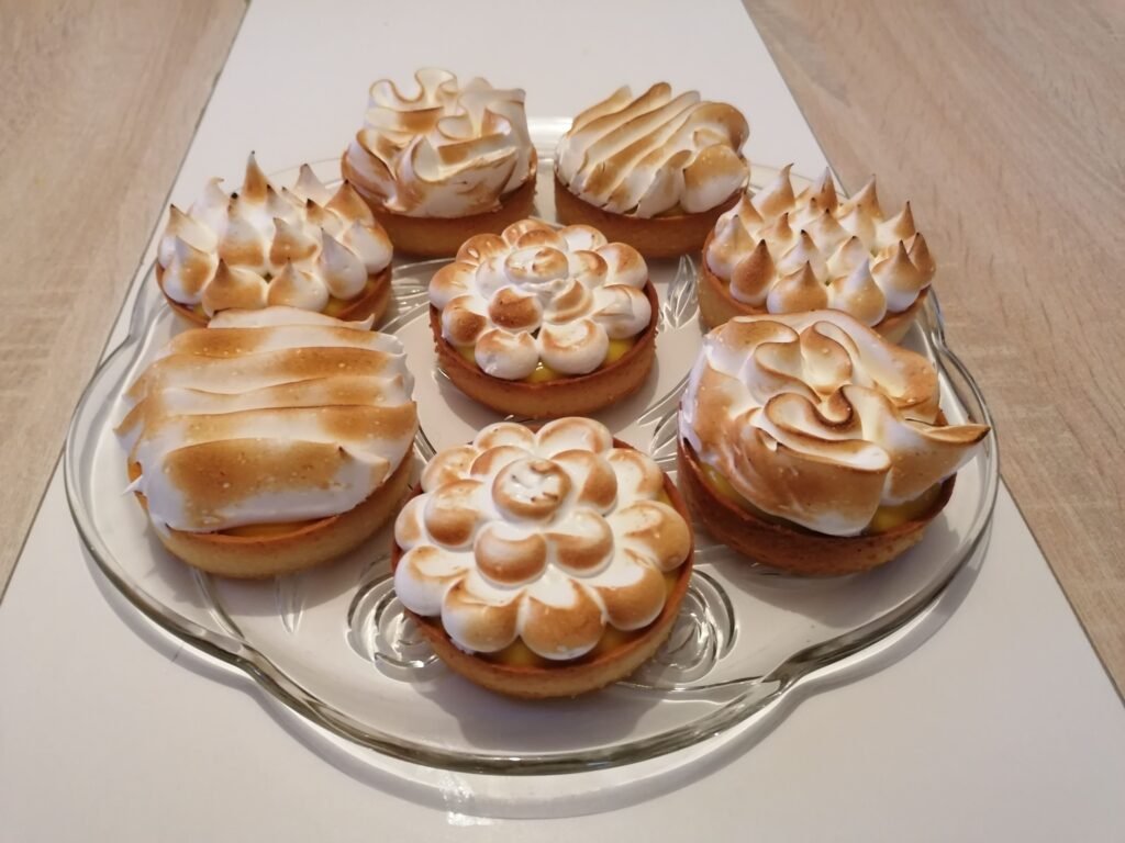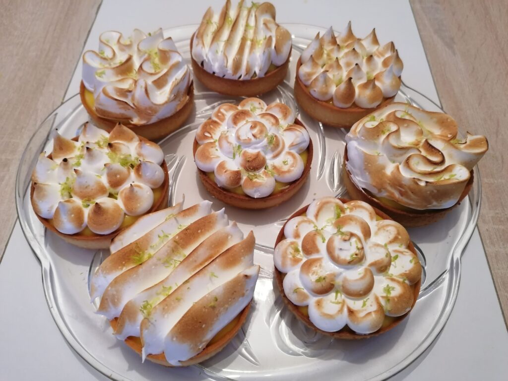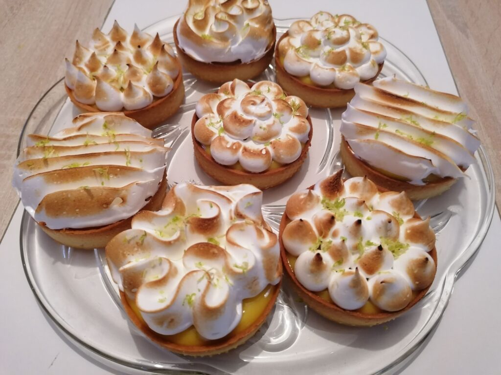 - Récupérer au froid les tartelettes garnies de crème citron puis les décorer en masquant, tout ou en partie, la surface de la crème :
