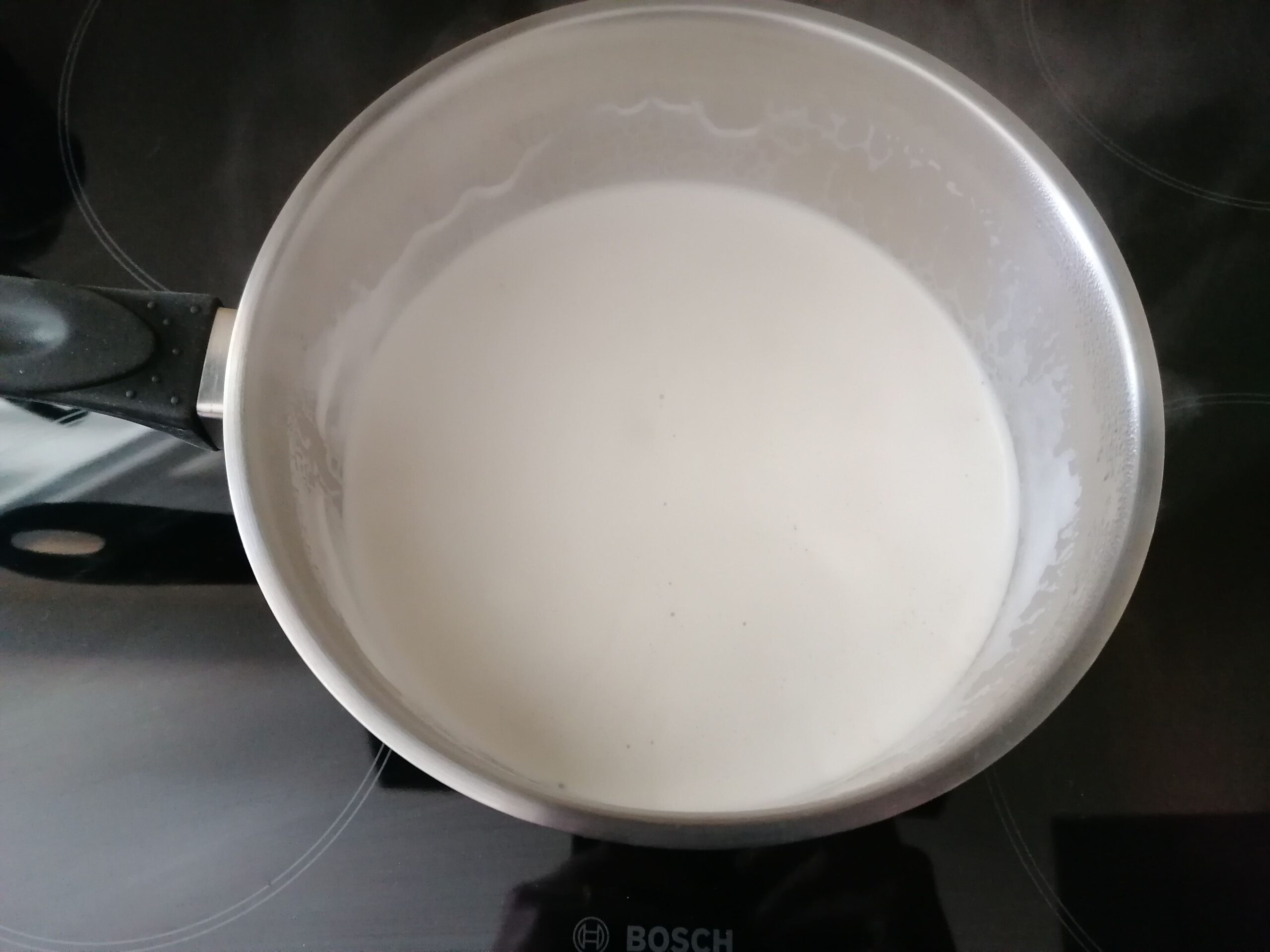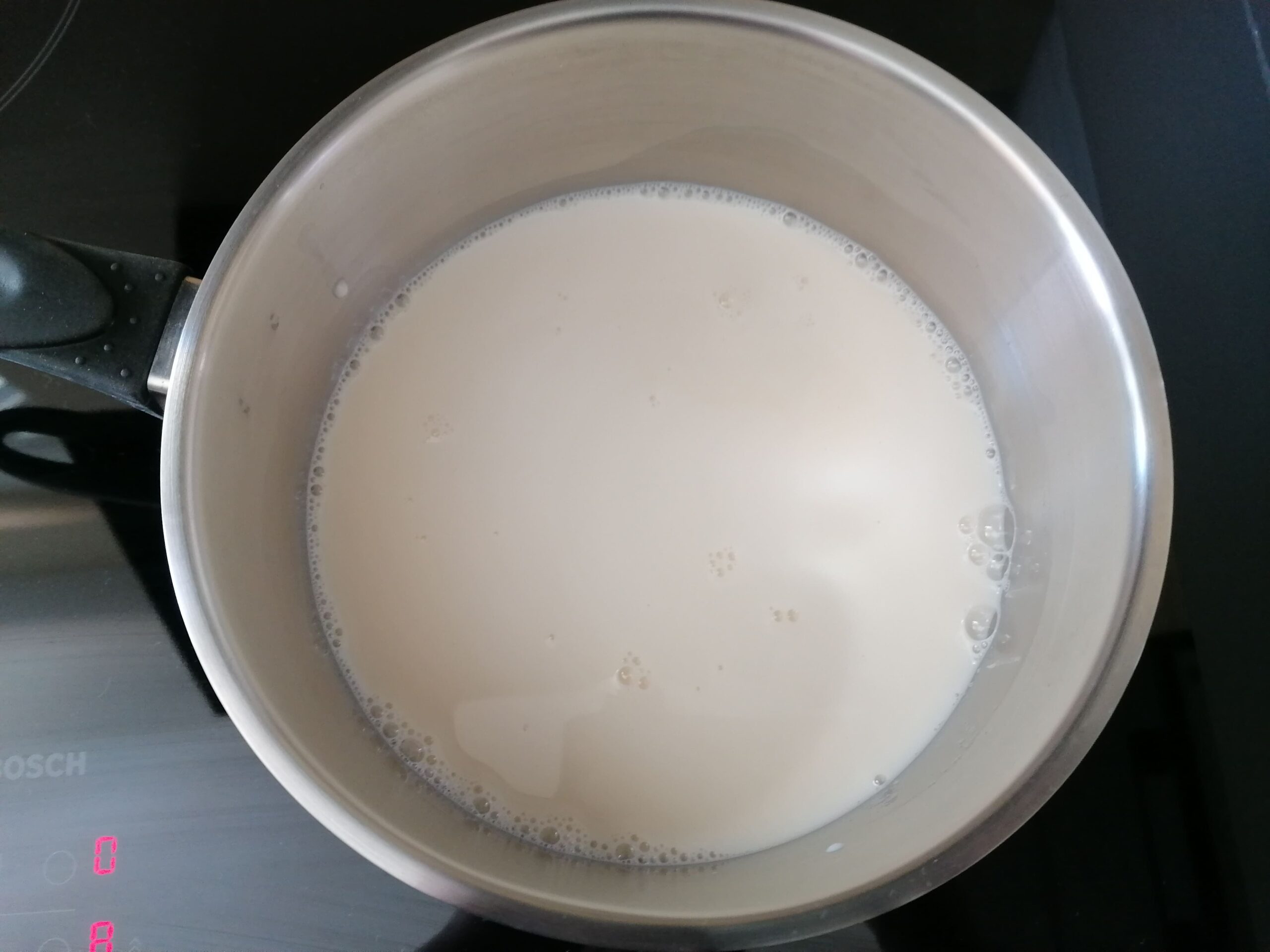 - Dans une casserole, placer le lait entier, les gousses de vanille, fendues dans le sens de la longueur et grattées au couteau d’office, et/ou un autre arôme liquide ou en pâte, avec les 53g de sucre semoule, puis chauffer jusqu’à frémissement.