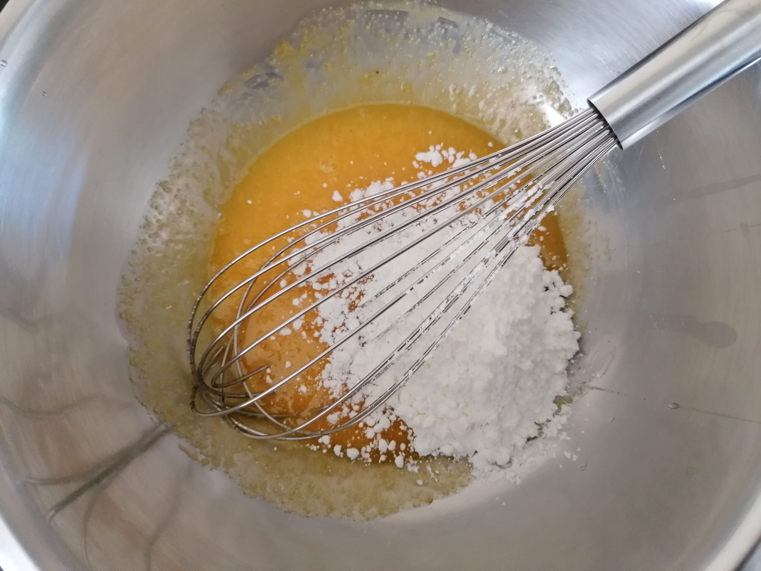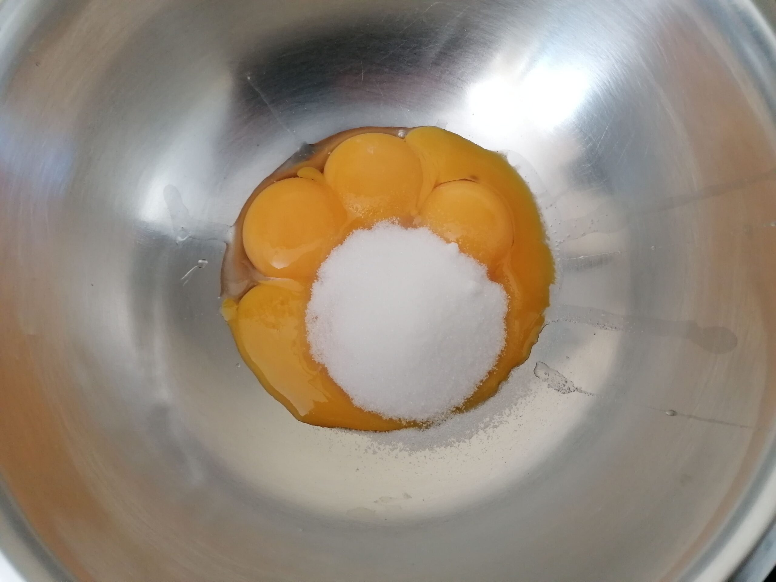 - En parallèle, mélanger au fouet les jaunes d’œufs avec les 54g de sucre restants, sans mousser et blanchir la préparation de peur de voir le flan gonfler de trop à la cuisson, puis incorporer la poudre à crème toujours au fouet, juste le temps d’homogénéiser le tout.