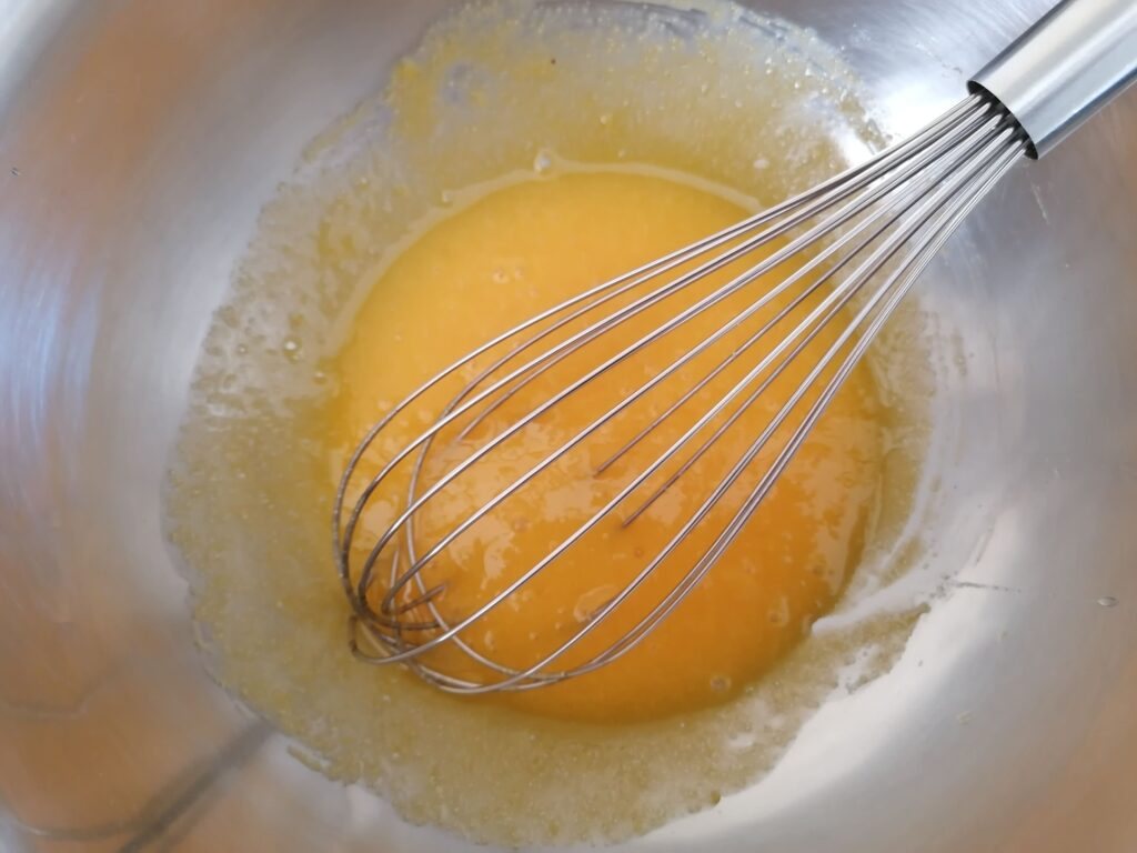 - Une fois le lait bien chaud, retirer les gousses, en verser environ 1/3 dans la préparation aux œufs puis mélanger au fouet.
