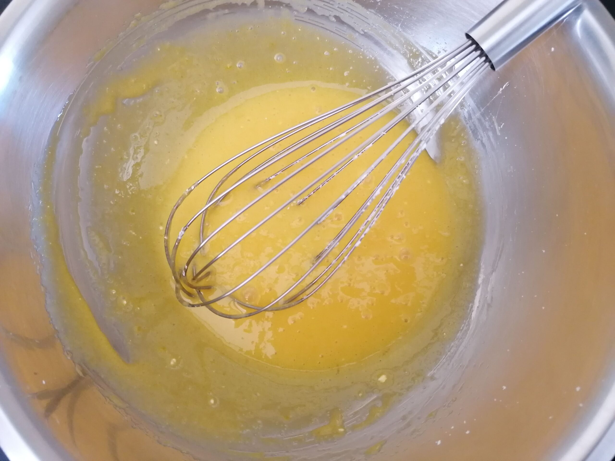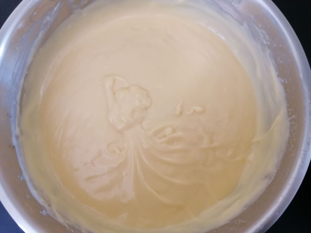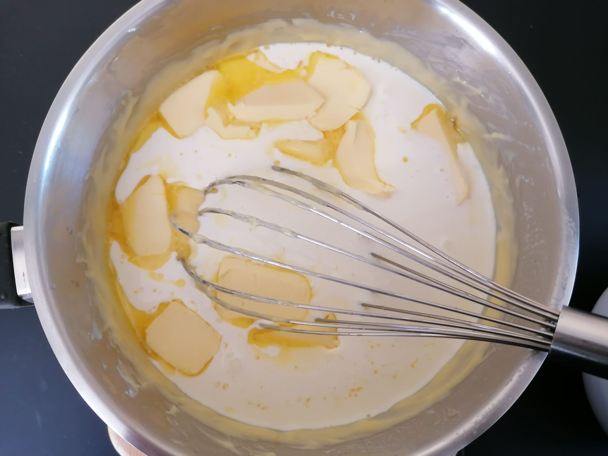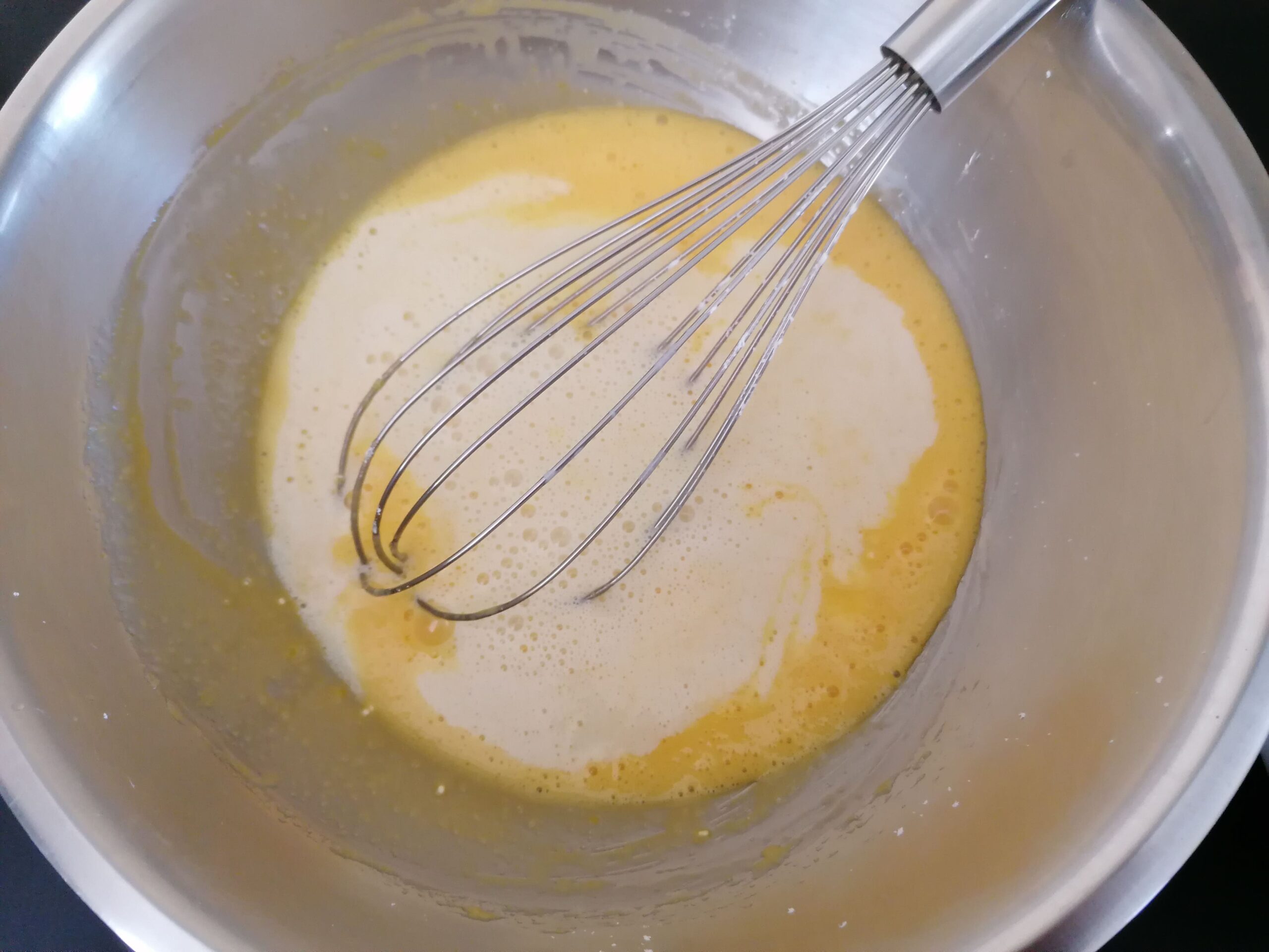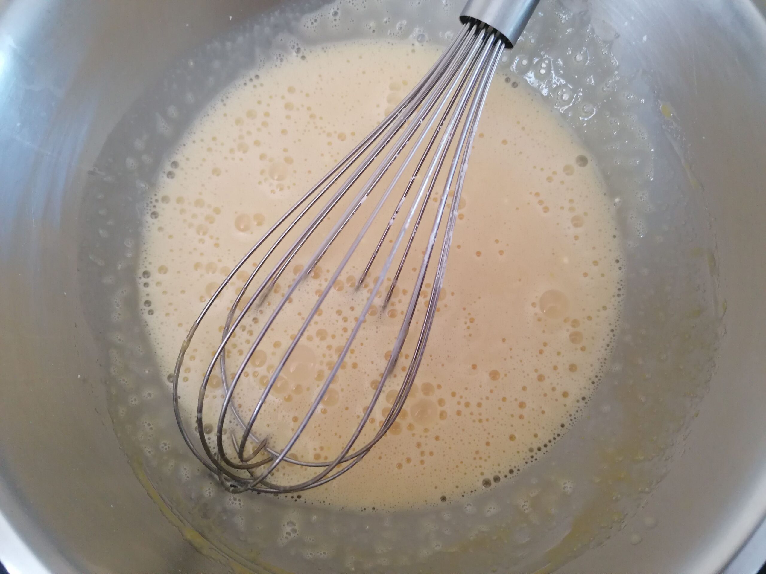 - Tout ceci pourrait au final faire gonfler le flan de manière excessive en cuisson, ce qu’on va chercher à éviter même si le flan gonflera de toute façon : le but est de limiter cet effet !