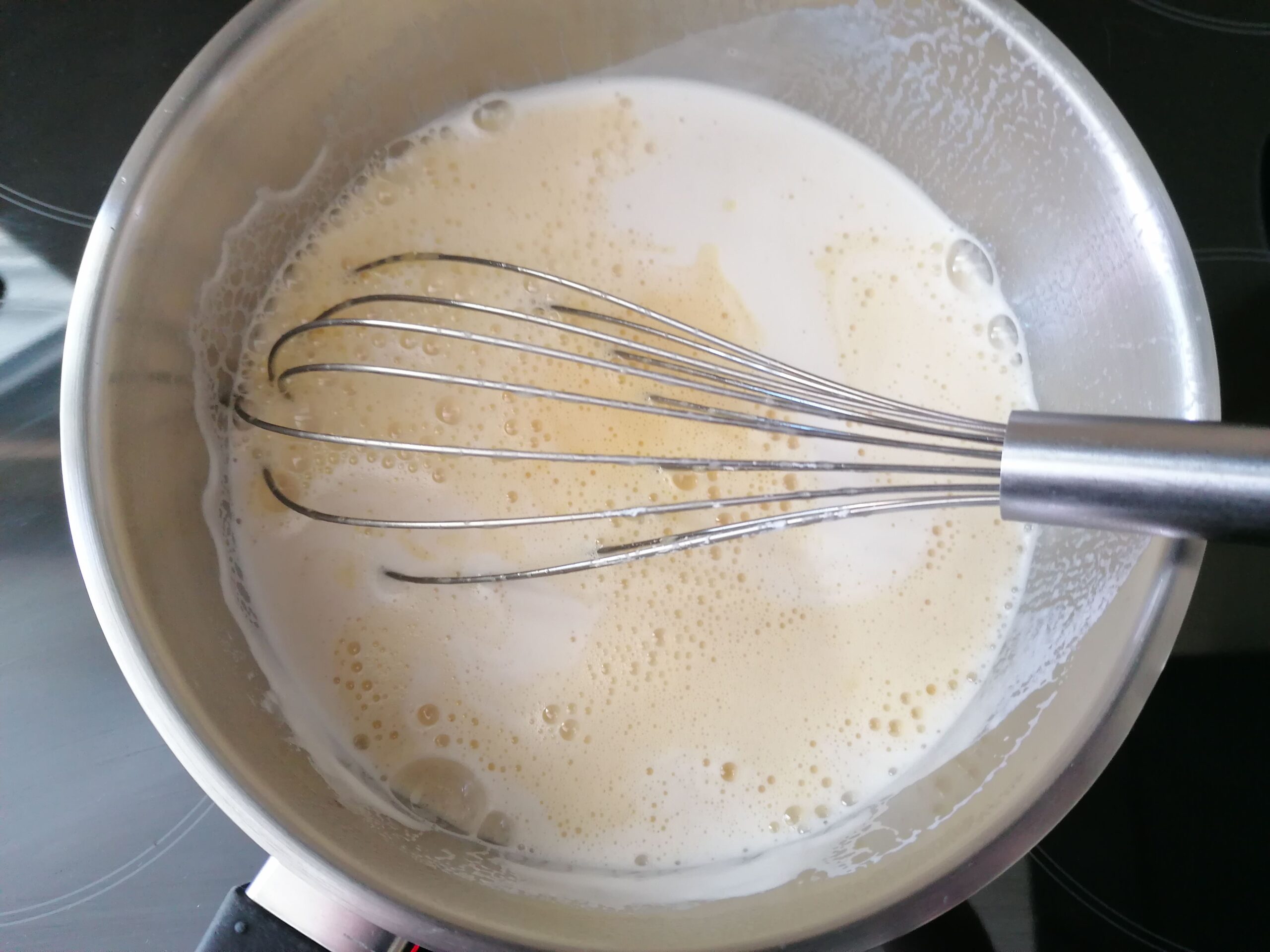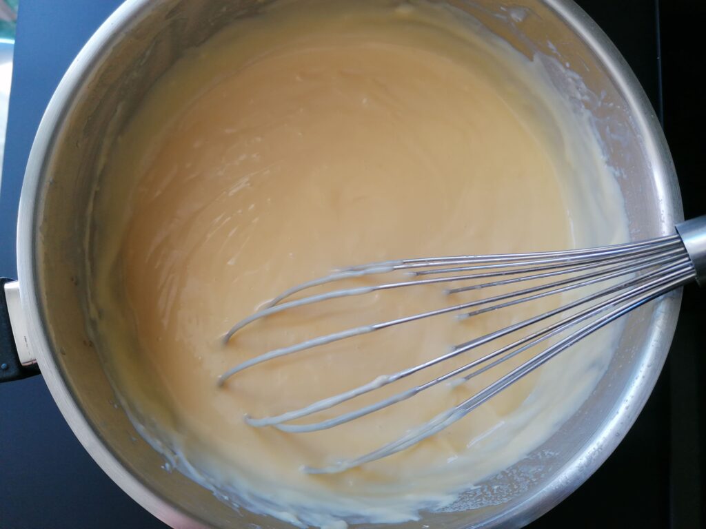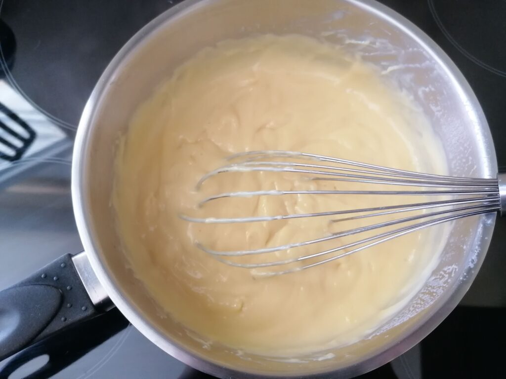 - Transvaser le tout dans la casserole utilisée et contenant le restant du lait, puis remuer, constamment au fouet et sur feu doux afin d’éviter à la préparation d’accrocher au fond de l’ustensile, jusqu’à épaississement de la crème et à la vue du premier « plop » puis poursuivre la cuisson durant 2 min pour une pasteurisation de cette dernière.