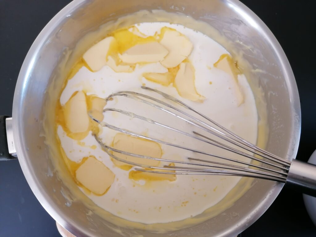 - Retirer du feu et incorporer au fouet la crème liquide entière avec le beurre demi-sel préalablement coupé en morceaux, jusqu’à obtention d’une crème homogène, lisse et onctueuse.