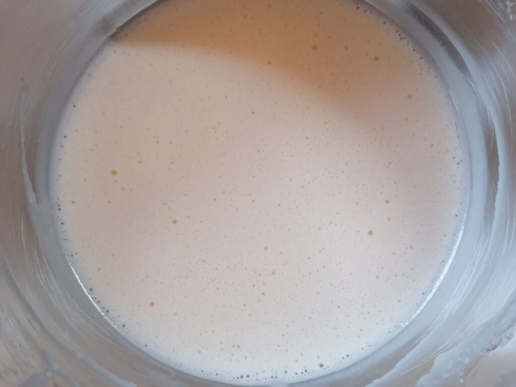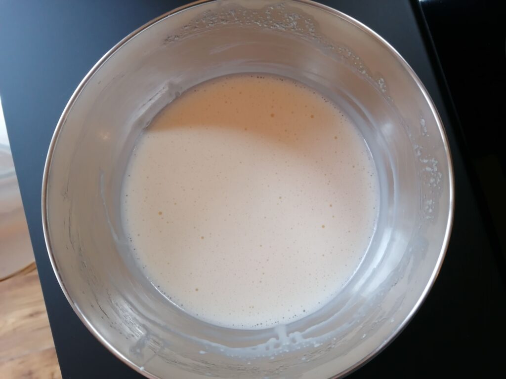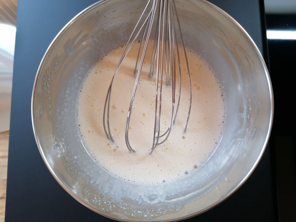 - Ajouter le restant des liquides, soit le lait entier et la crème liquide entière, puis battre, durant quelques secondes au fouet, jusqu’à homogénéisation du tout.