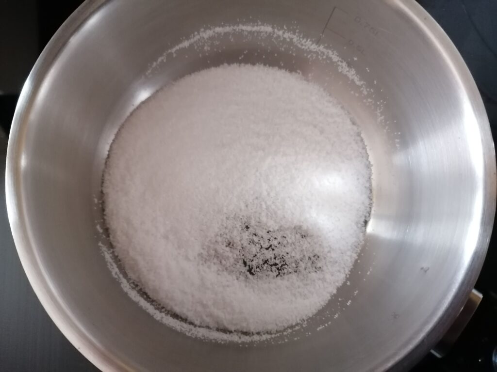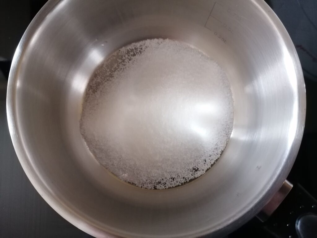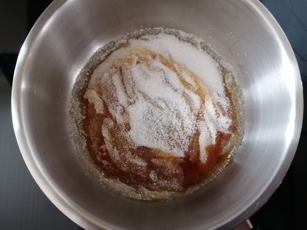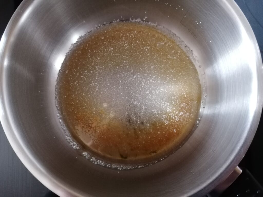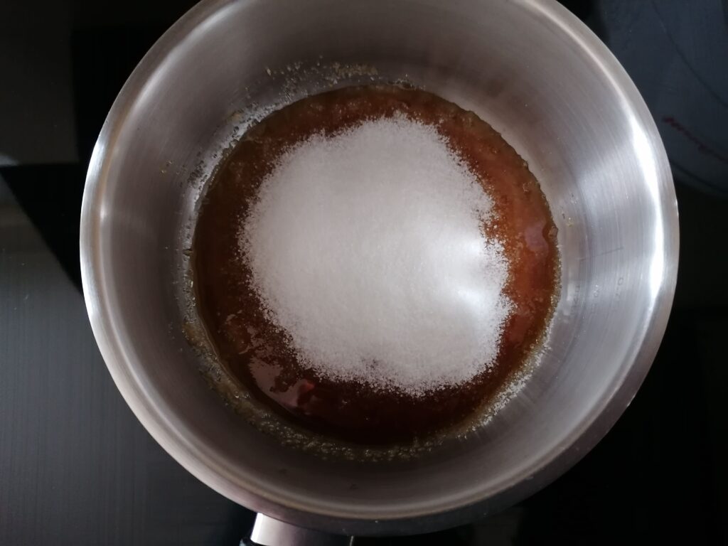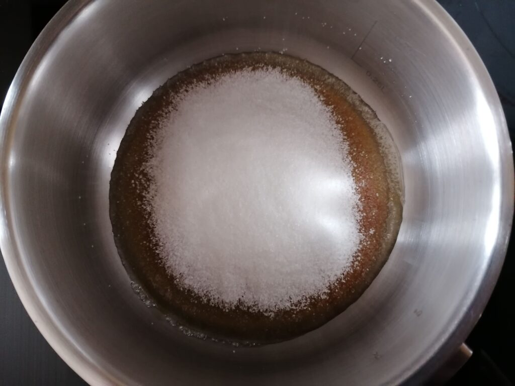 - En parallèle et dans un poêlon à sucre en cuivre qui diffuse mieux la chaleur ou, à défaut, dans une casserole, réaliser un caramel à sec en y chauffant, sur feu moyen, une petite quantité des 200g de sucre semoule jusqu’à se dissoudre, devenir liquide pour enfin prendre une belle couleur ambrée, sans toutefois brûler le caramel et donc en surveillant et en le remuant à la spatule.