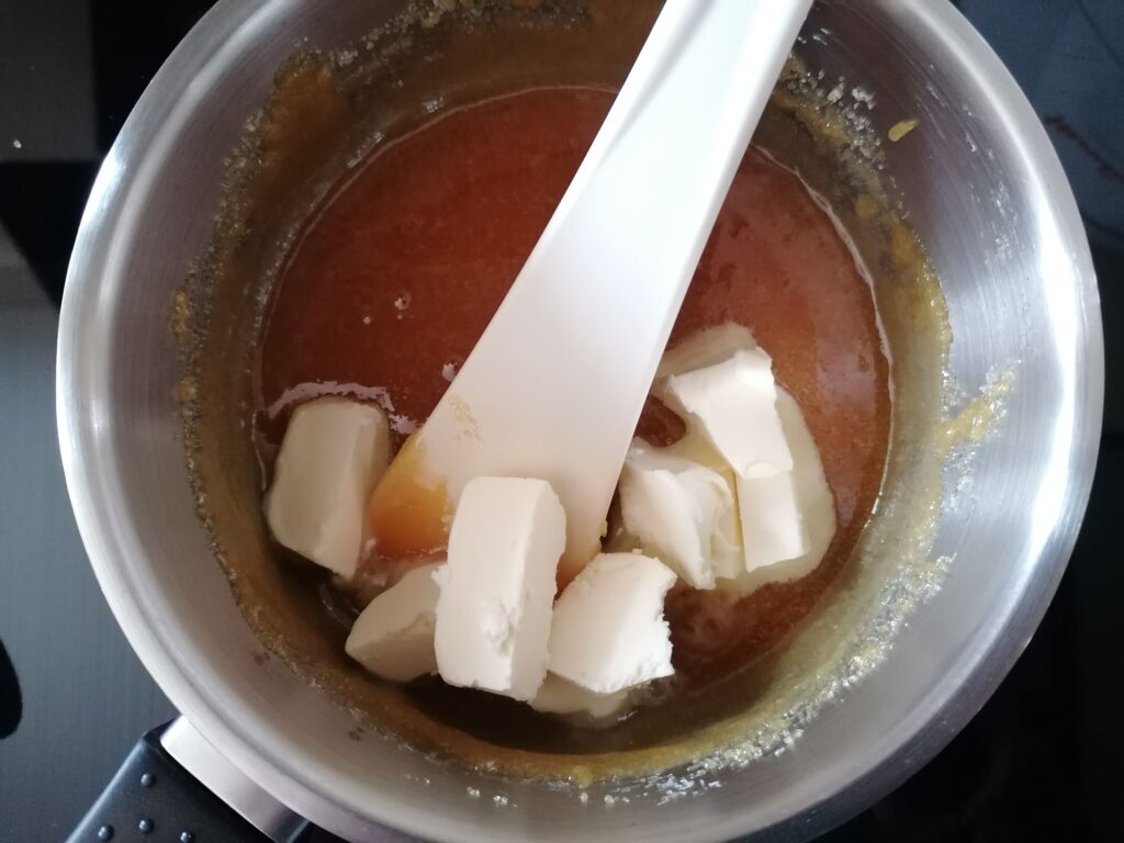 - Toujours sur feu, incorporer à la spatule le beurre demi-sel préalablement coupé en morceaux puis remuer jusqu’à la fonte de ce dernier sans que cela ne soit grave si le beurre n’est pas totalement incorporé au caramel.