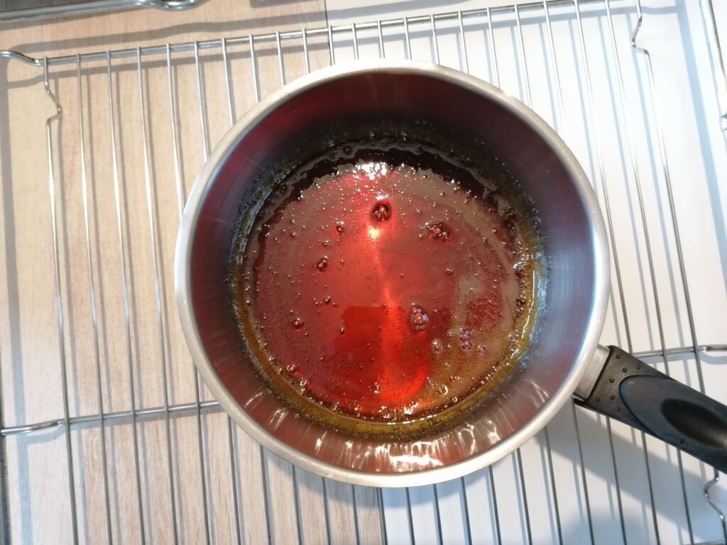 - A chaque fois que cela arrivera, ne pas hésiter à replacer la casserole le contenant sur feu modéré afin de le liquéfier à nouveau mais sans le faire brunir de trop ! : ces chauffes seront assez rapides, obligeant à rester à côté du caramel afin de le surveiller et de le remuer de temps en temps, en effectuant des mouvements toujours légers et circulaires de la casserole, jusqu’à la fonte totale de ce dernier, sans masse restante notamment en son centre !