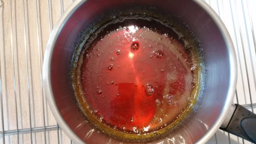 - Au cours de la chauffe, ne pas hésiter à humidifier, autant de fois que nécessaire, un pinceau avant de le passer sur le pourtour de la casserole afin de retirer le sucre qui aurait massé/cristallisé sur les parois de l’ustensile et de le faire tomber dans le sirop pour devenir à nouveau liquide en fondant dans la masse.