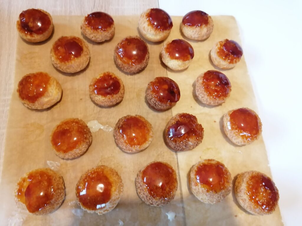 - Utiliser rapidement en glaçant des choux garnis, ou autres pâtisseries, puis, s’il a lieu, en passant au montage avec collage des différentes pièces d’une pièce montée, ou autres pâtisseries, ….