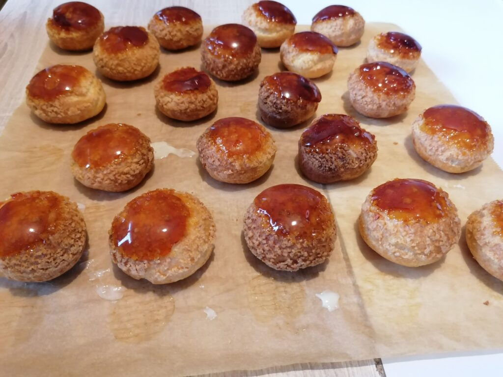 - en glaçage pour choux, salambos, pâtisseries à base de choux ou gourmandises sucrées, … ;
