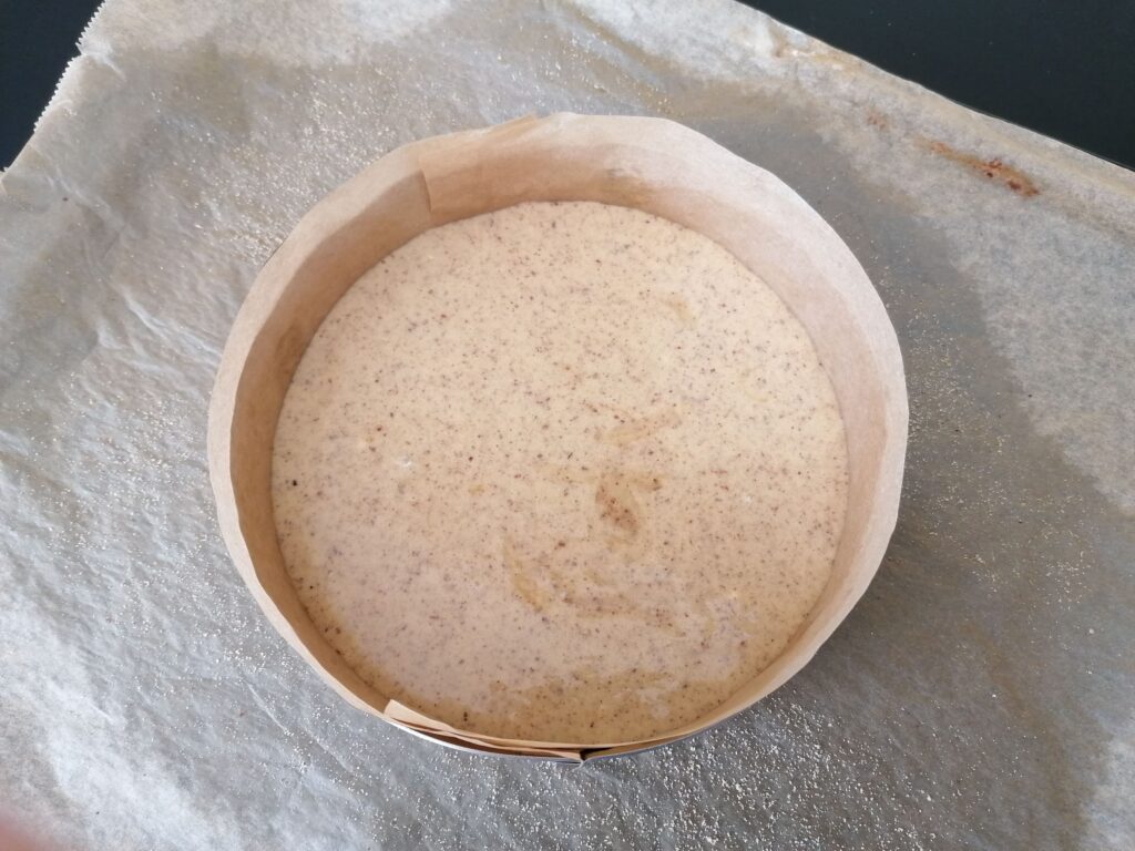 - Verser la pâte à biscuit pain de Gênes dans 1 cercle de 18 cm de diamètre et de 4,5 cm de hauteur minimum, préalablement posé sur une feuille de papier cuisson et chemisé, sur ses côtés, d’une bande de même hauteur, mesurée et découpée dans du papier cuisson, puis lisser, si nécessaire, la pâte à la maryse afin d’obtenir une cuisson uniforme sur un biscuit ayant bien la même épaisseur dans l’ensemble de son disque.