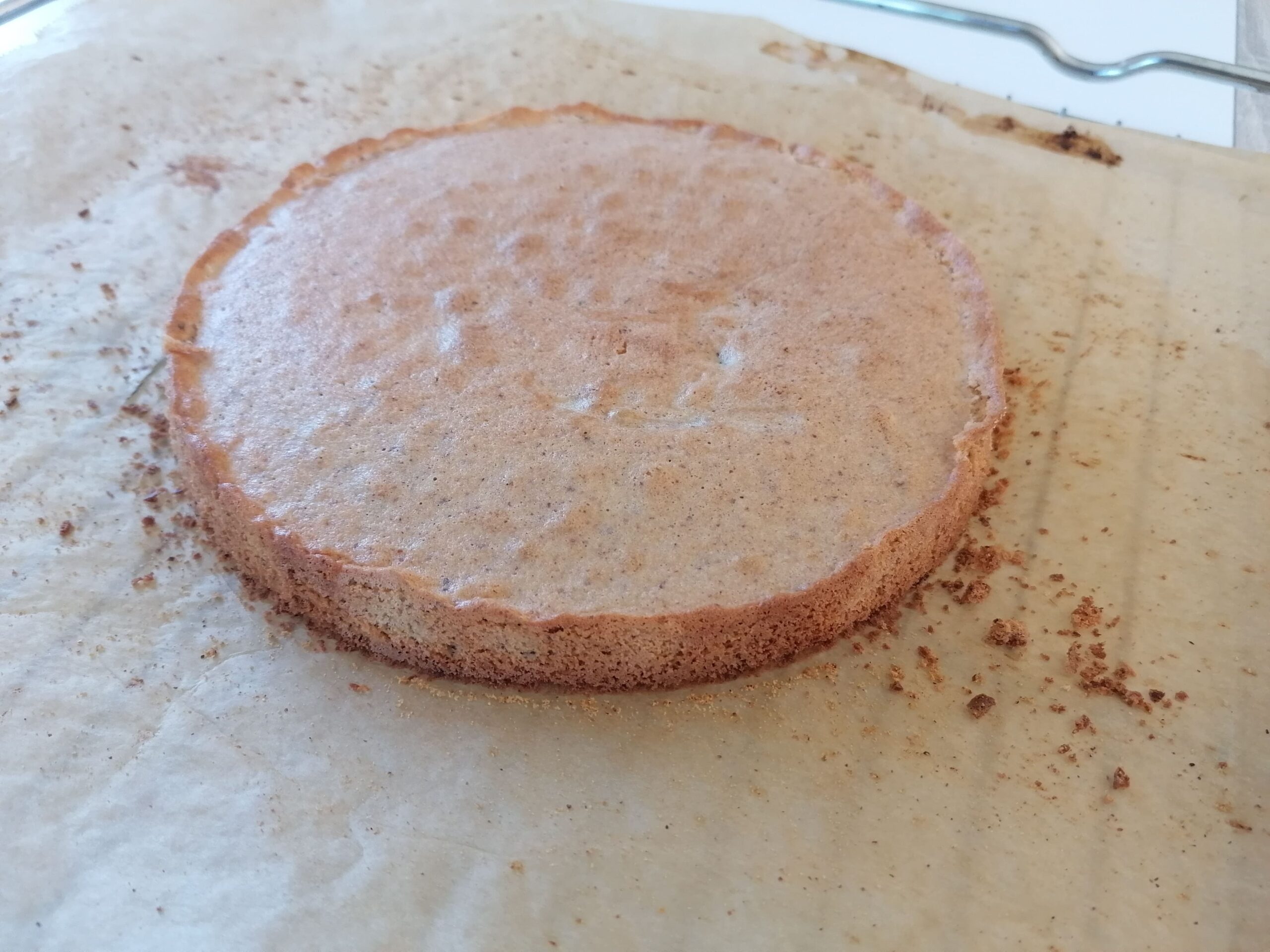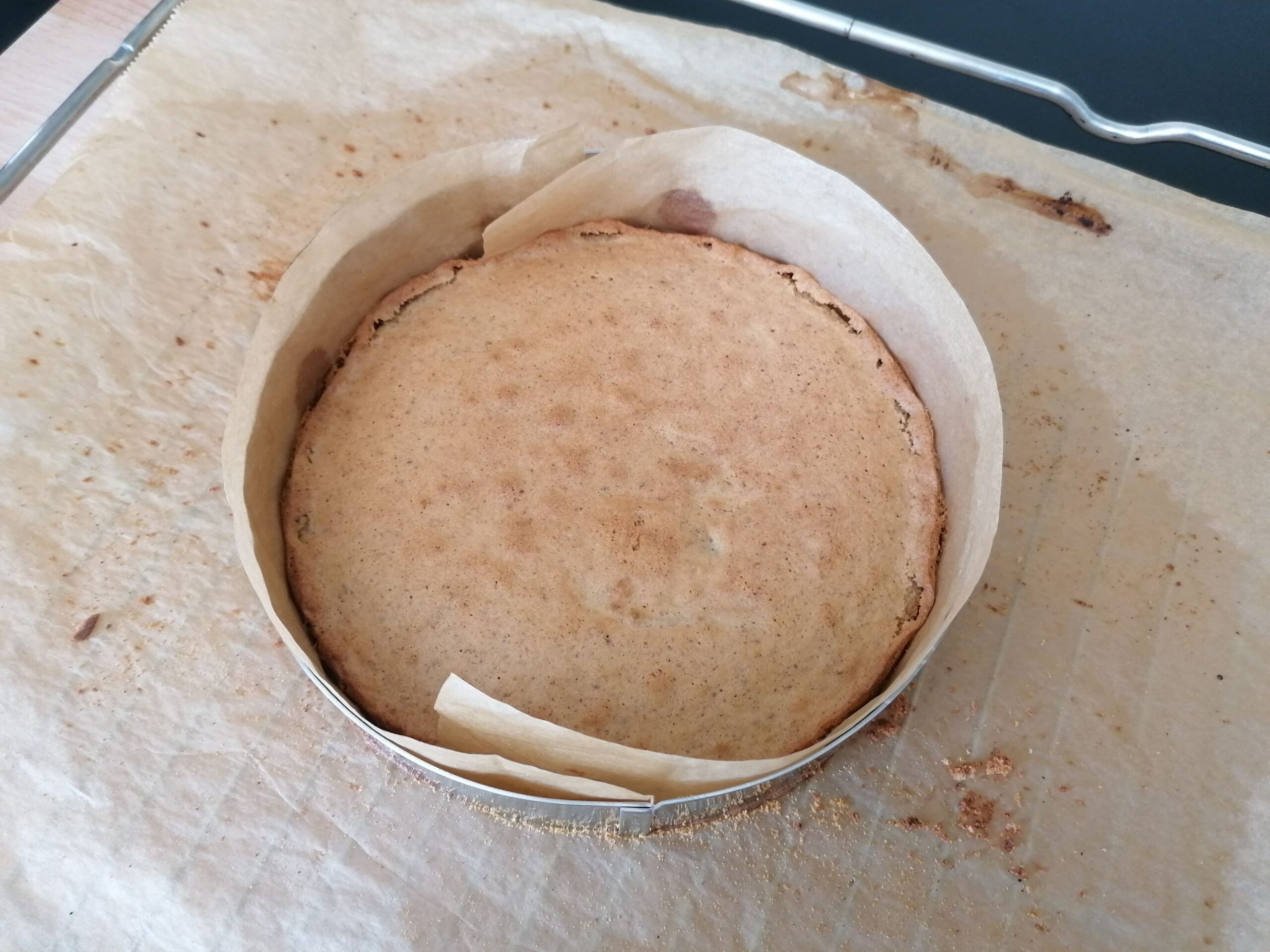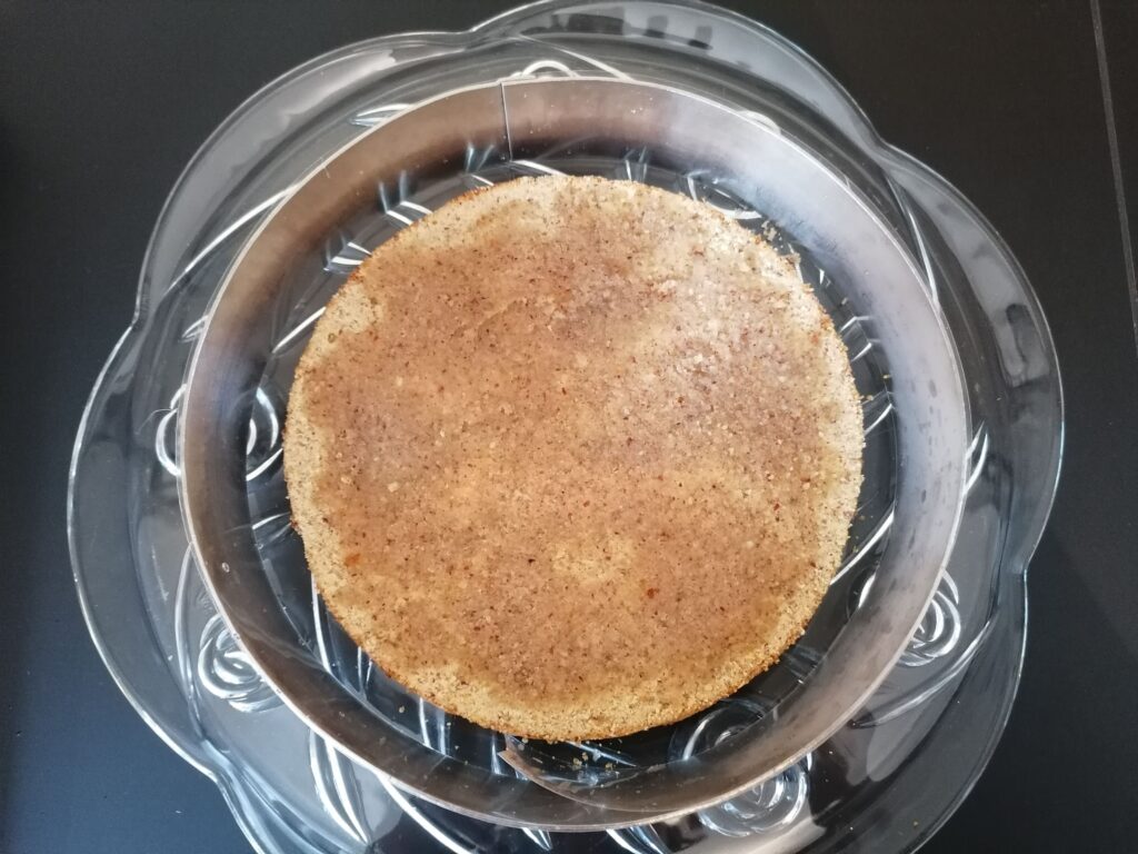 - Défourner et laisser tiédir, sur grille, à température ambiante puis le décercler, lui retirer la bande de papier cuisson restée collée sur son pourtour puis le laisser complétement refroidir toujours à température ambiante.